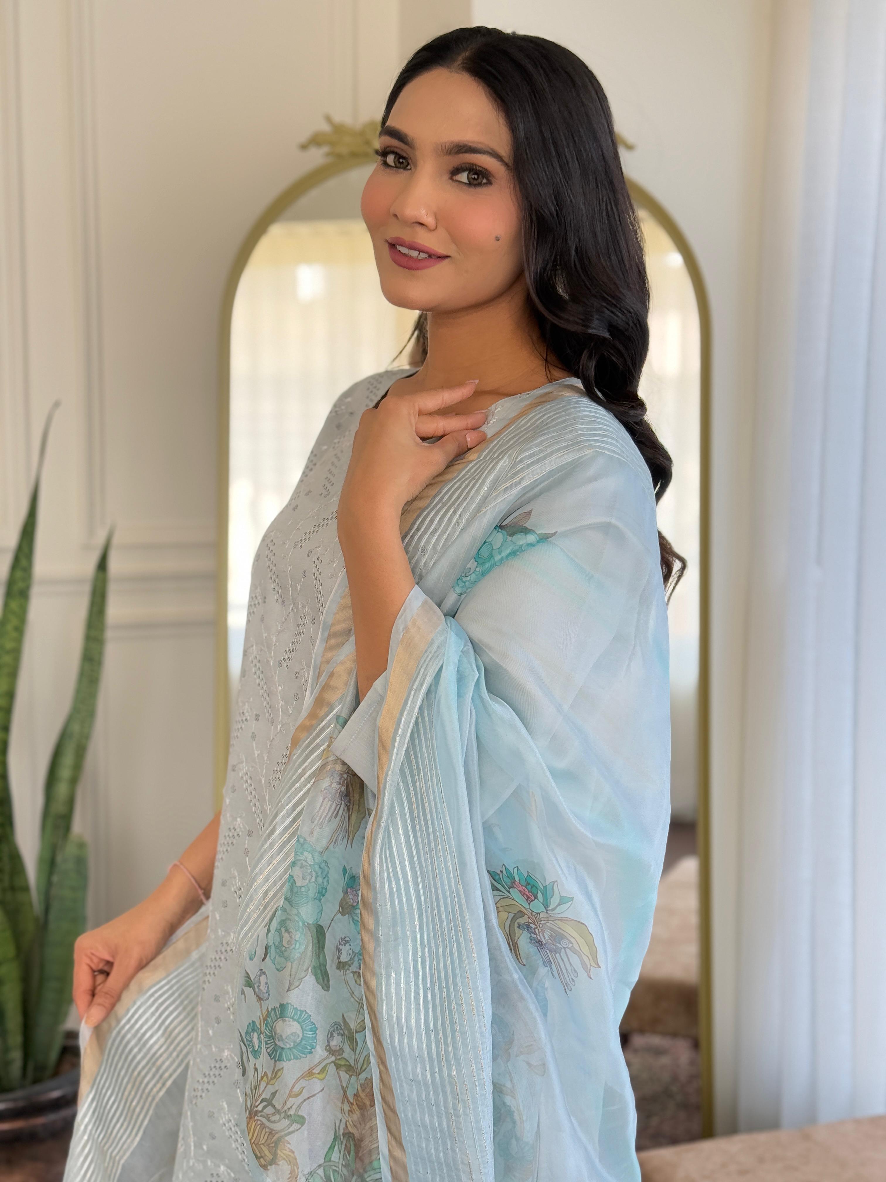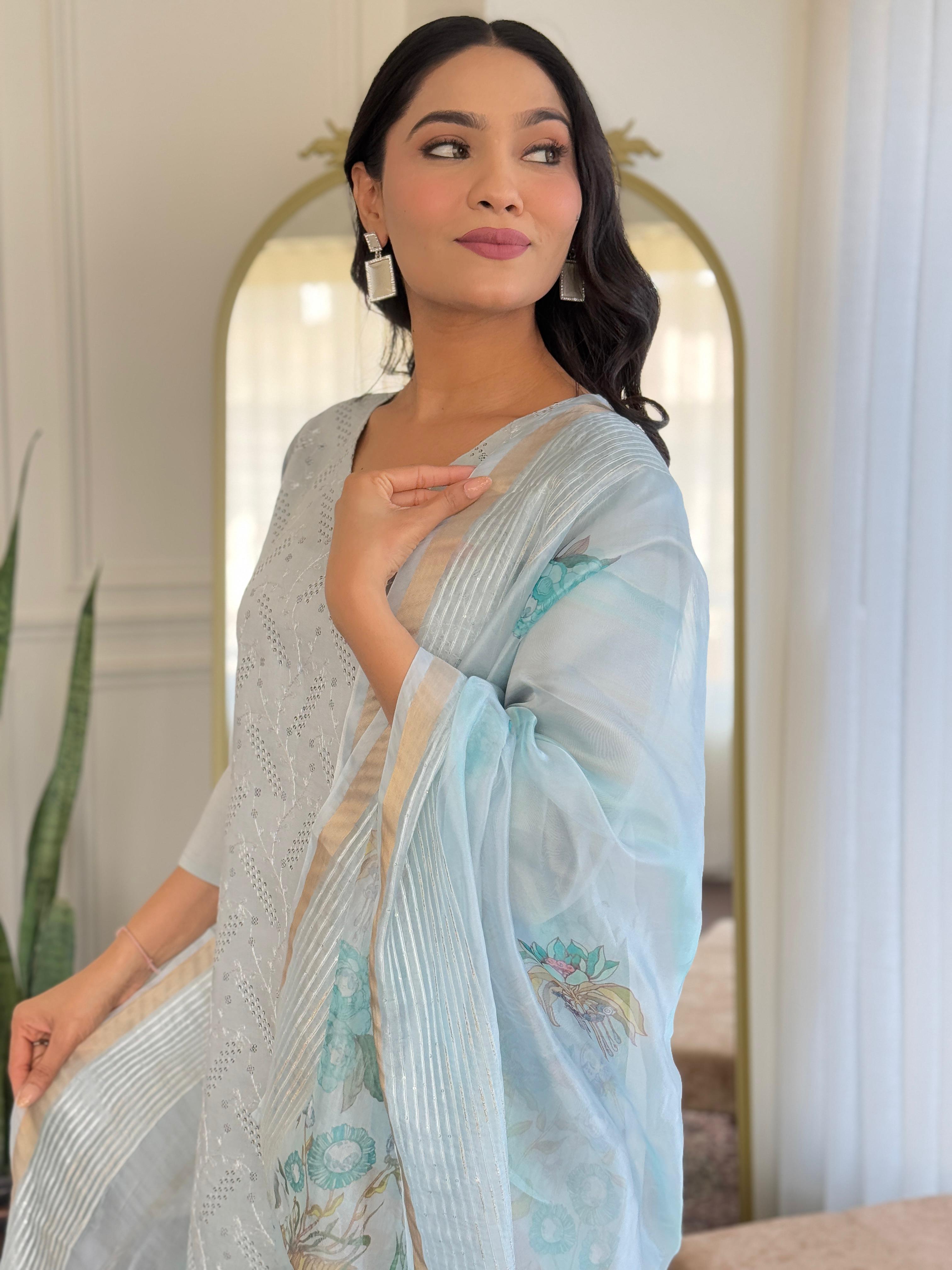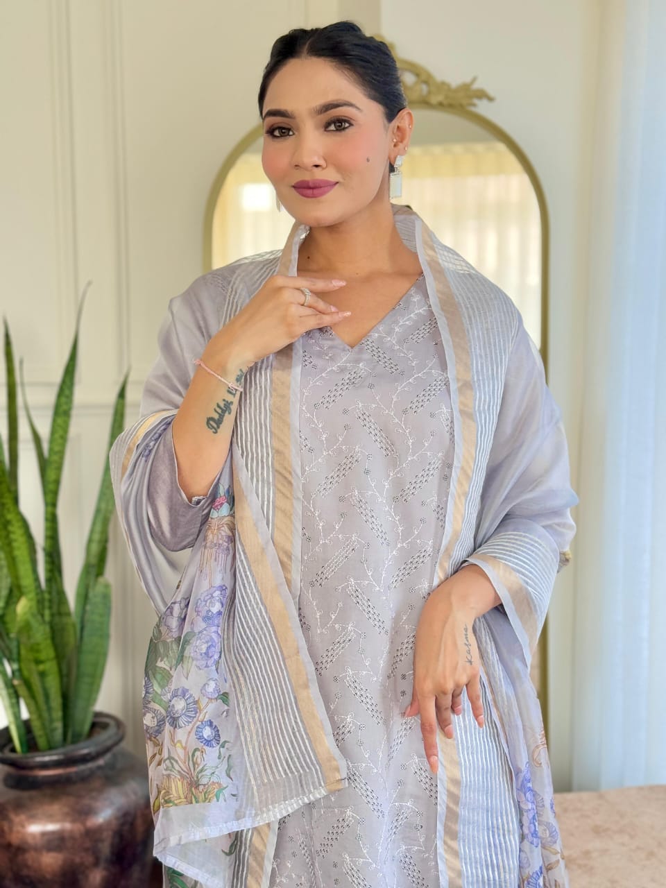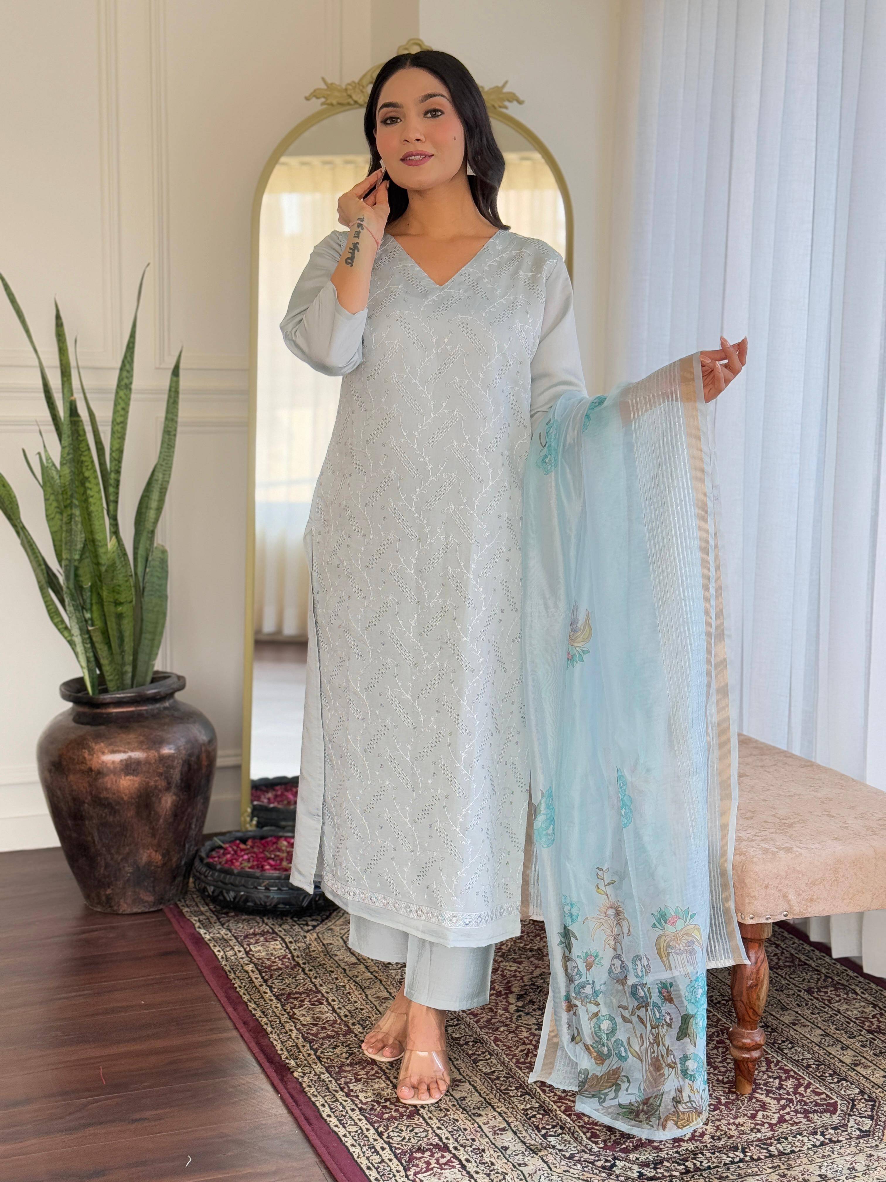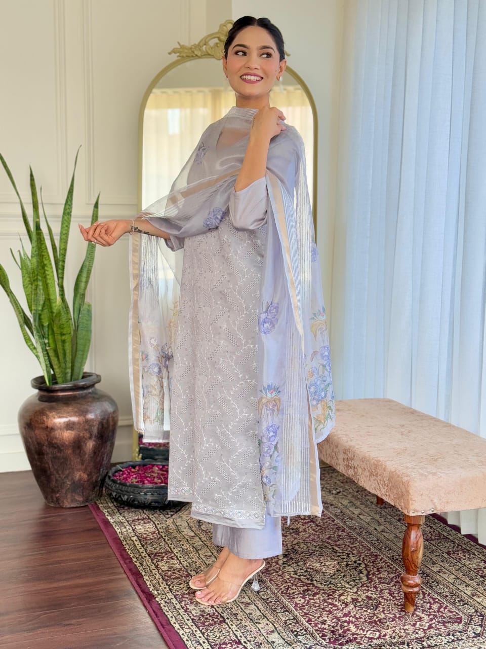 Featuring Fully Elegant Roman silk Suit Set Which is Beautifully Decorated With Beautiful chikan kari Sequence work . It Is Paired With Matching Pants And Printed Dupatta