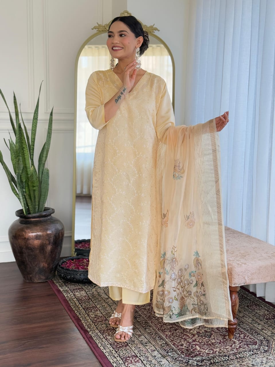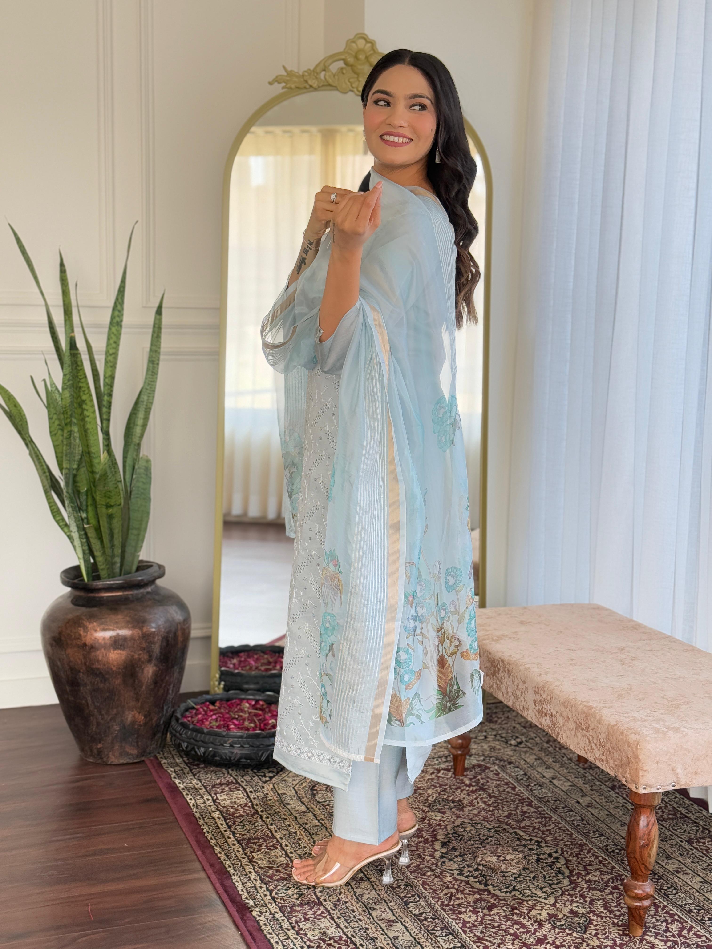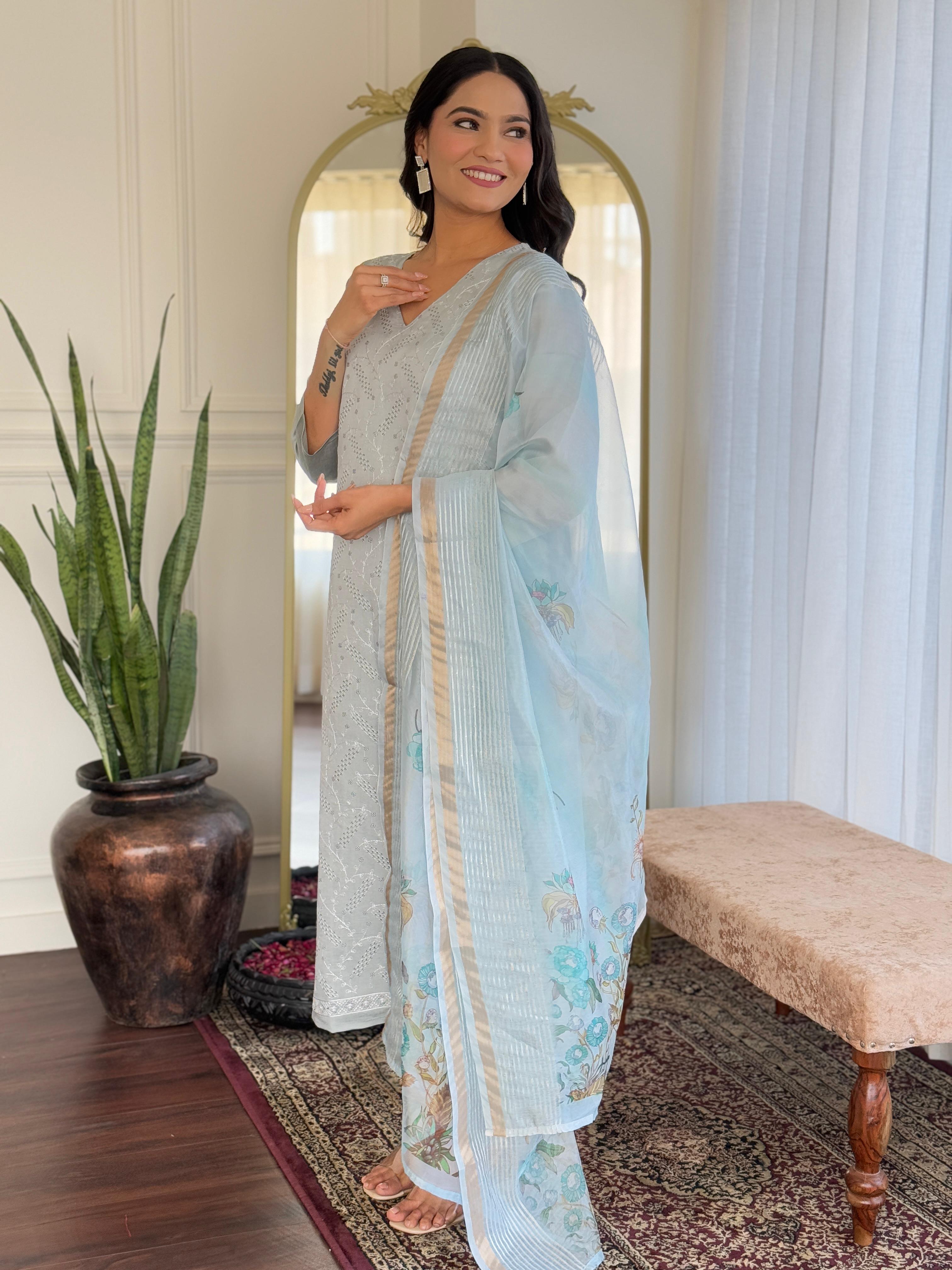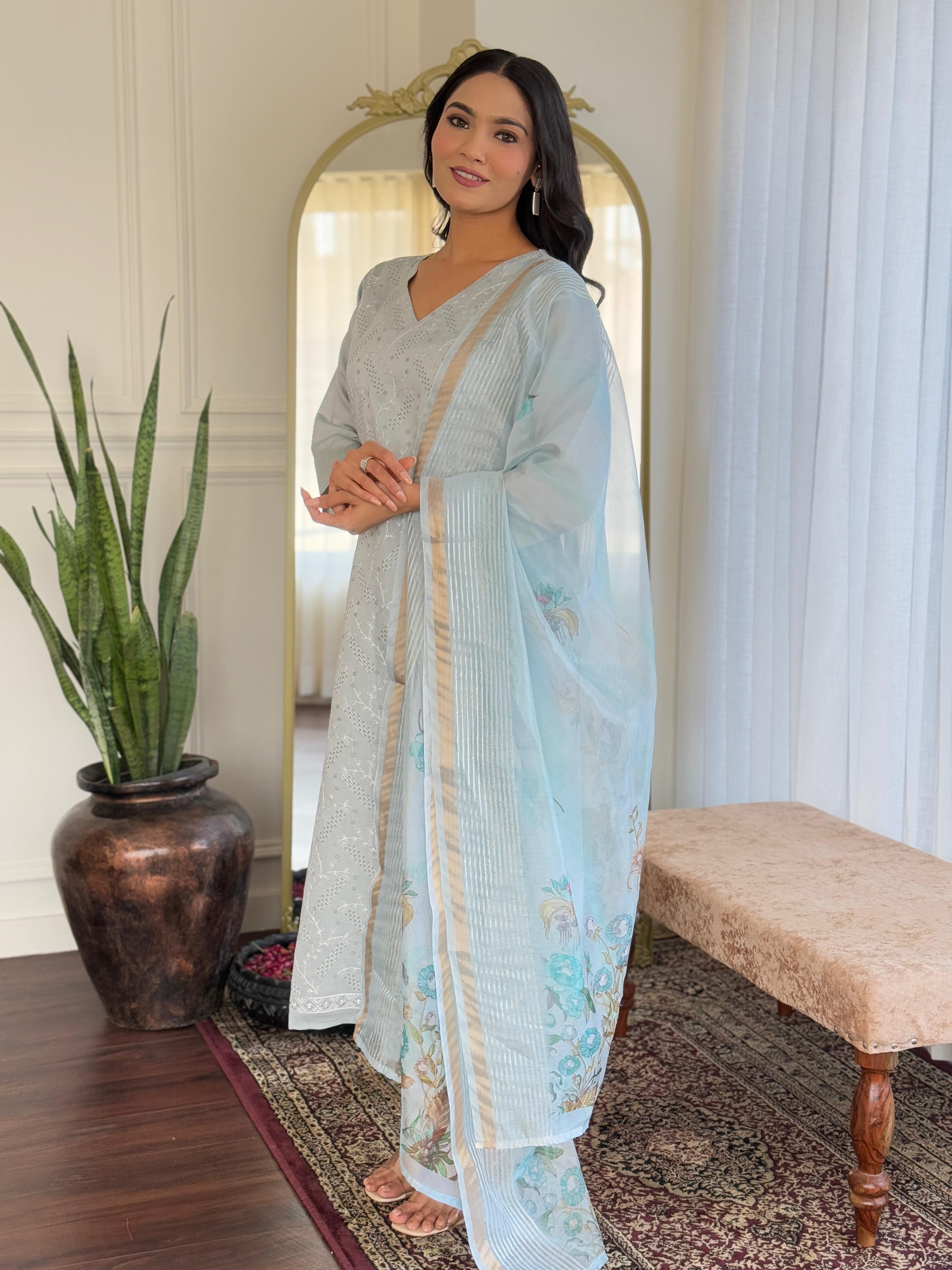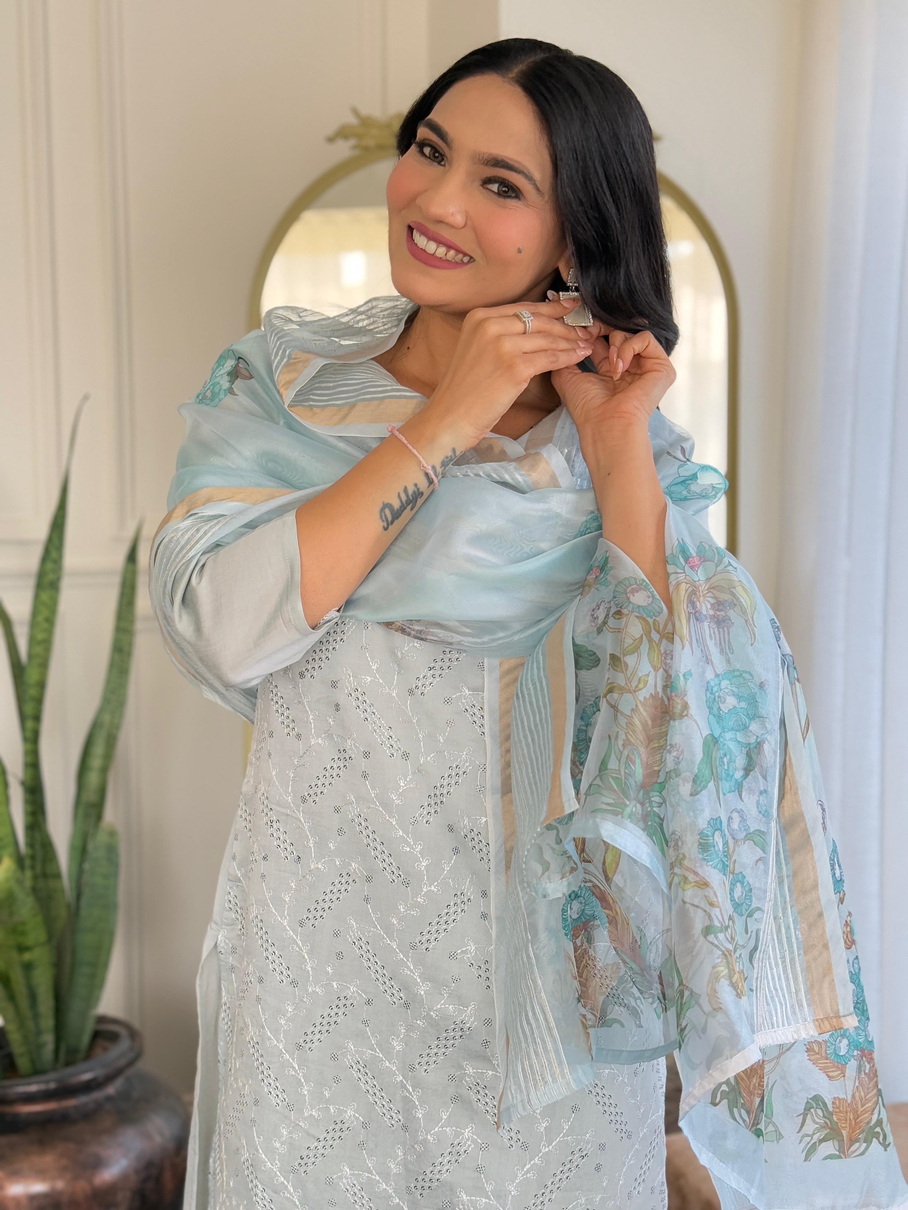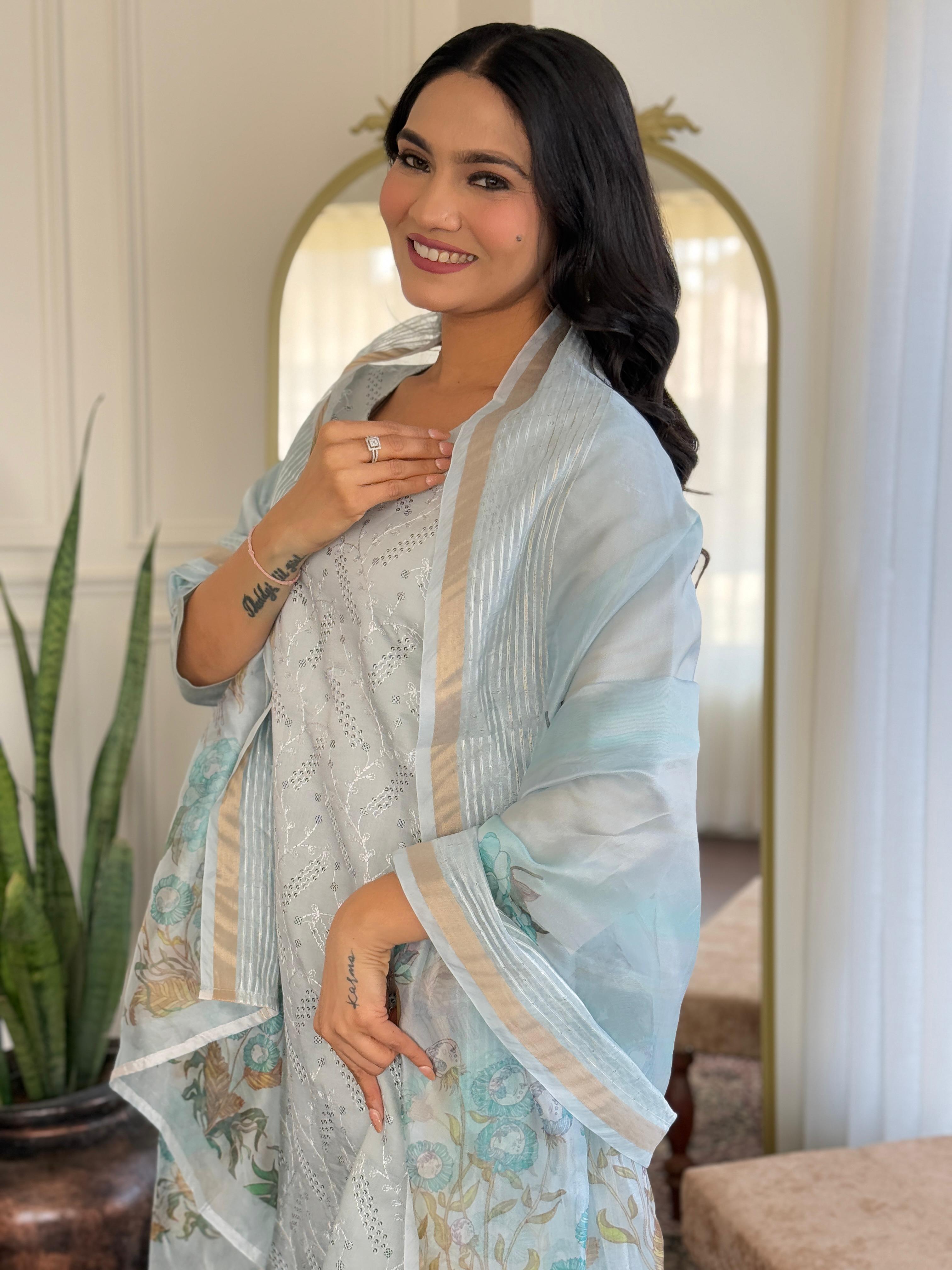 Featuring Fully Elegant Roman silk Suit Set Which is Beautifully Decorated With Beautiful chikan kari Sequence work . It Is Paired With Matching Pants And Printed Dupatta