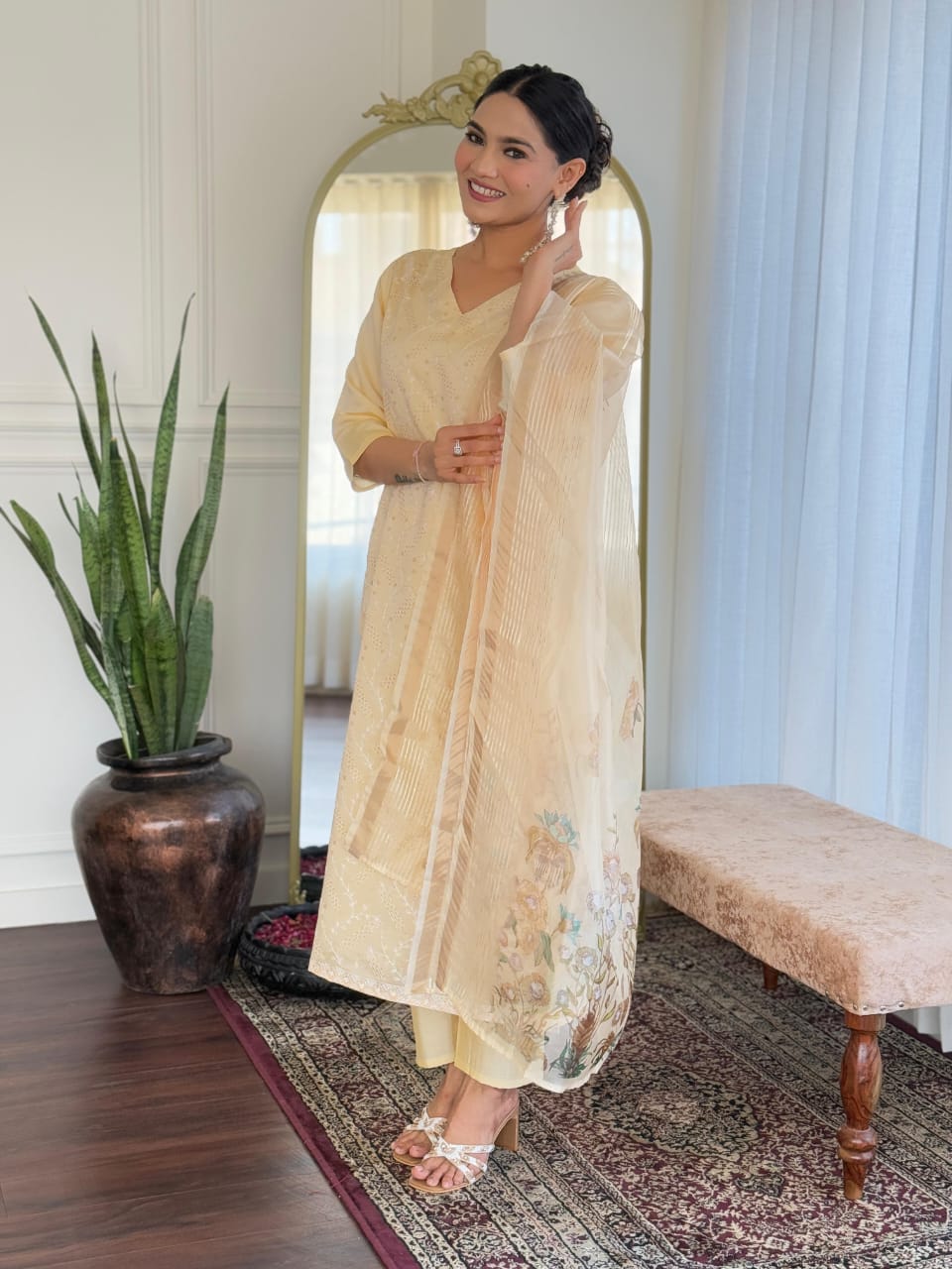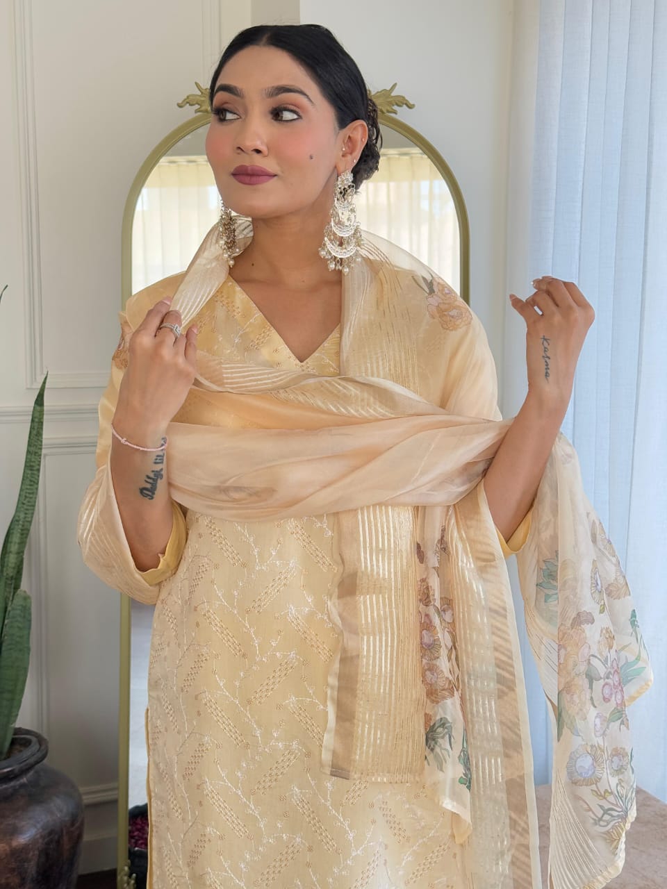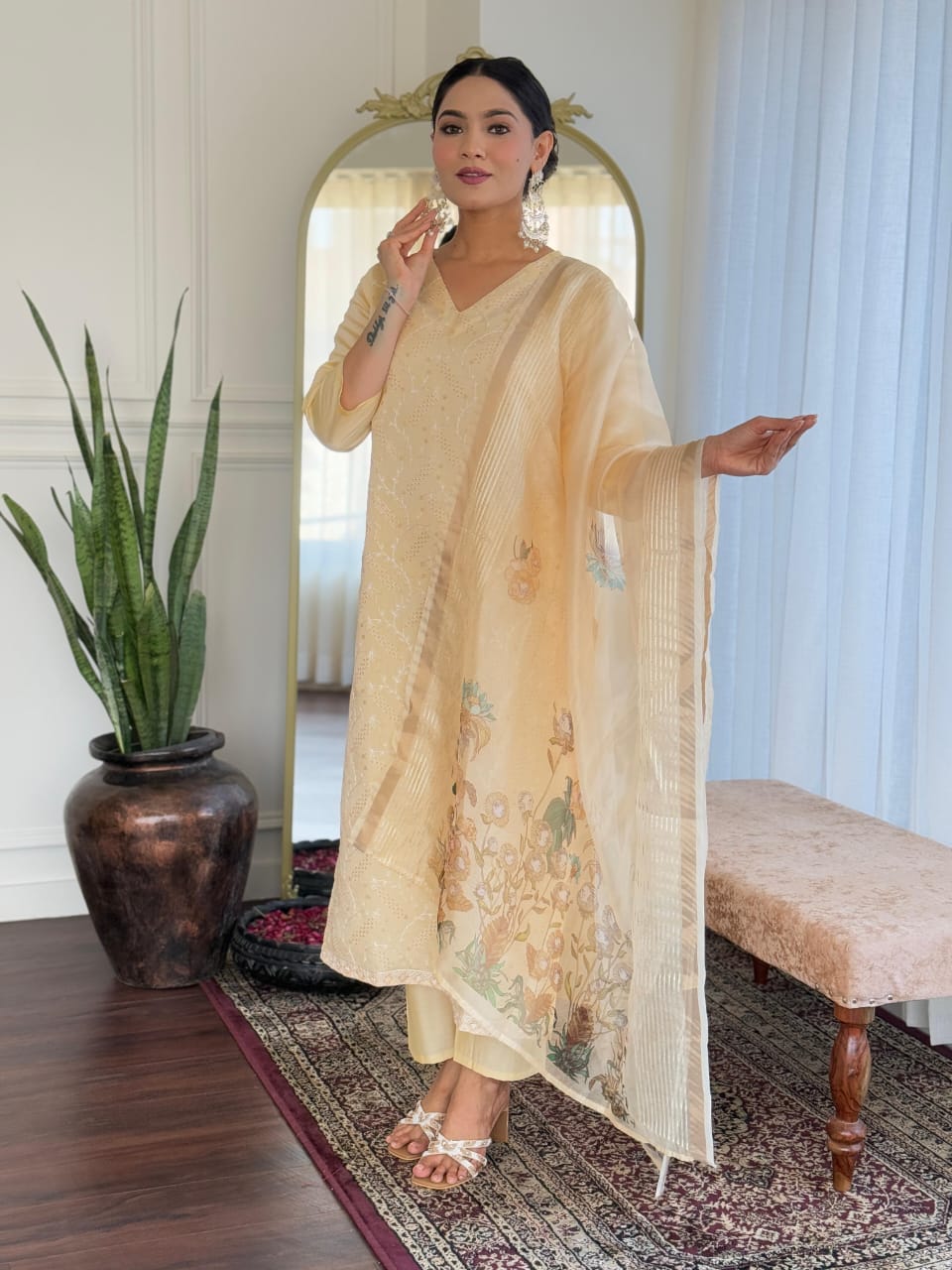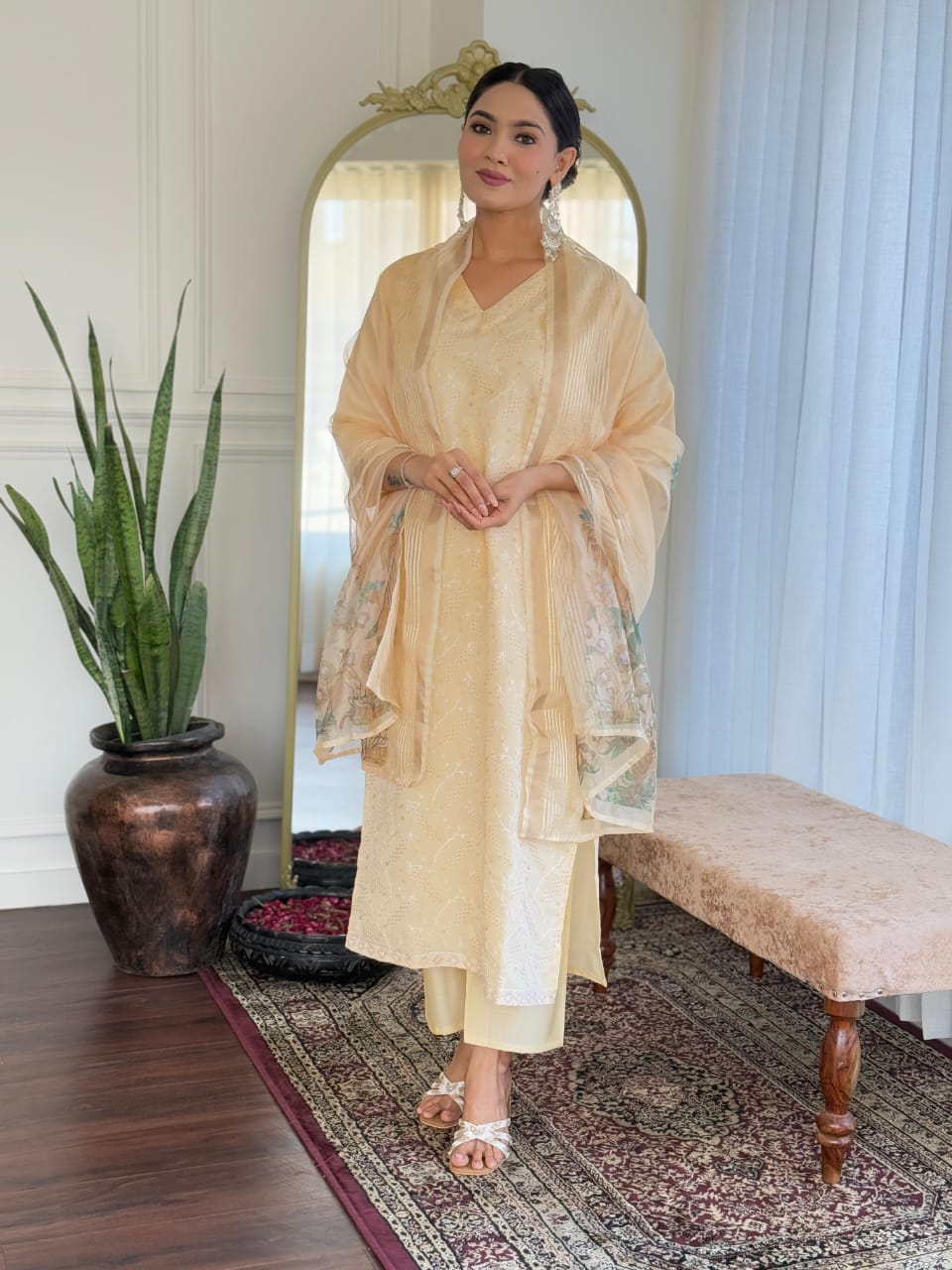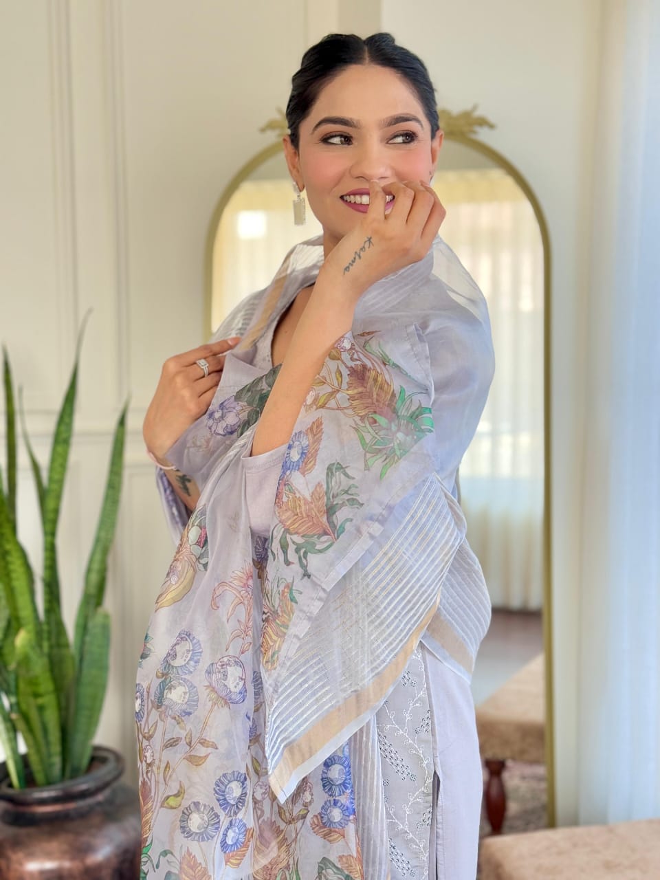 Featuring Fully Elegant Roman silk Suit Set Which is Beautifully Decorated With Beautiful chikan kari Sequence work . It Is Paired With Matching Pants And Printed Dupatta