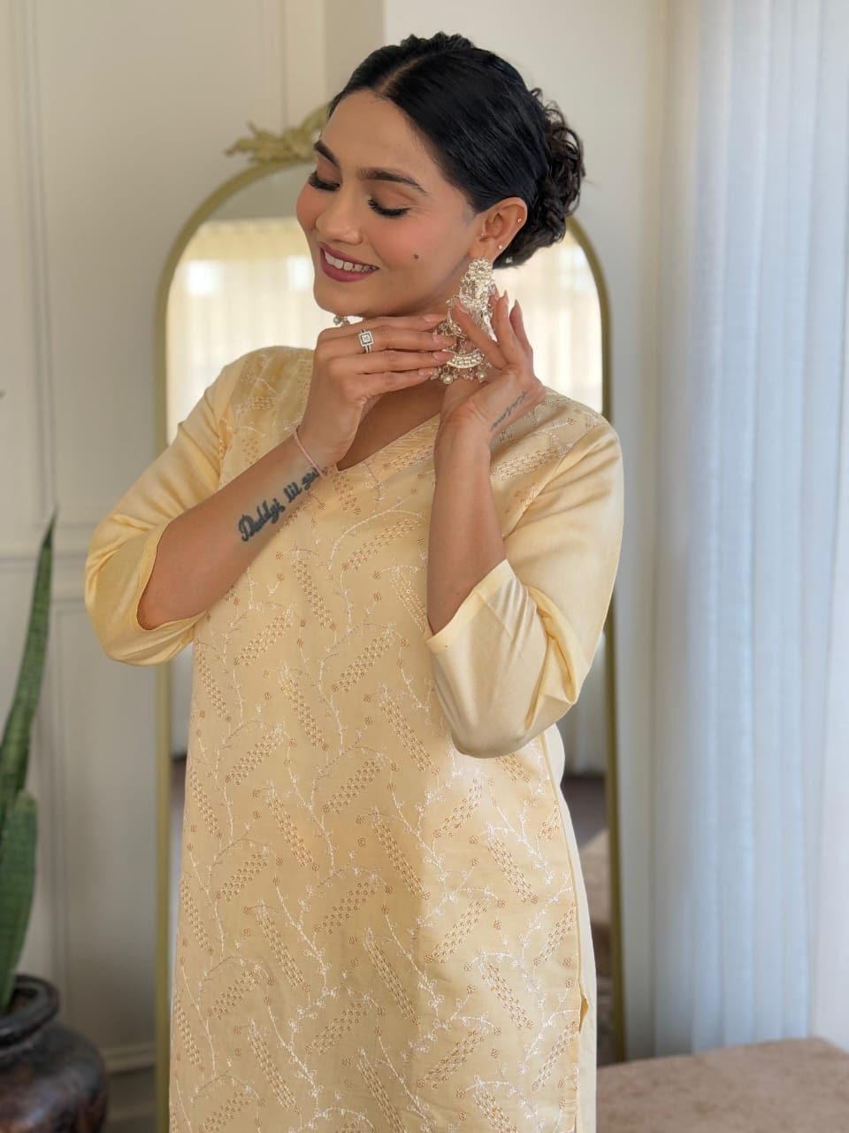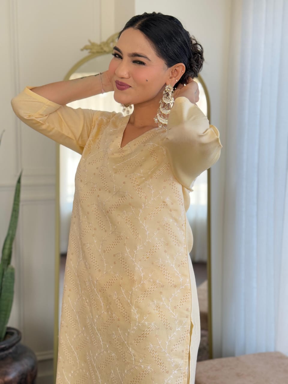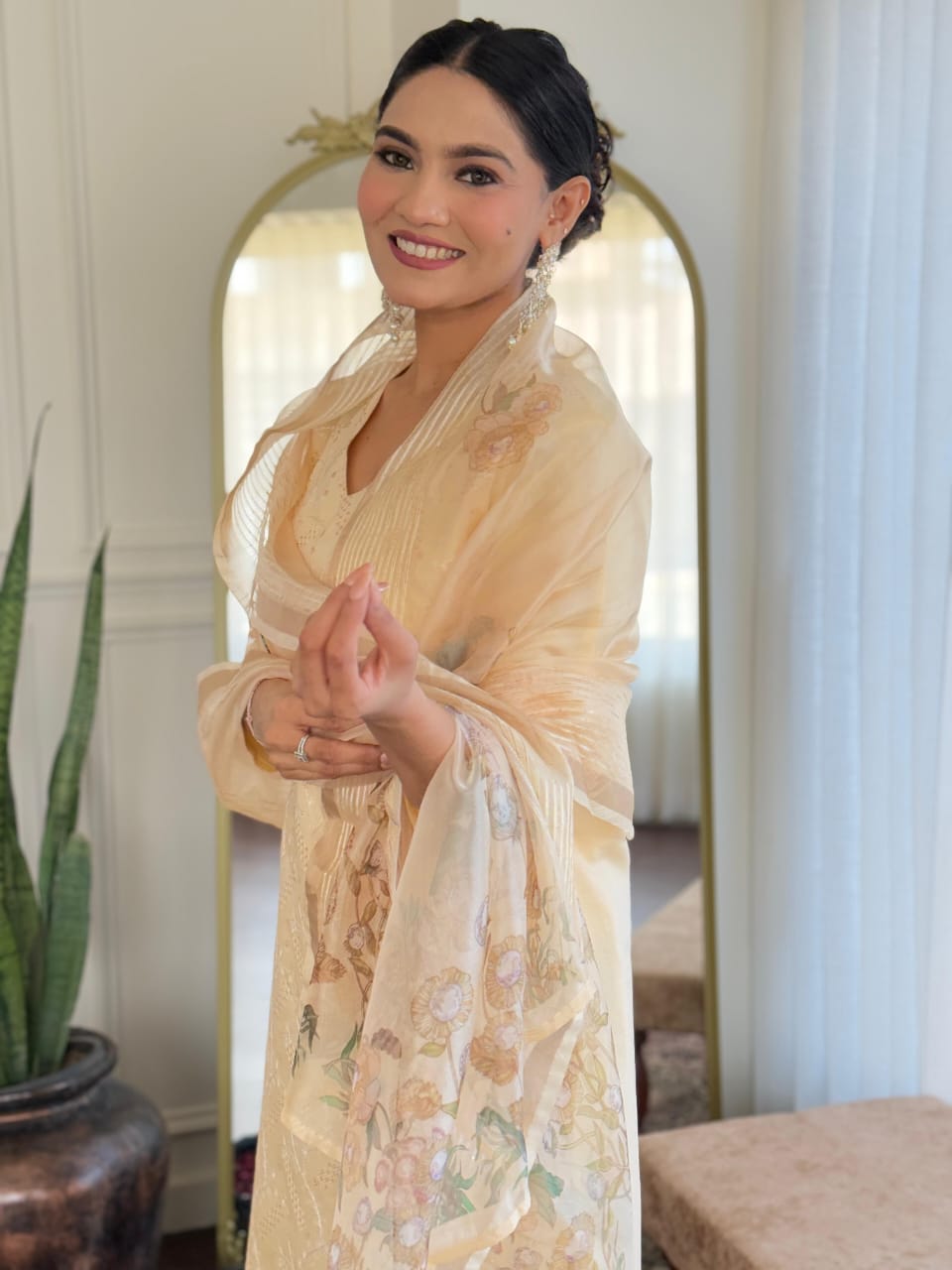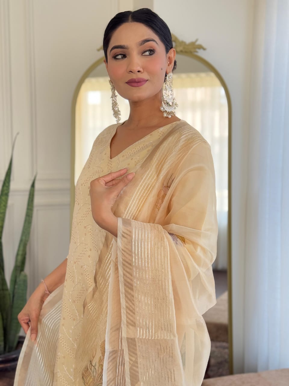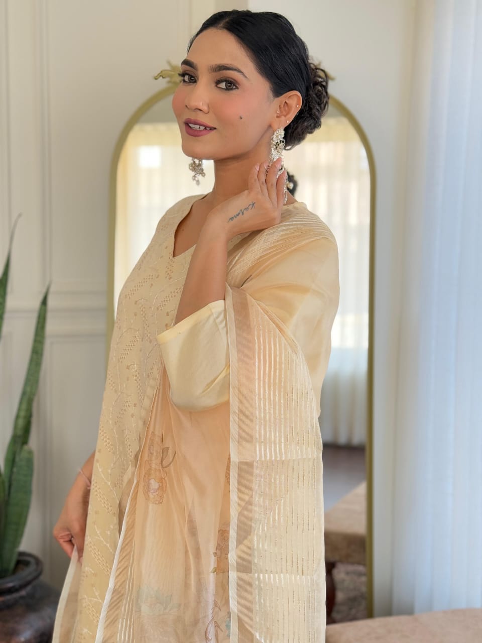 Featuring Fully Elegant Roman silk Suit Set Which is Beautifully Decorated With Beautiful chikan kari Sequence work . It Is Paired With Matching Pants And Printed Dupatta