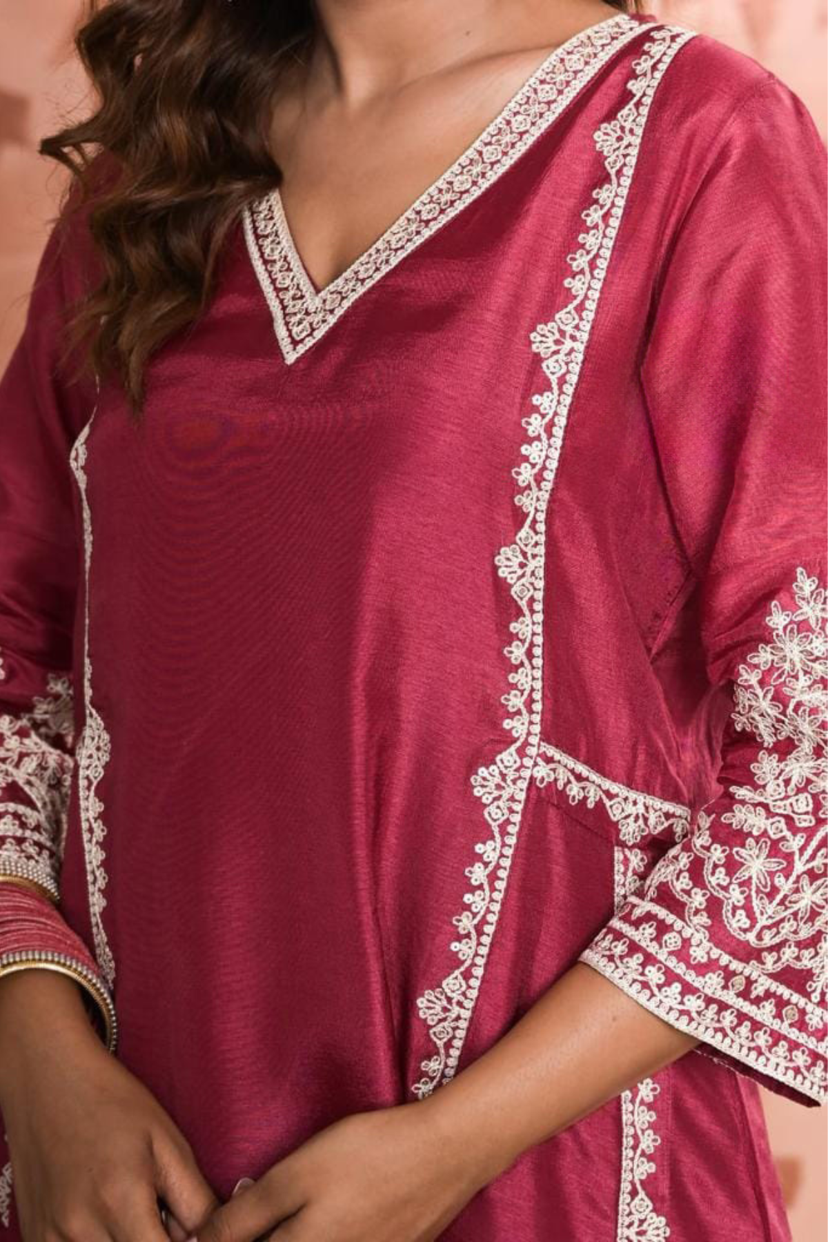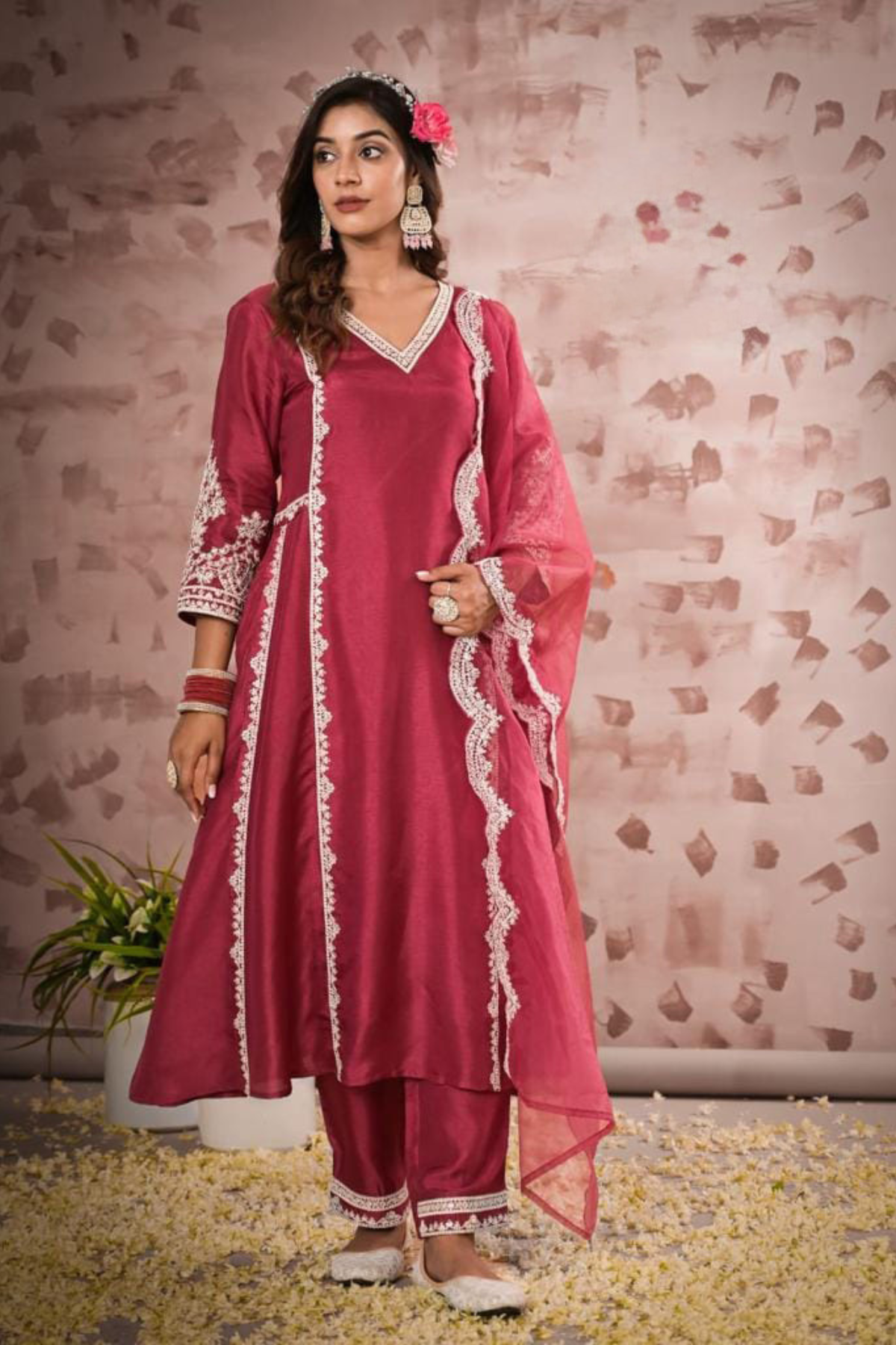 Premium Russian silk with embroidery all over panels and sleeves paired with Russian silk pants with work and organza dupatta with heavy cutworked border..