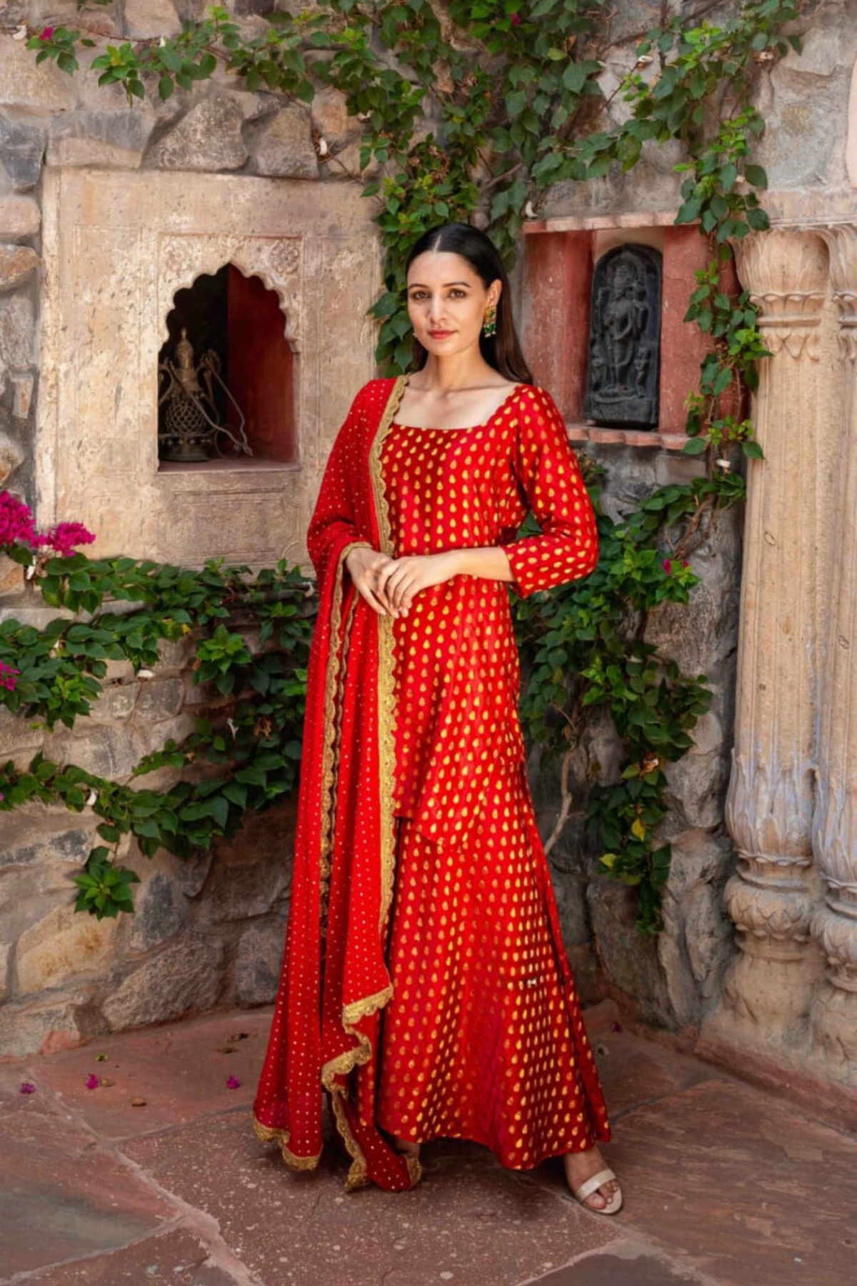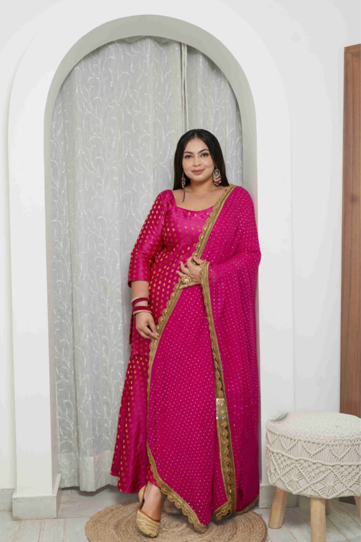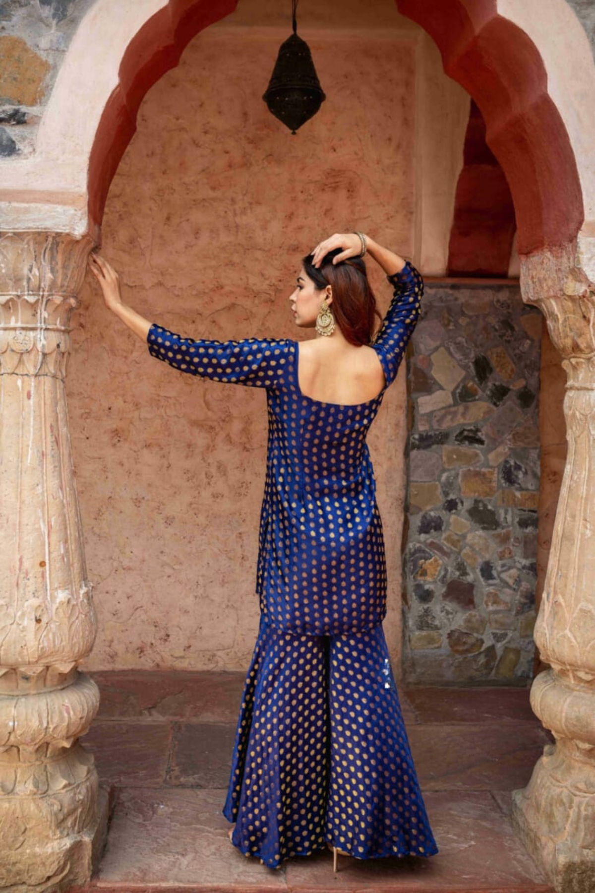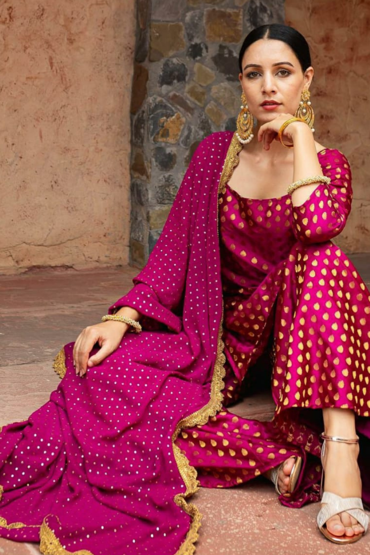This new design is in sharara style Silk brocade heavy flared sharara suit set, teamed with beautiful embellished Chiffon dew Drop dupatta all over heavy lace. A classic timeless set.