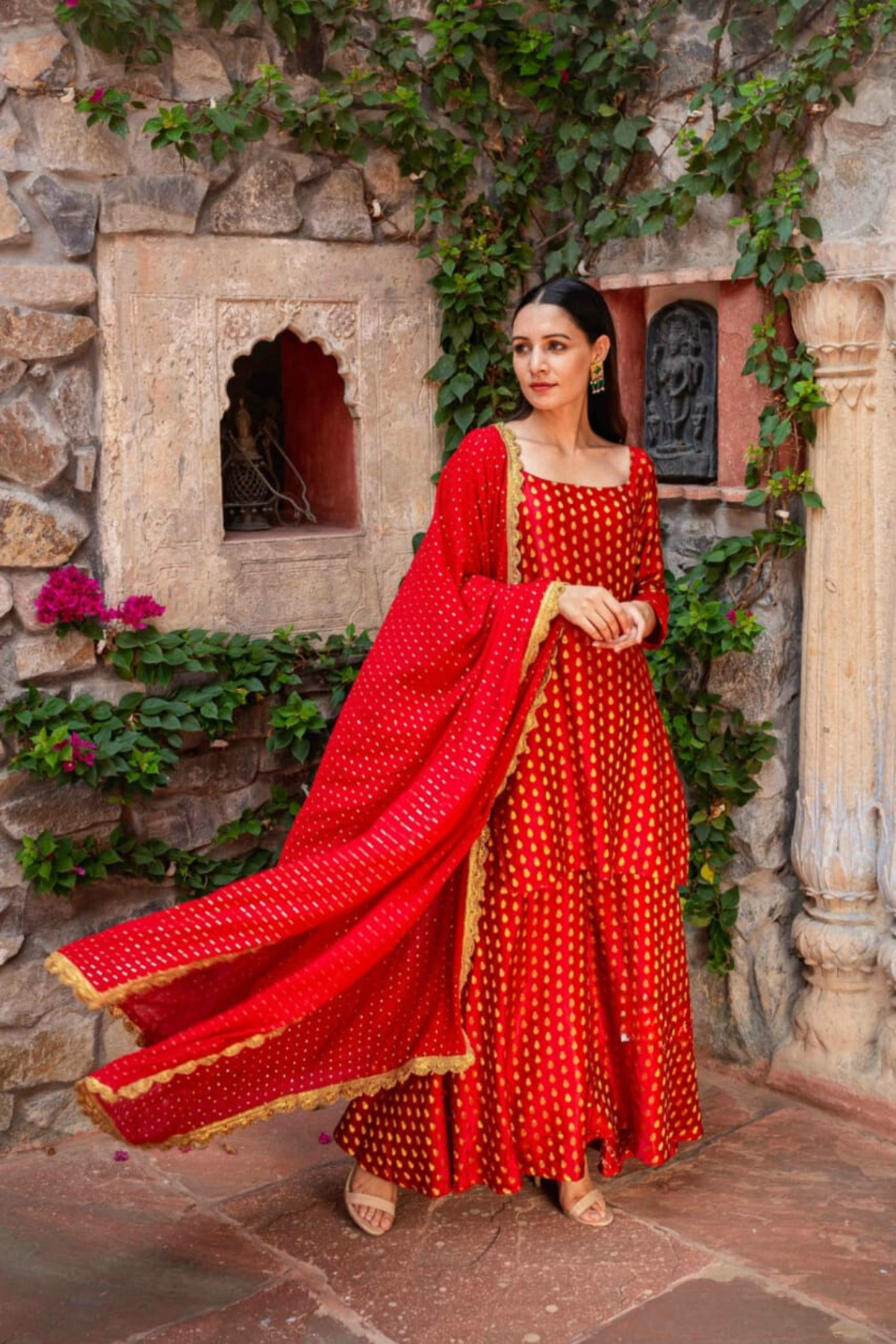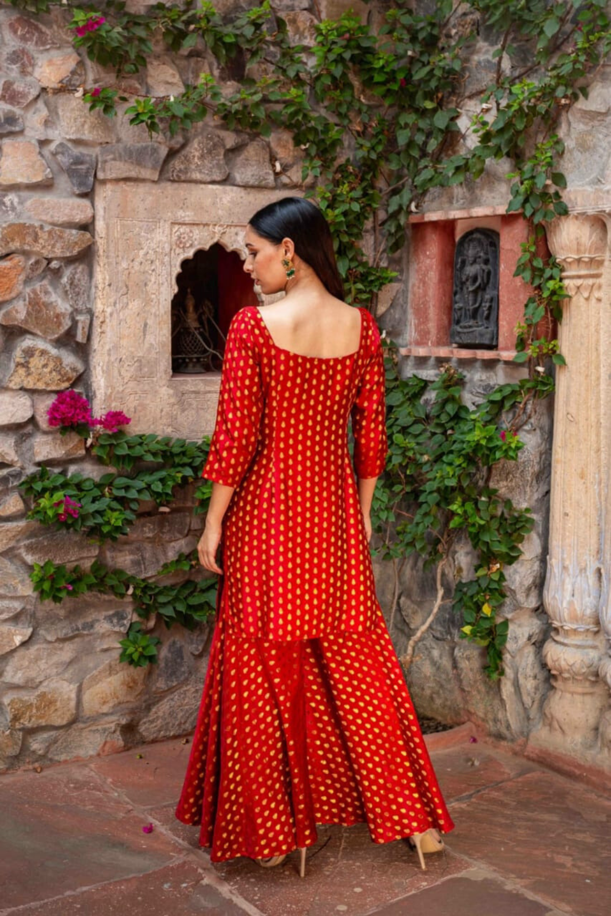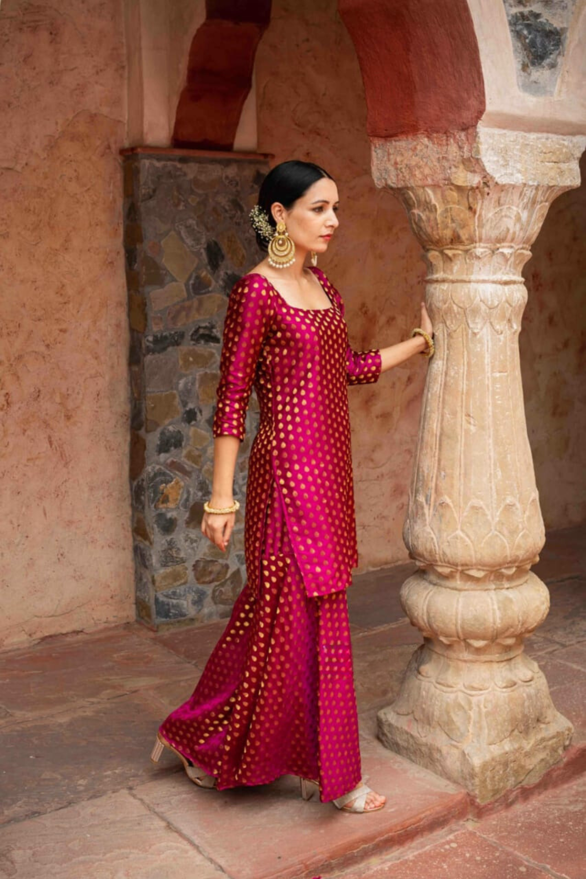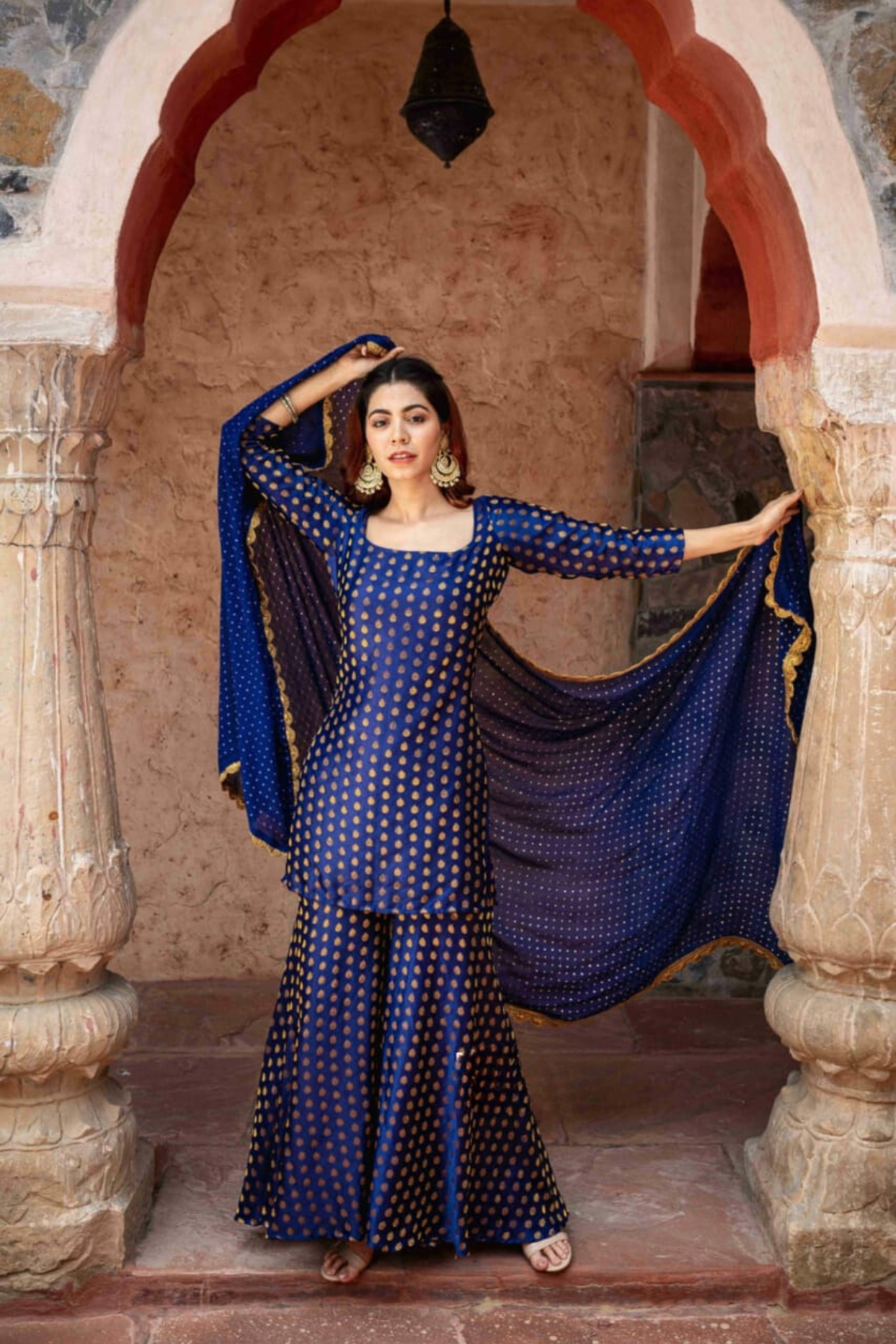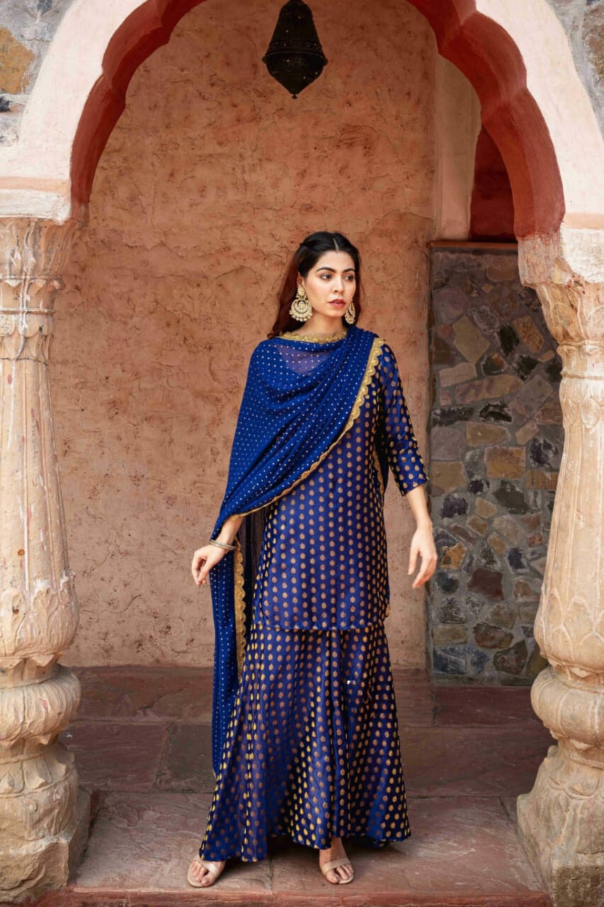 This new design is in sharara style Silk brocade heavy flared sharara suit set, teamed with beautiful embellished Chiffon dew Drop dupatta all over heavy lace. A classic timeless set.