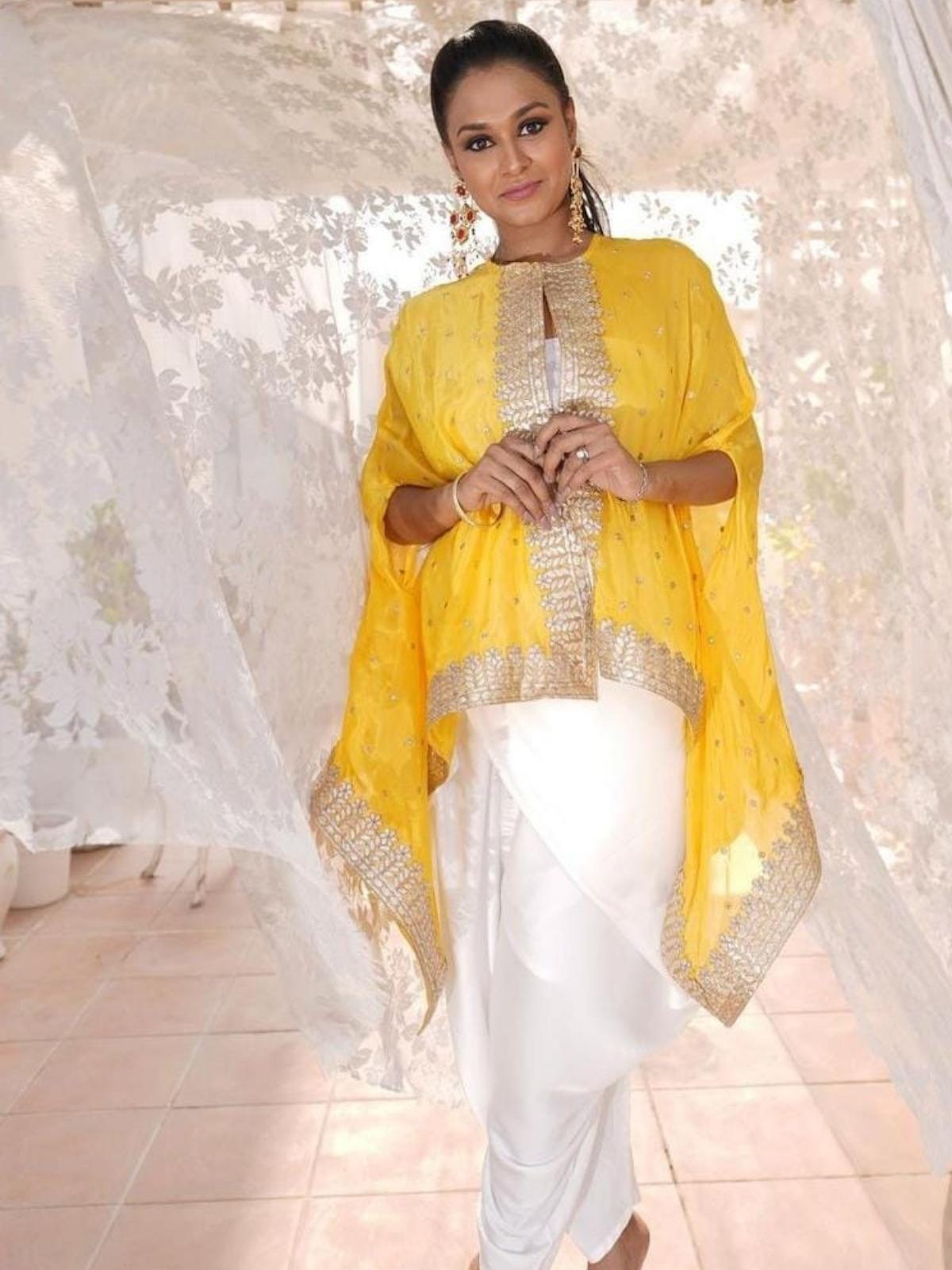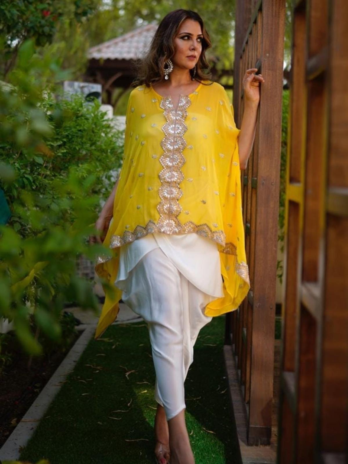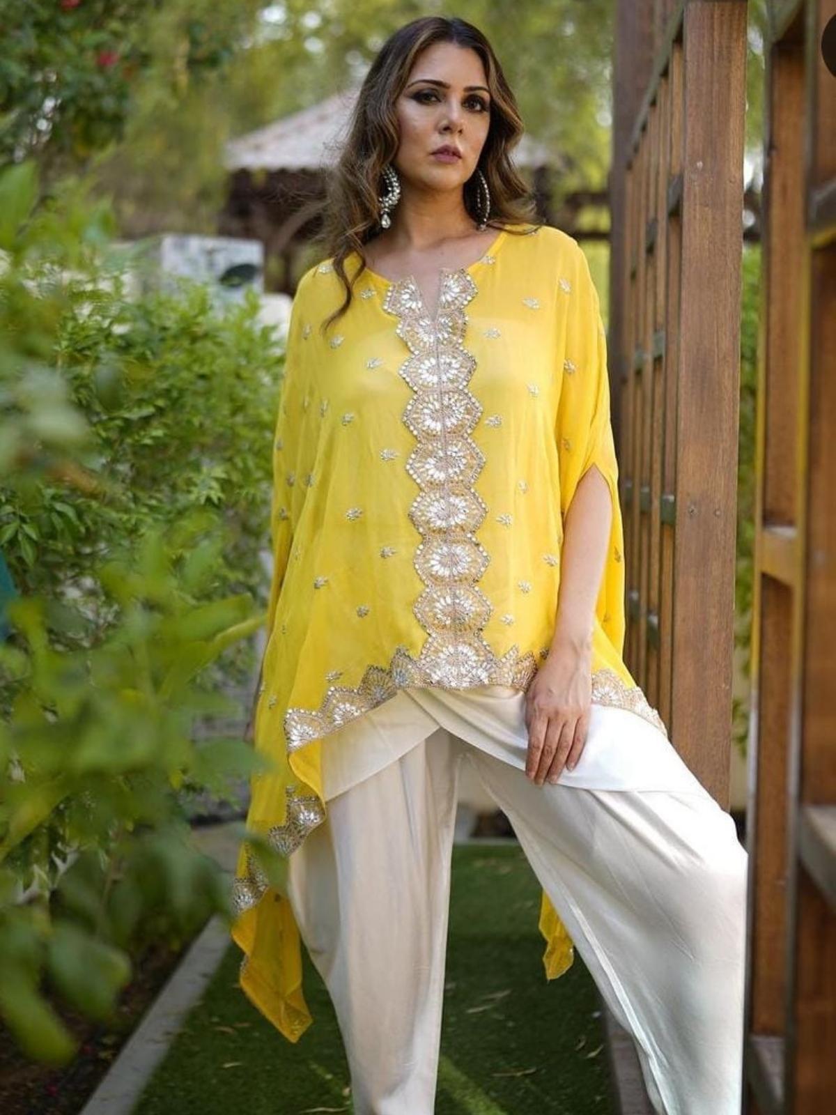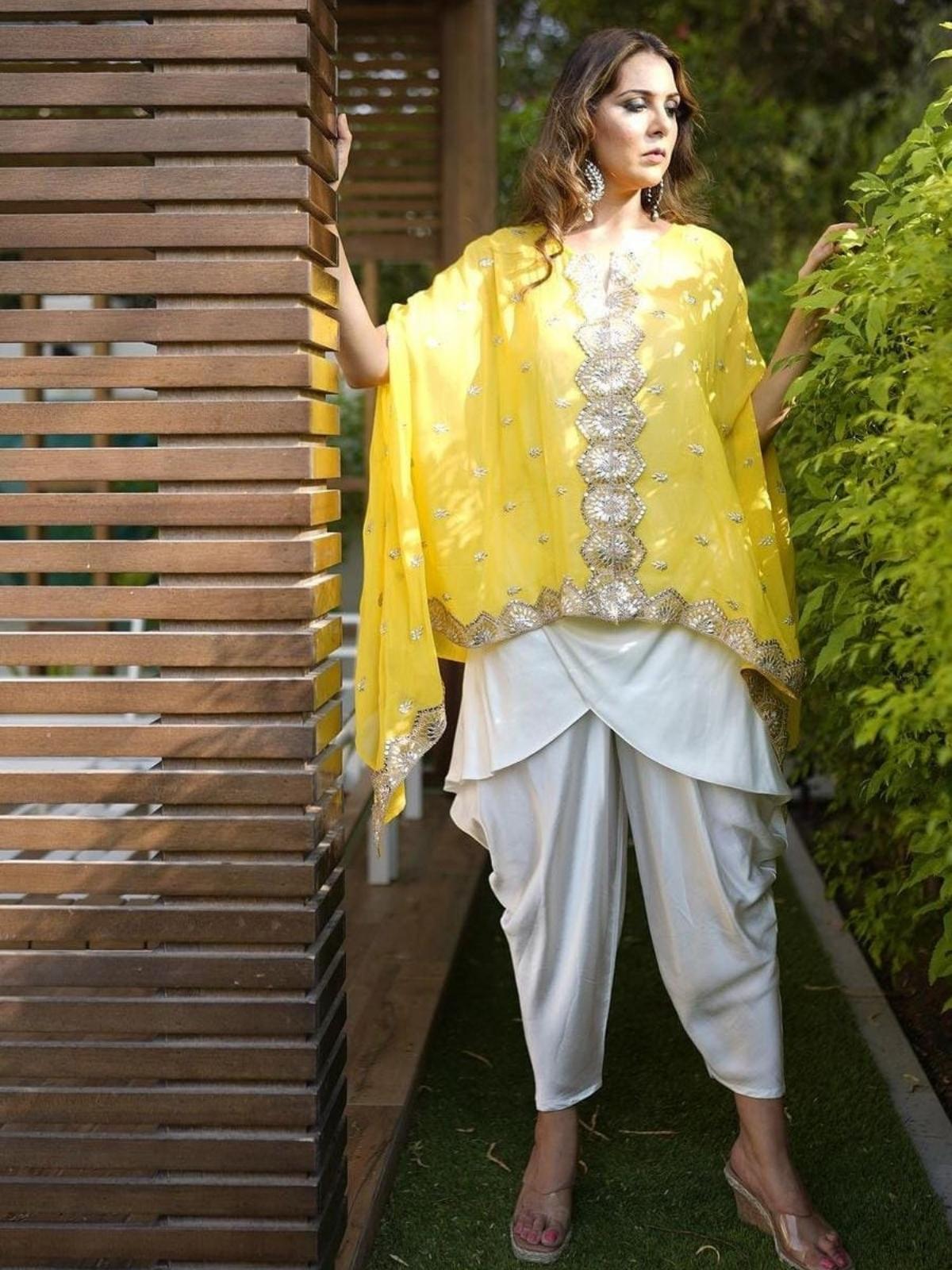 Get festival ready with this beautiful fusion outfit. Astylish dress dress with kaftaan top, front open jacket and dhoti pants. Detailing done with butti and lace work. An outfit to give you a feel of both ethnic and western. You will just love this outfit.