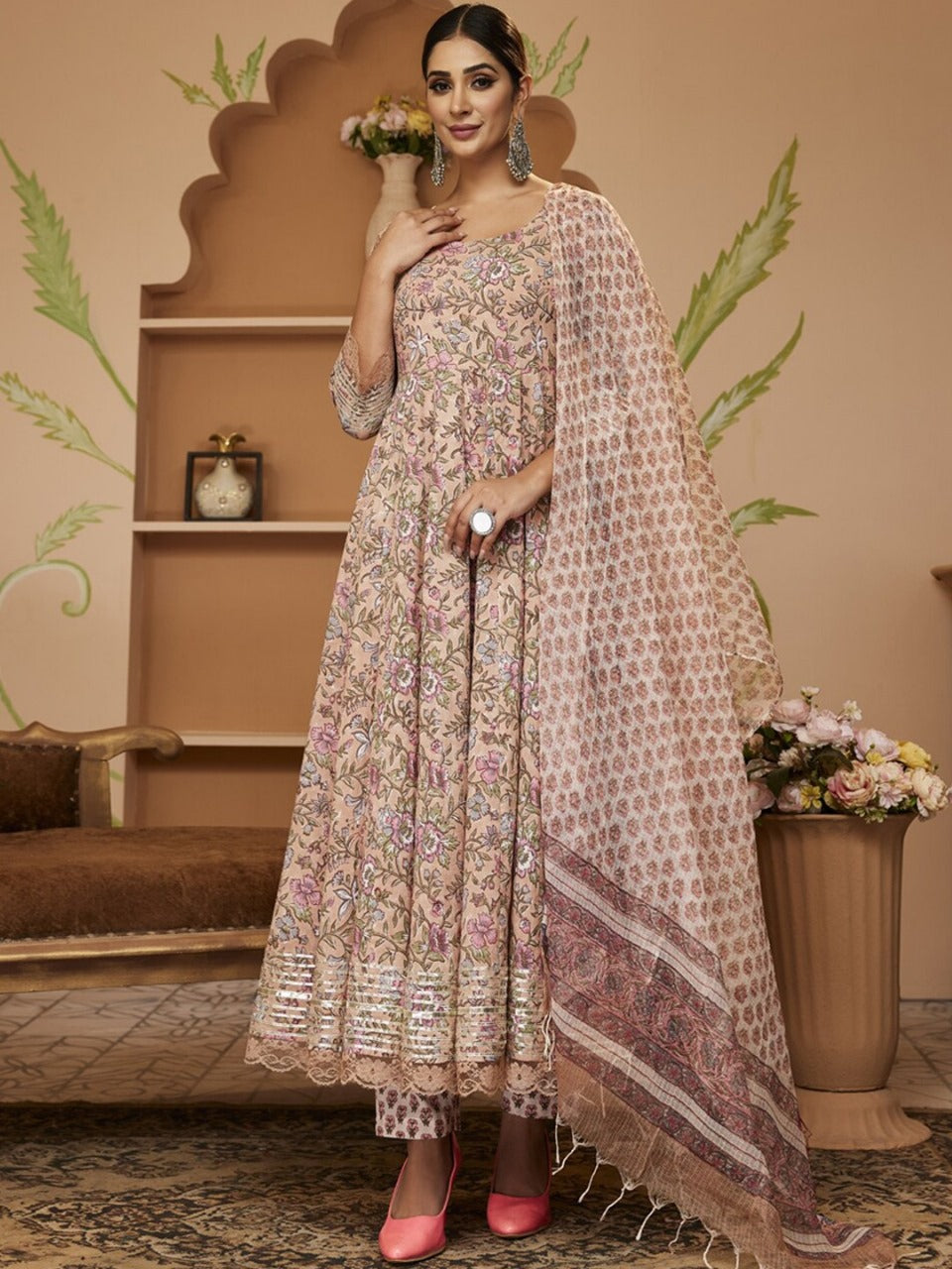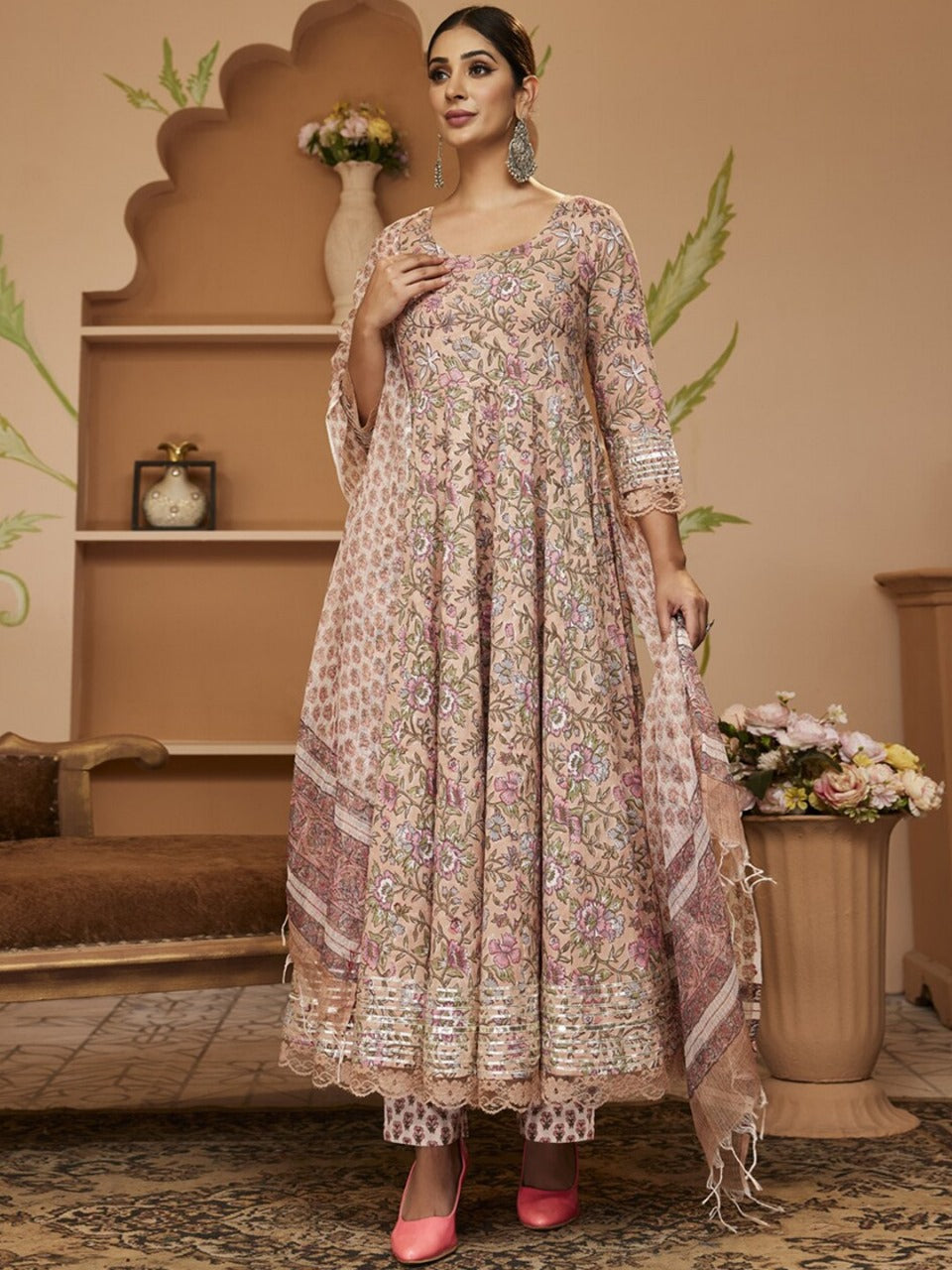 Floral Block Printed Gotta Patti Anarkali Pure Cotton Kurta with Trousers & Dupatta