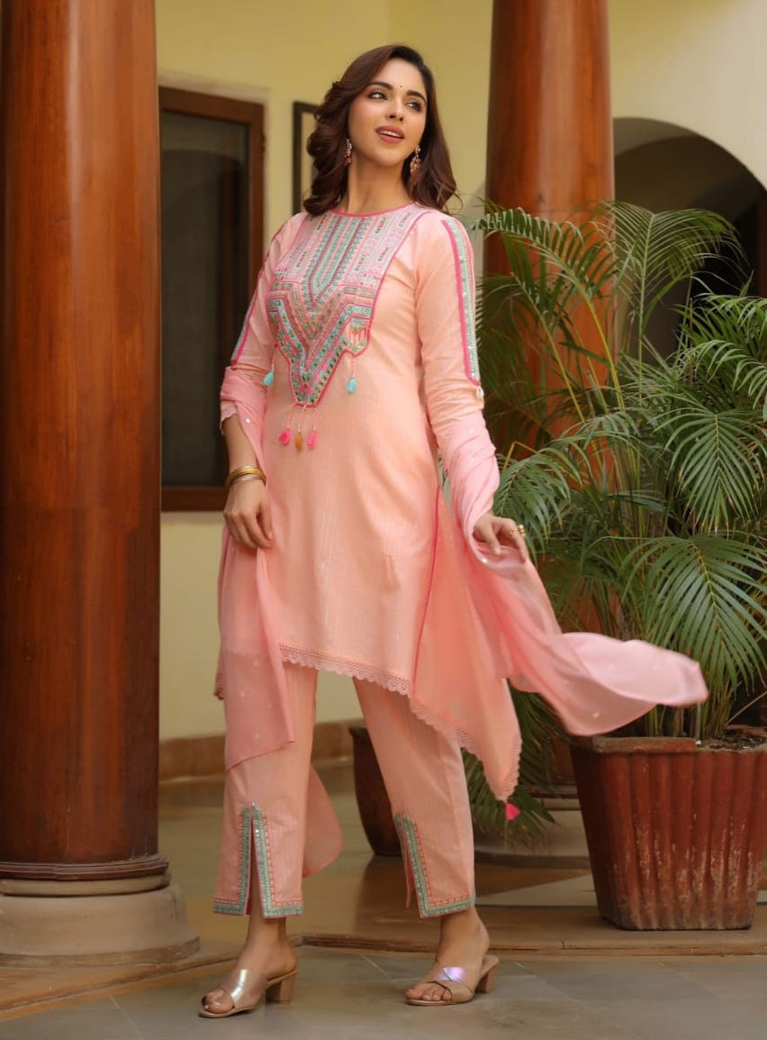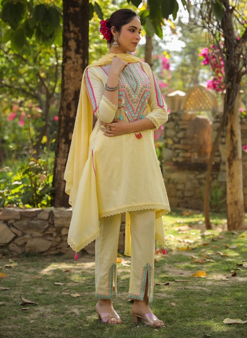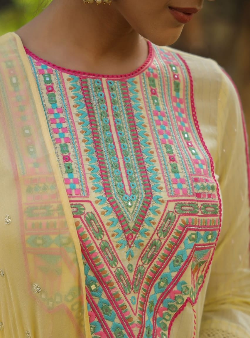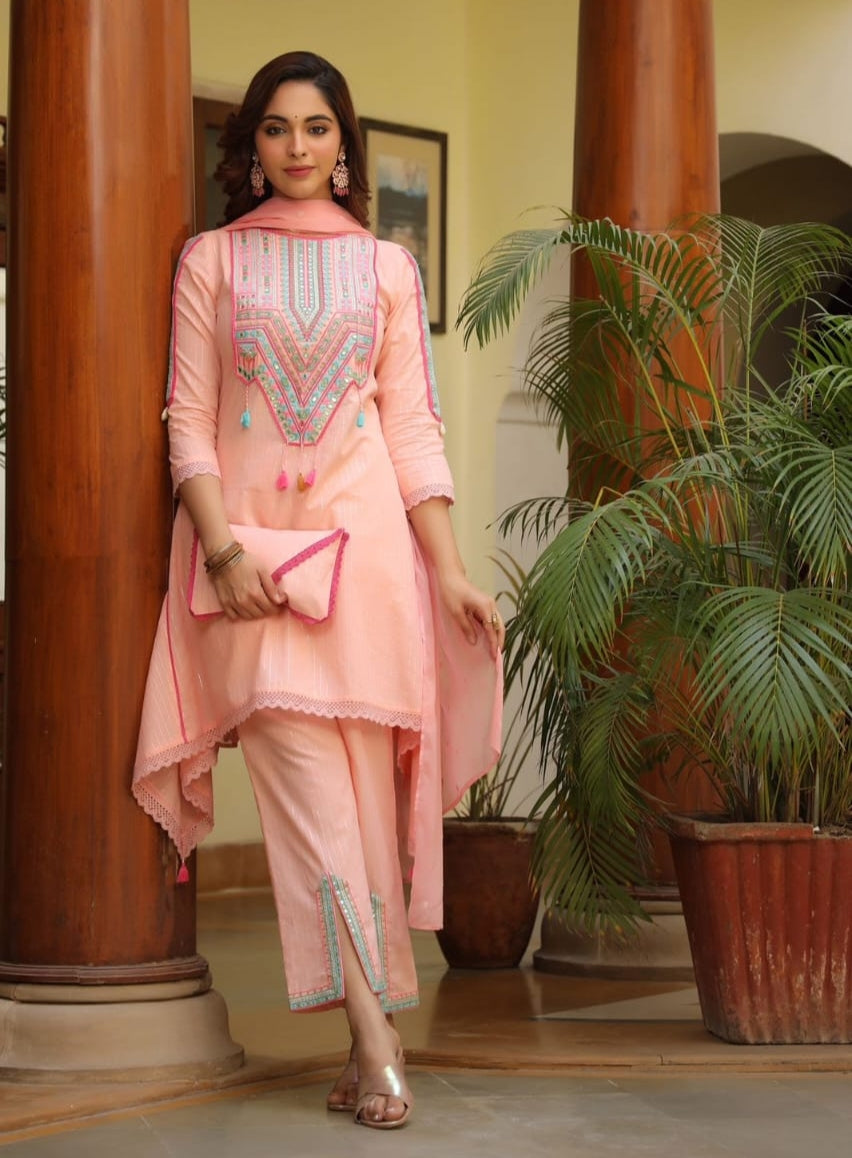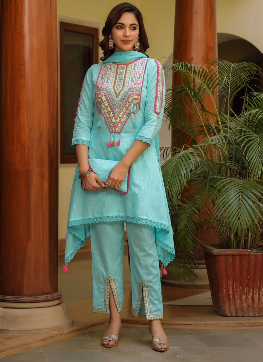 Beautiful Three Piece Cotton Designer Kurti Set With Beautiful Embroidery, Tassels & Frill On Yoke, Cuffs & Hemline Paired With Designer Cotton Bottom With Embroidery And Cotton Dupatta With Embroidery & Border