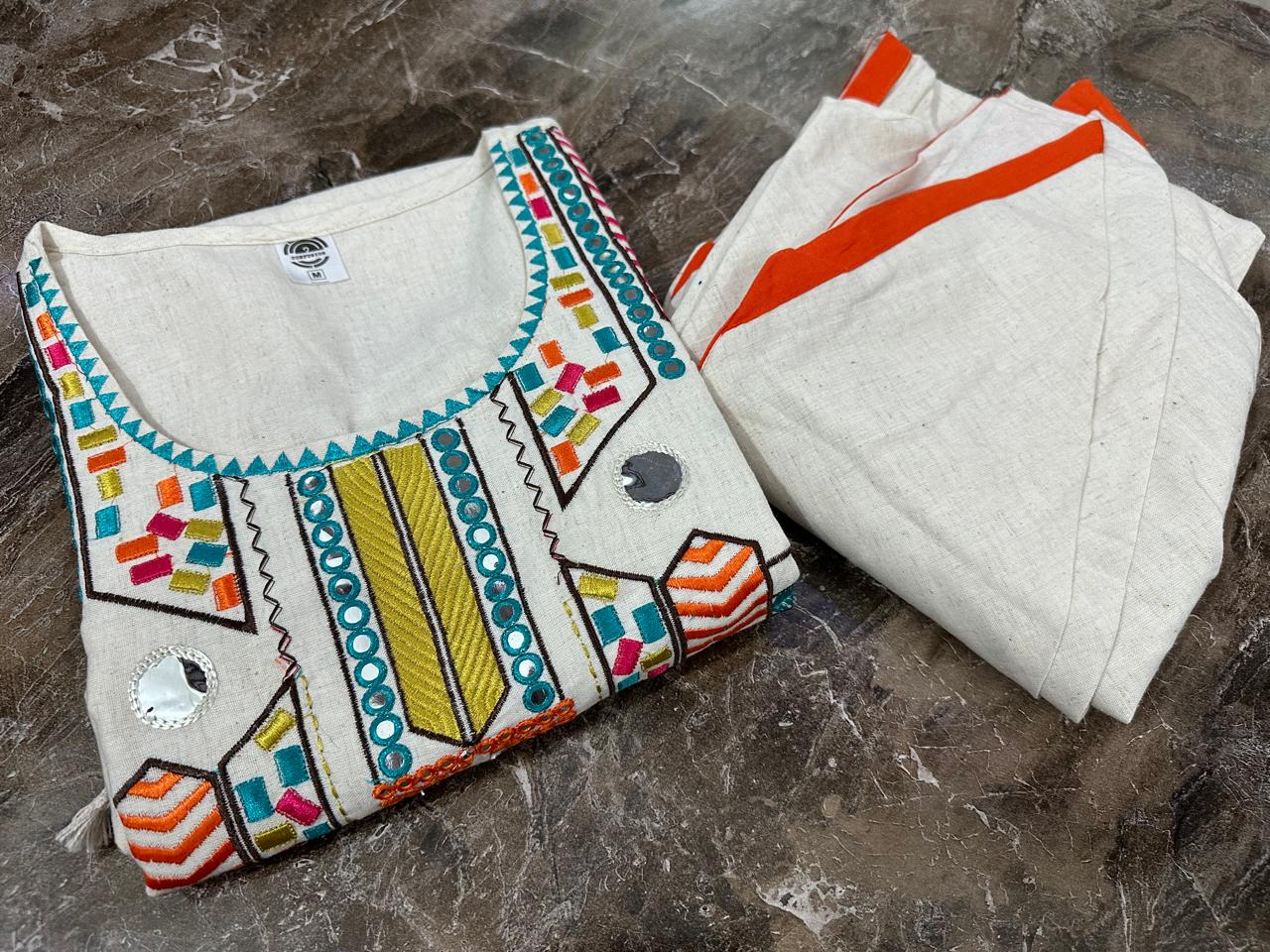 New in festive embroidery work kurta dhoti set. Get your hands on our beautiful off-white kurti with intricate thread embroidery work less work mirror work detailing in bright tone perfect for any auspicious occasion.