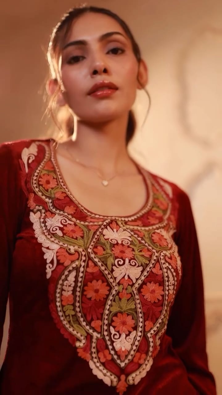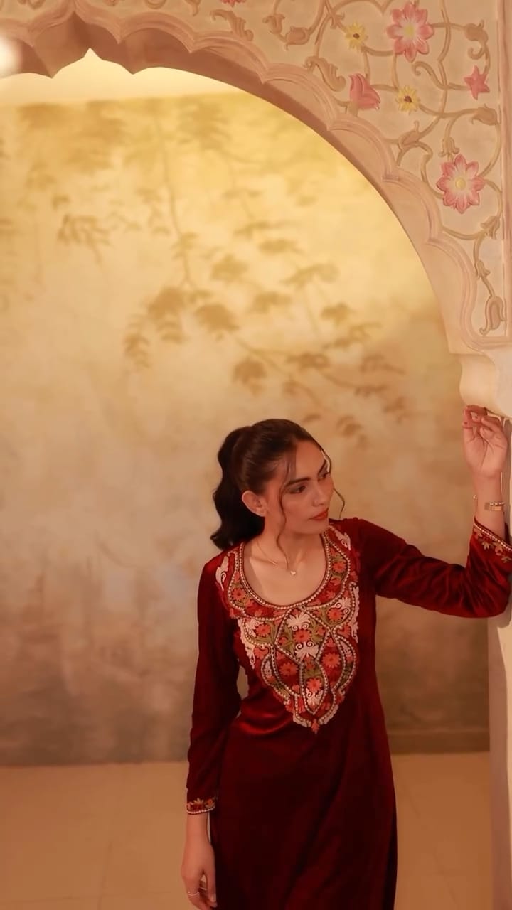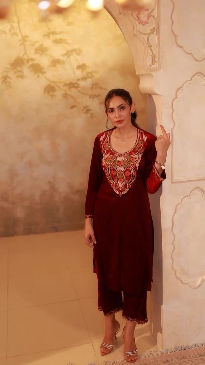 The all time favorite, velvet piece is here to stay this winter season Shop this piece if you are ready to shine through at the next occasion / function with your friends and family. It is decorated with finest multy thread heavy embroidery work.