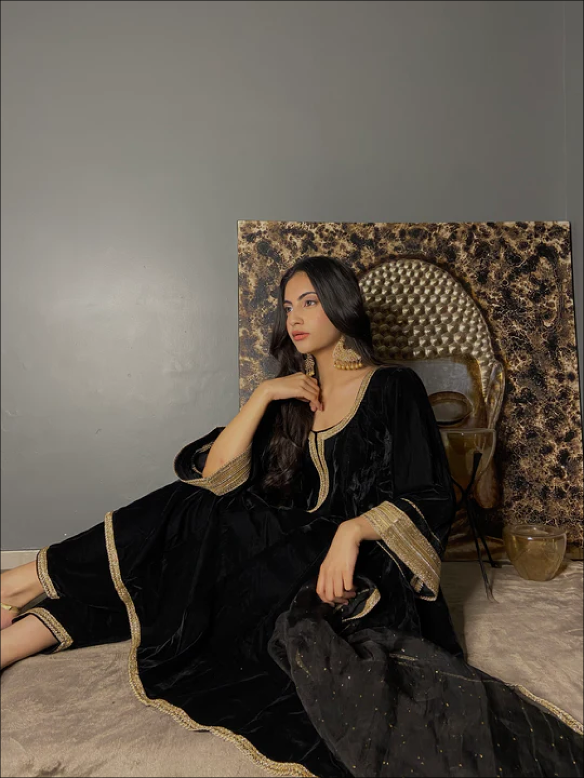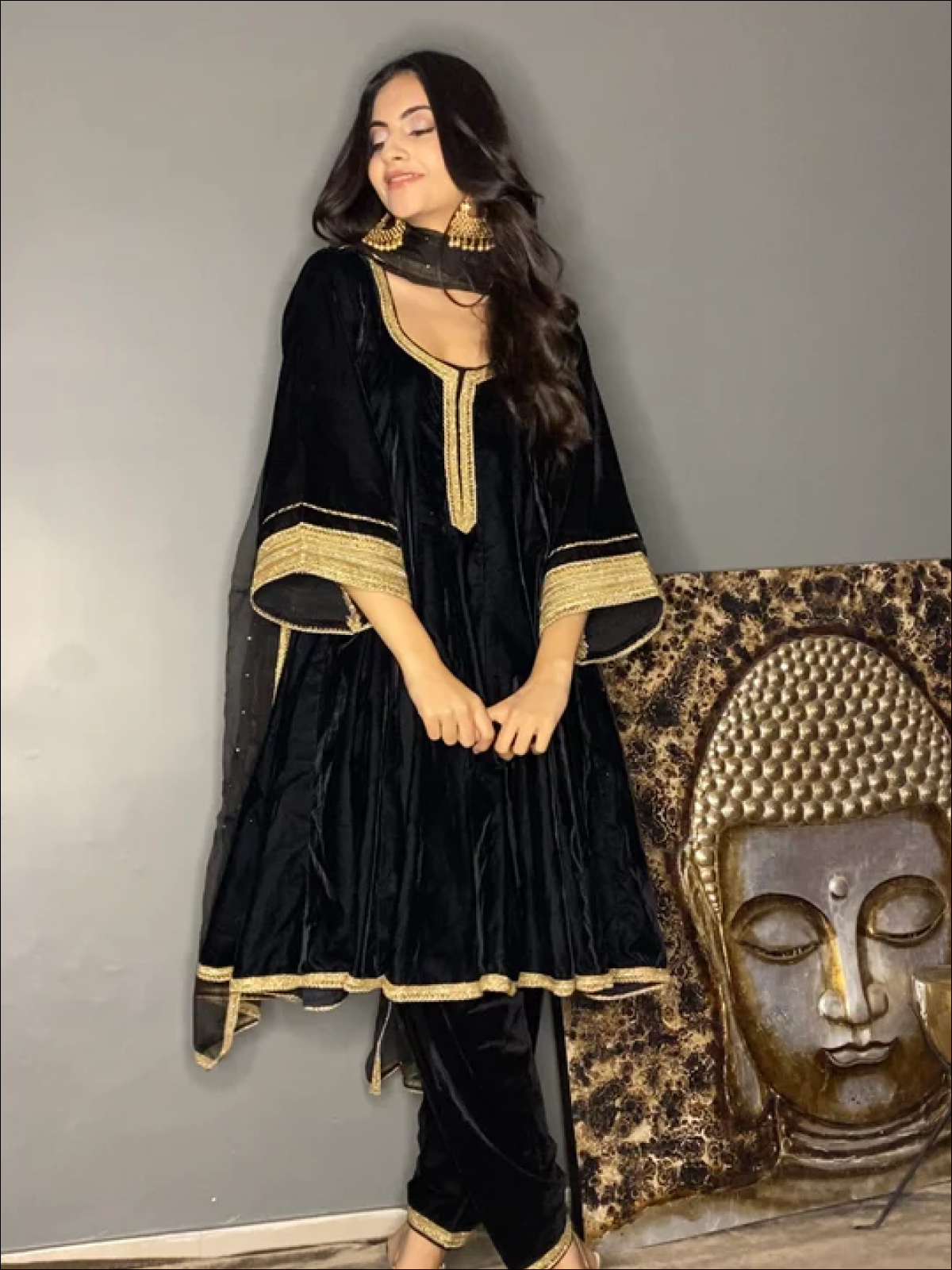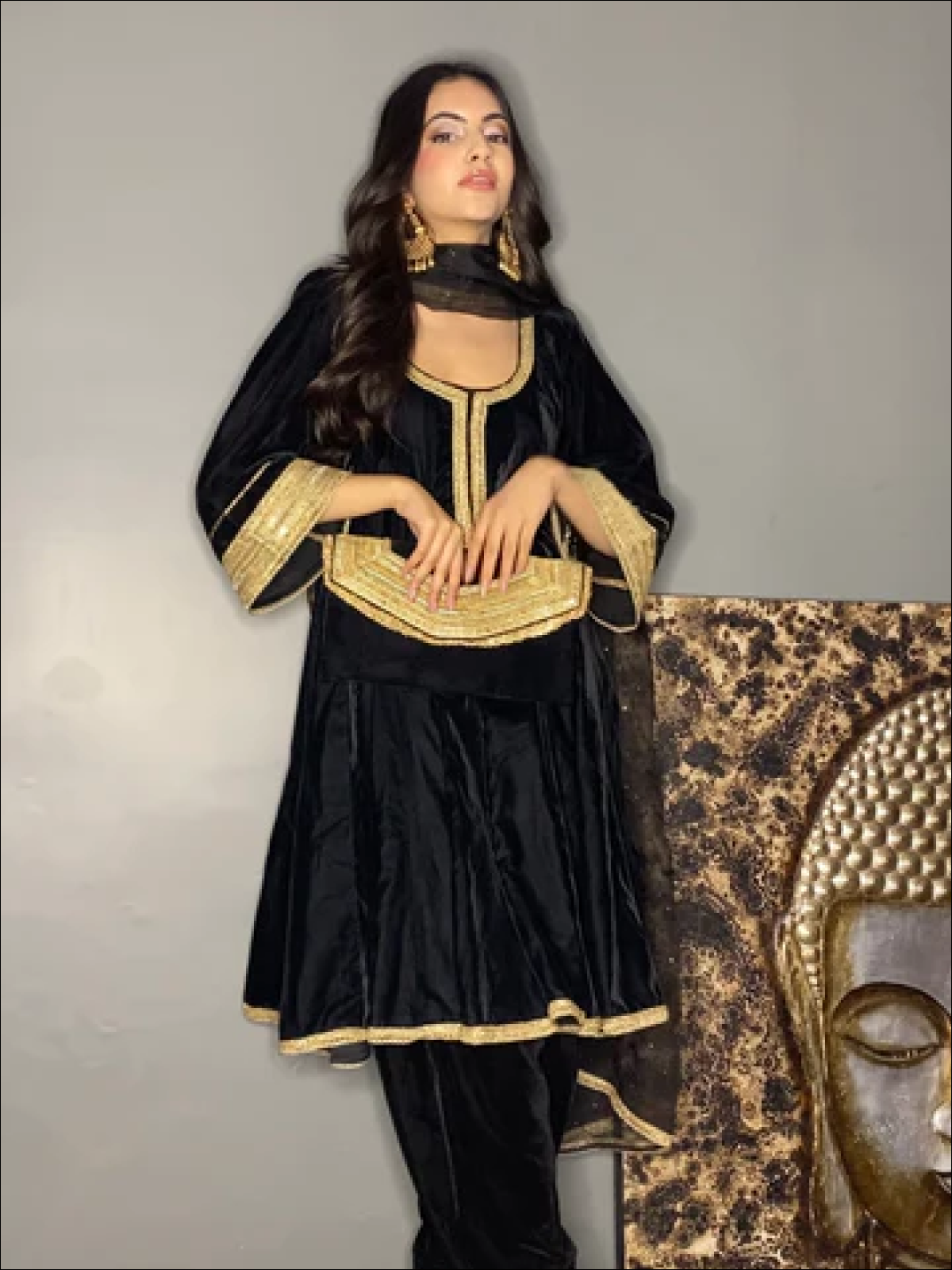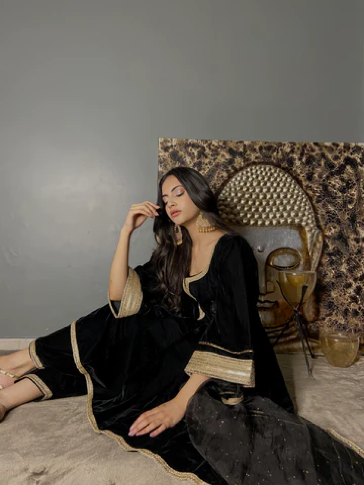 Winter and Wedding special . Pure velvet kali kurta adorned with lace on neckline, loose fit selves with lace work, and lace work on hem paired with pant heavy detailing on hem paired with matching pant adorned with lace work on bottom and matching colour dupptta with gotta lace work all over.