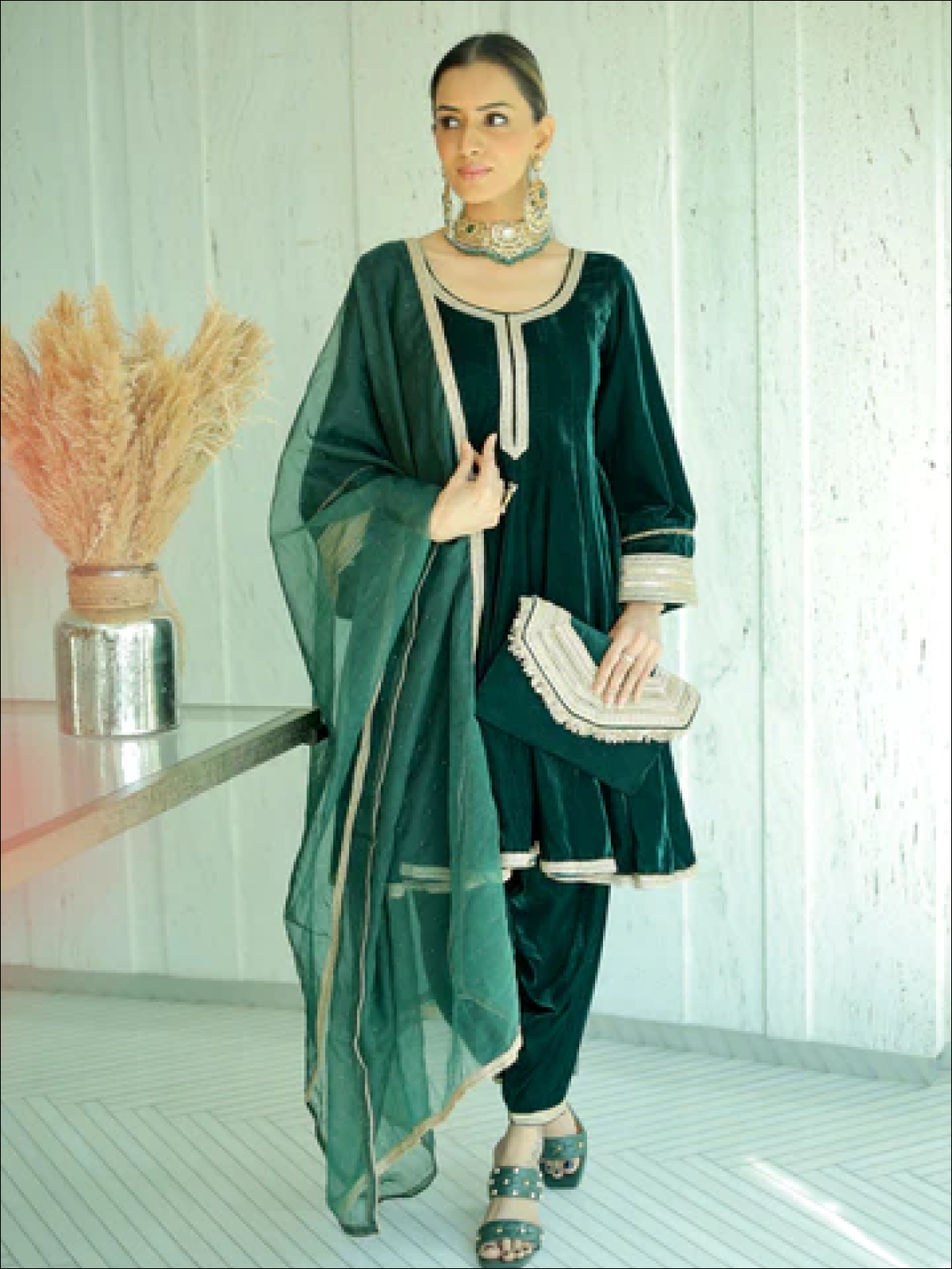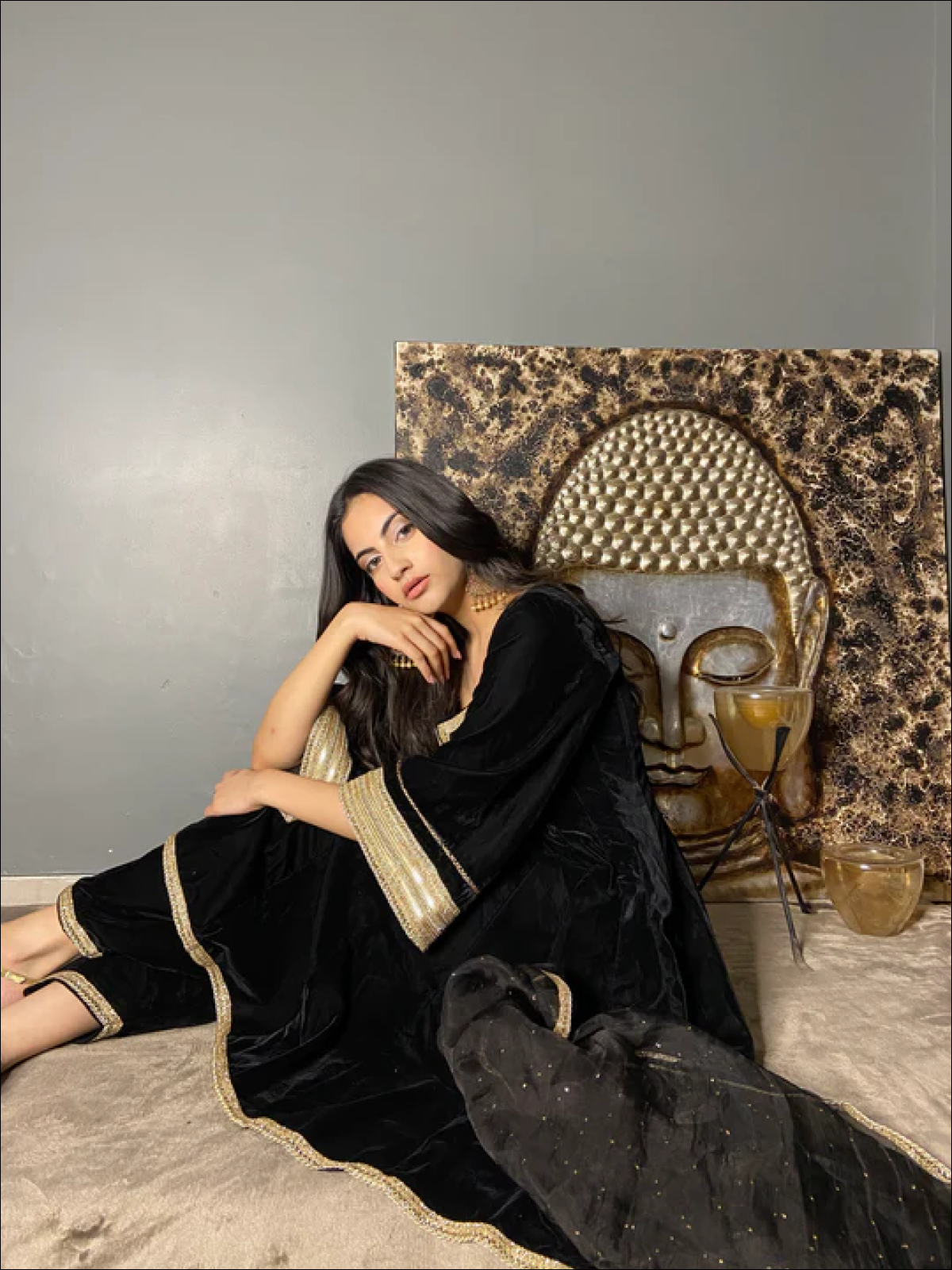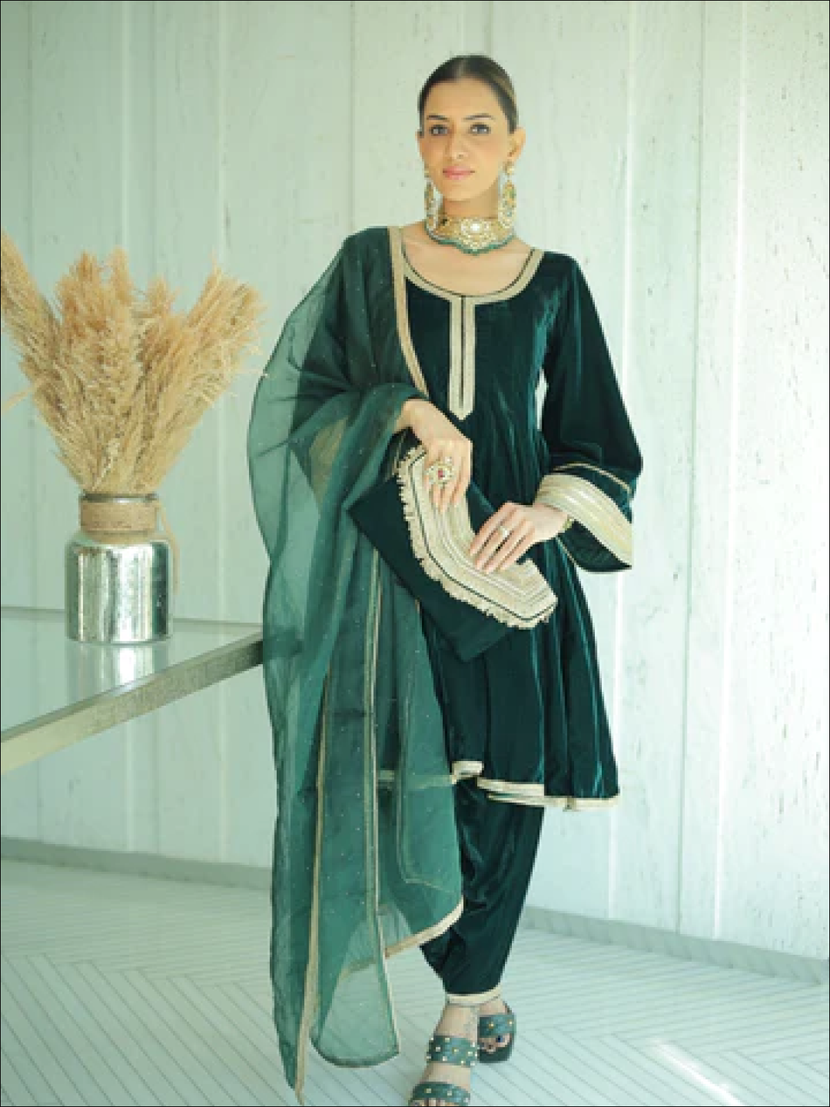 Winter and Wedding special . Pure velvet kali kurta adorned with lace on neckline, loose fit selves with lace work, and lace work on hem paired with pant heavy detailing on hem paired with matching pant adorned with lace work on bottom and matching colour dupptta with gotta lace work all over.