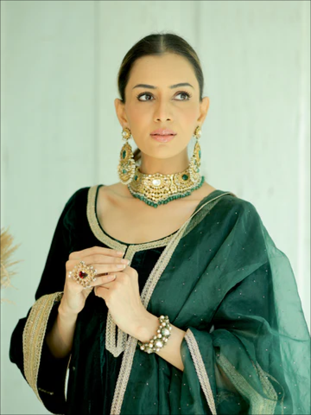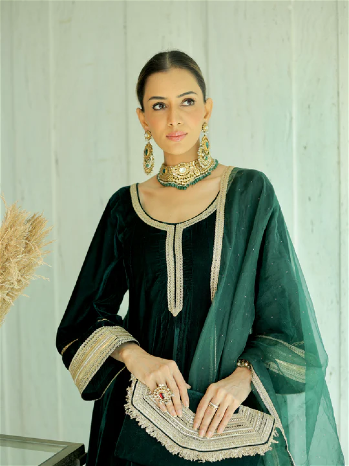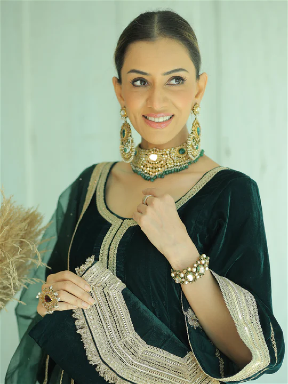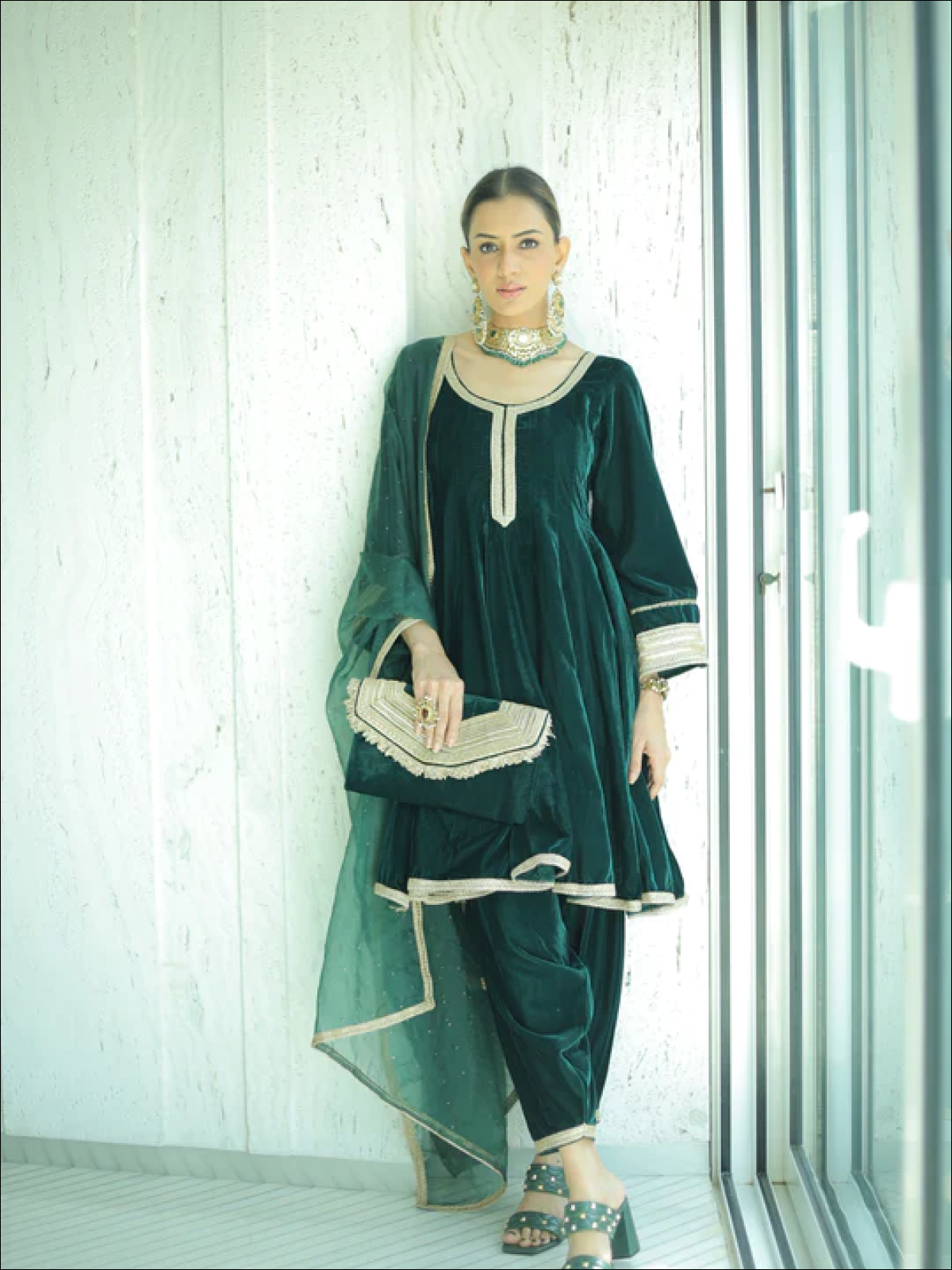 Winter and Wedding special . Pure velvet kali kurta adorned with lace on neckline, loose fit selves with lace work, and lace work on hem paired with pant heavy detailing on hem paired with matching pant adorned with lace work on bottom and matching colour dupptta with gotta lace work all over.