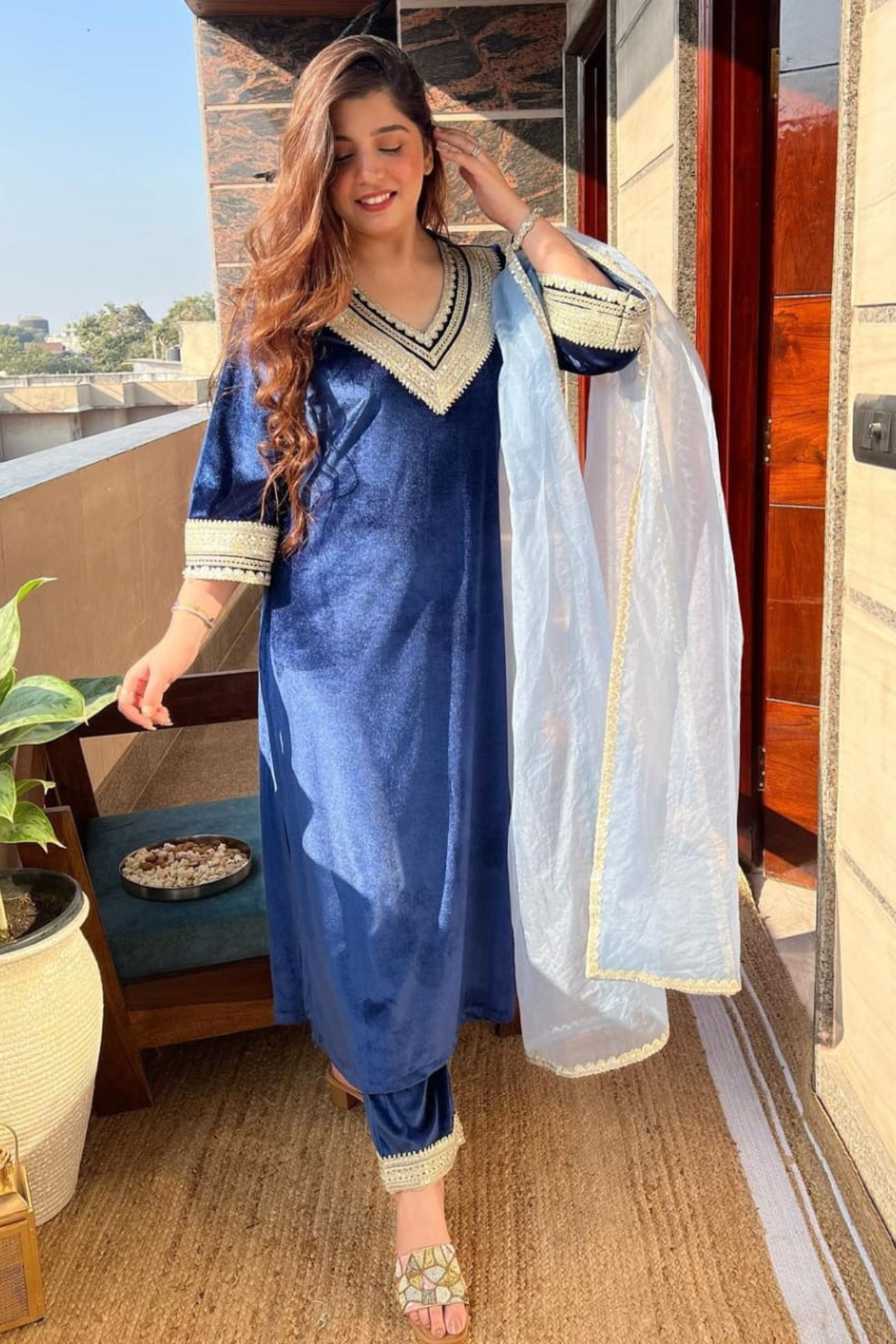 decorated with finest Velvet Kurti and velvet pant with organza dupatta with lace.