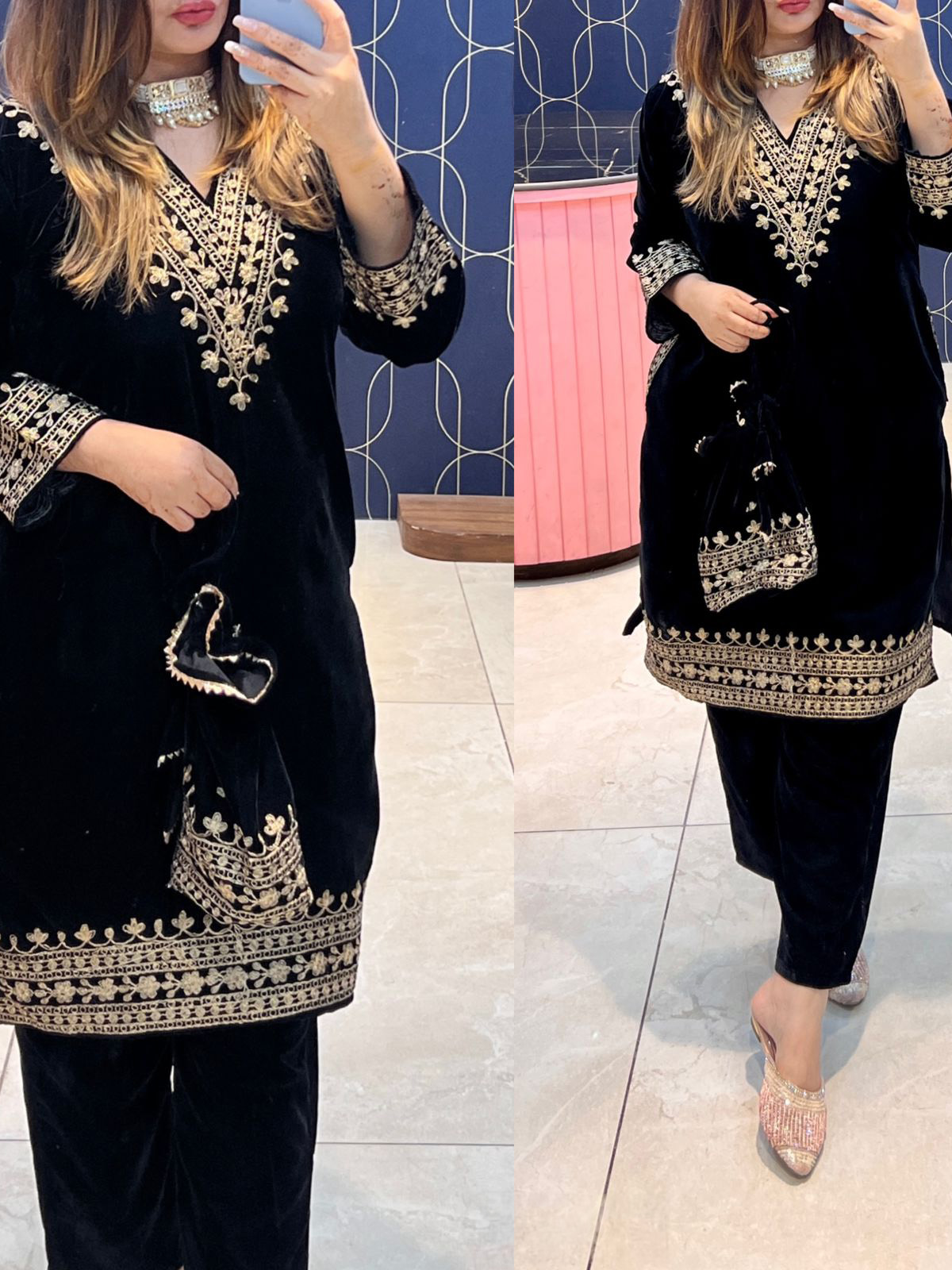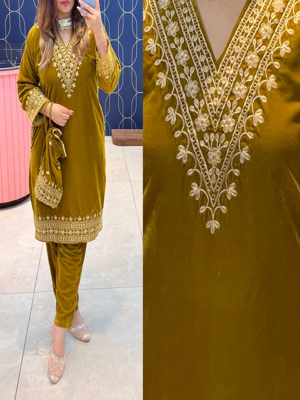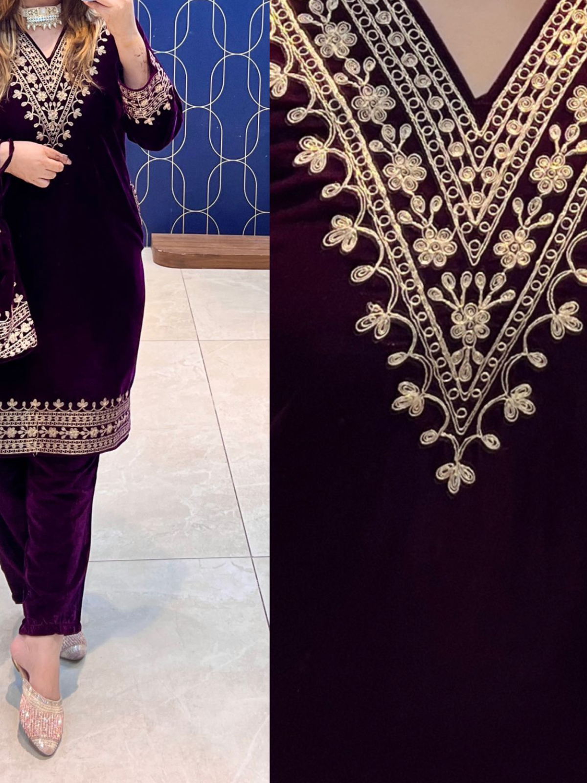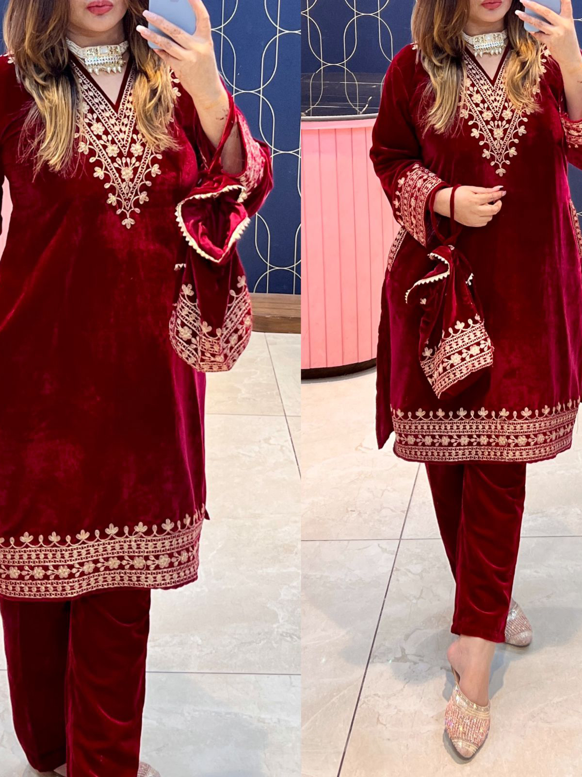 An outfit for this wedding season. Made with high quality of velvet , it is a must in your wardrobe. The golden thread embroidered work on the neck makes it a perfect wear for any wedding.
