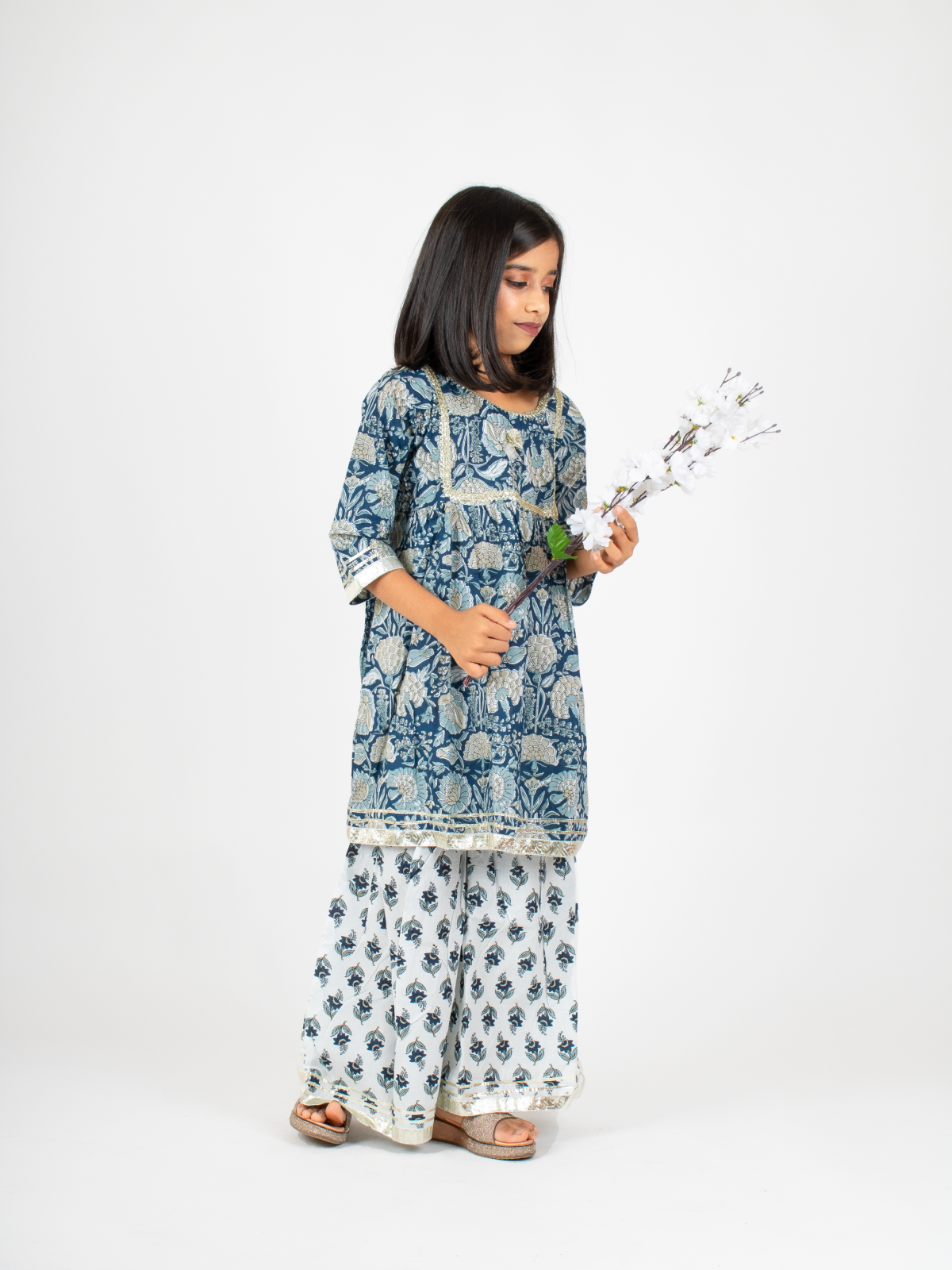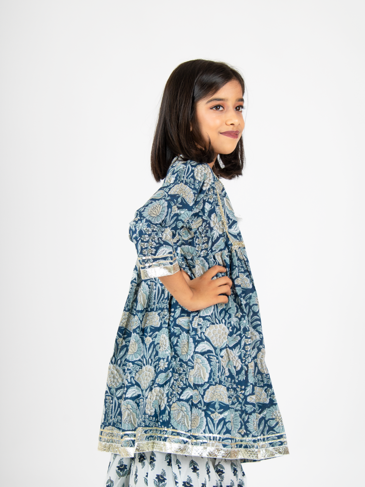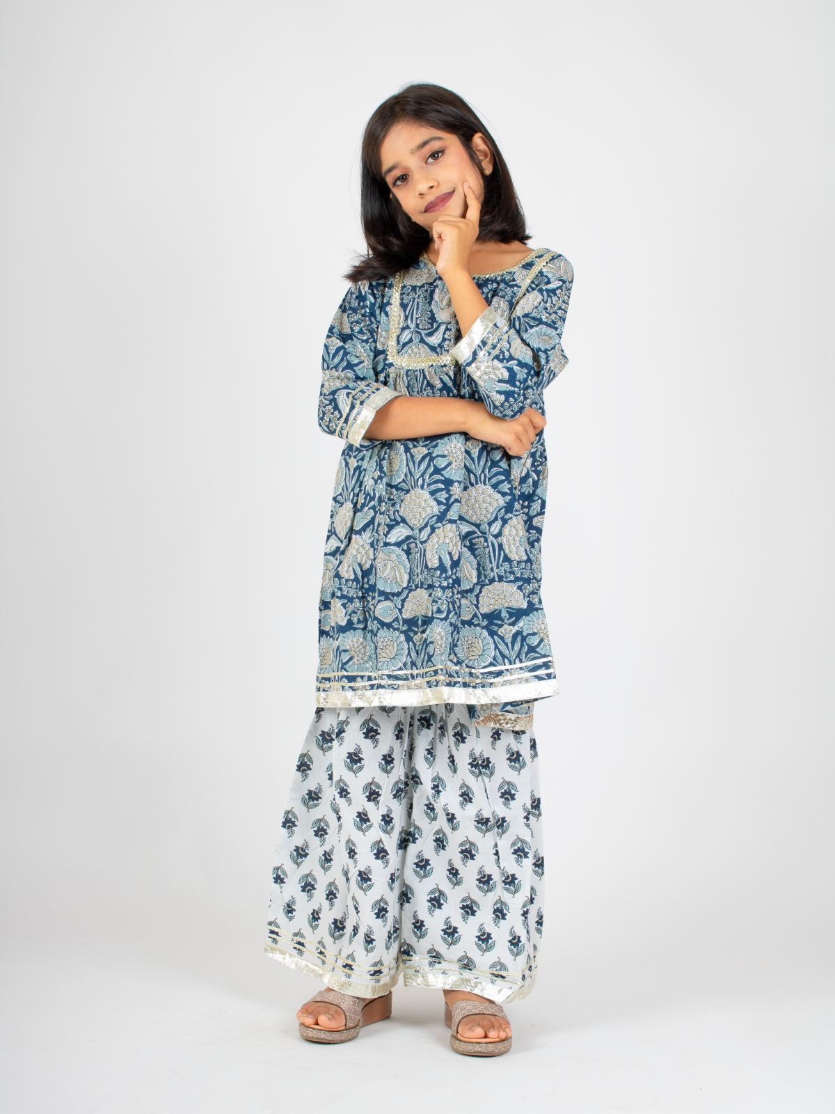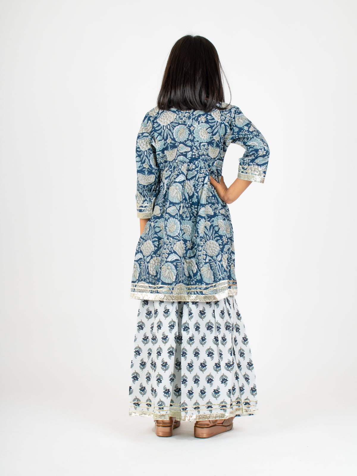Get this jaipuri kurta and sharara set for your little doll this festive season. This girls ethnic set is perfect for this festive season and will keep your little damsel comfortable in this 100% cotton dress!