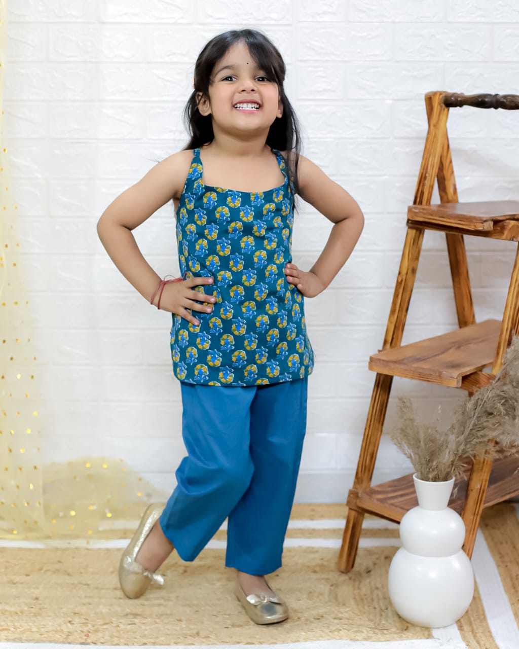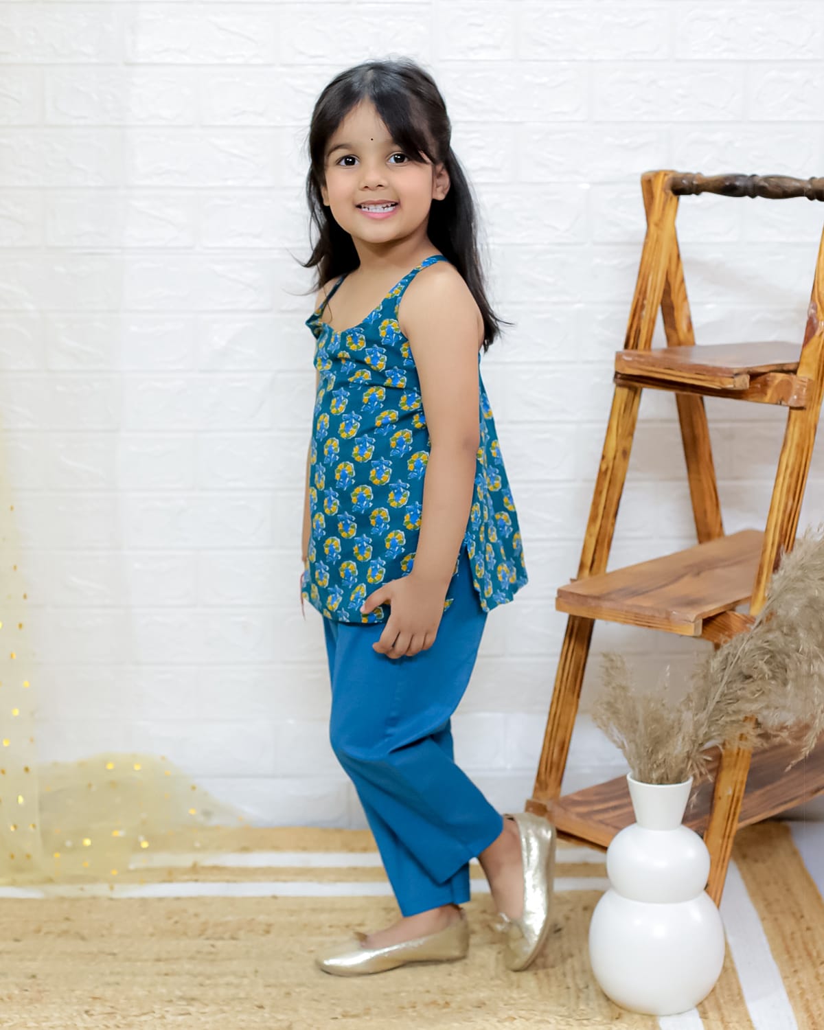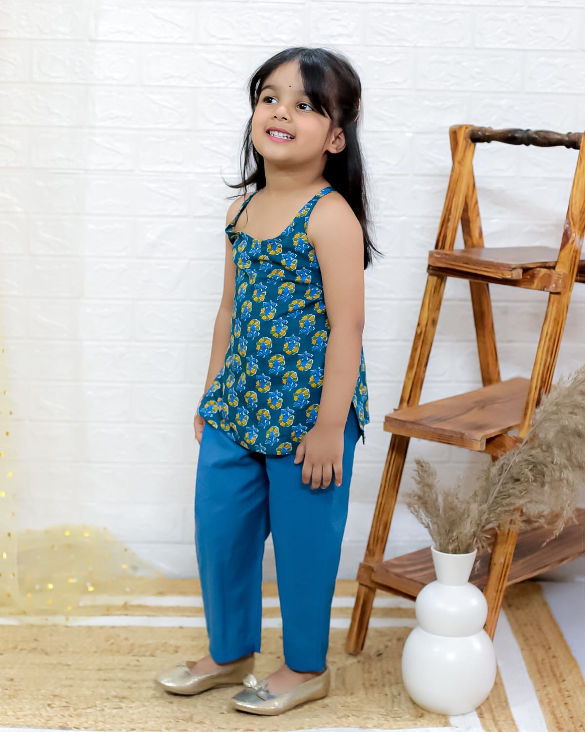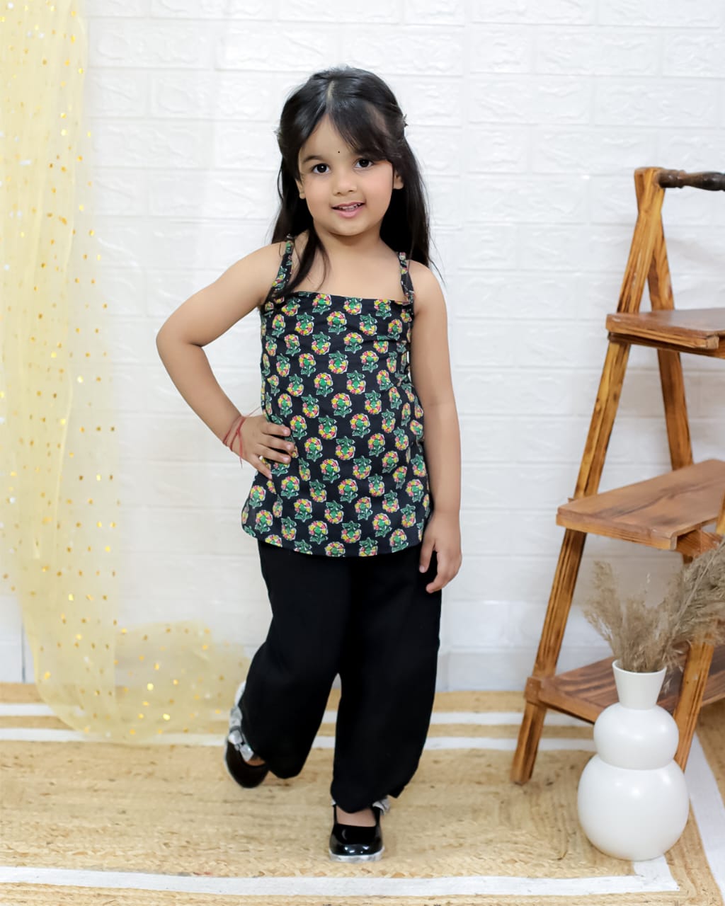 This is perfect this summer for your little girl. It has a sleevless shoulder cotton printed top with adjustable strips