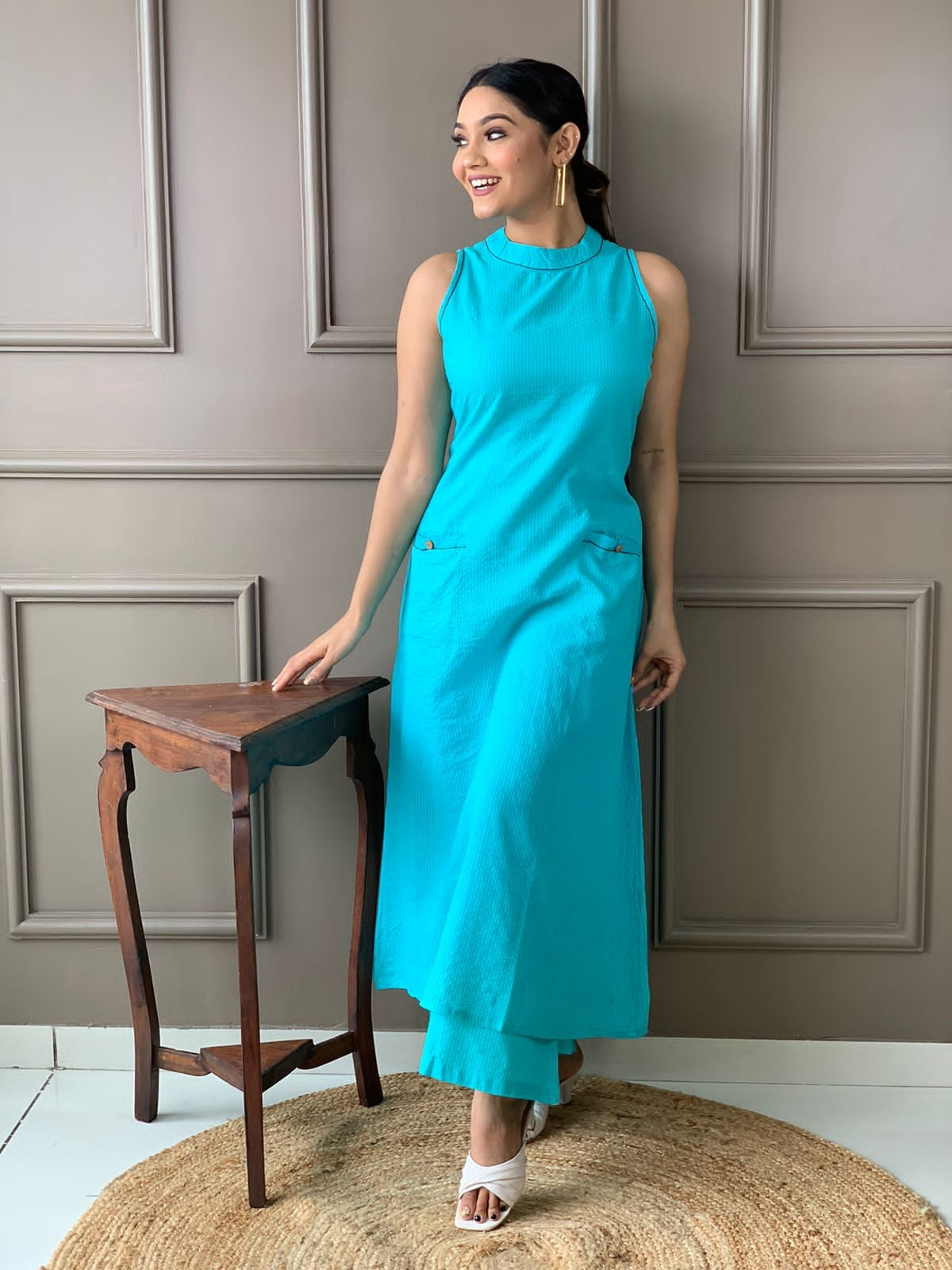 A gorgeous outfit in cotton with palin stripesd a line kurta and pants . A great outfit with formal look for office wear.