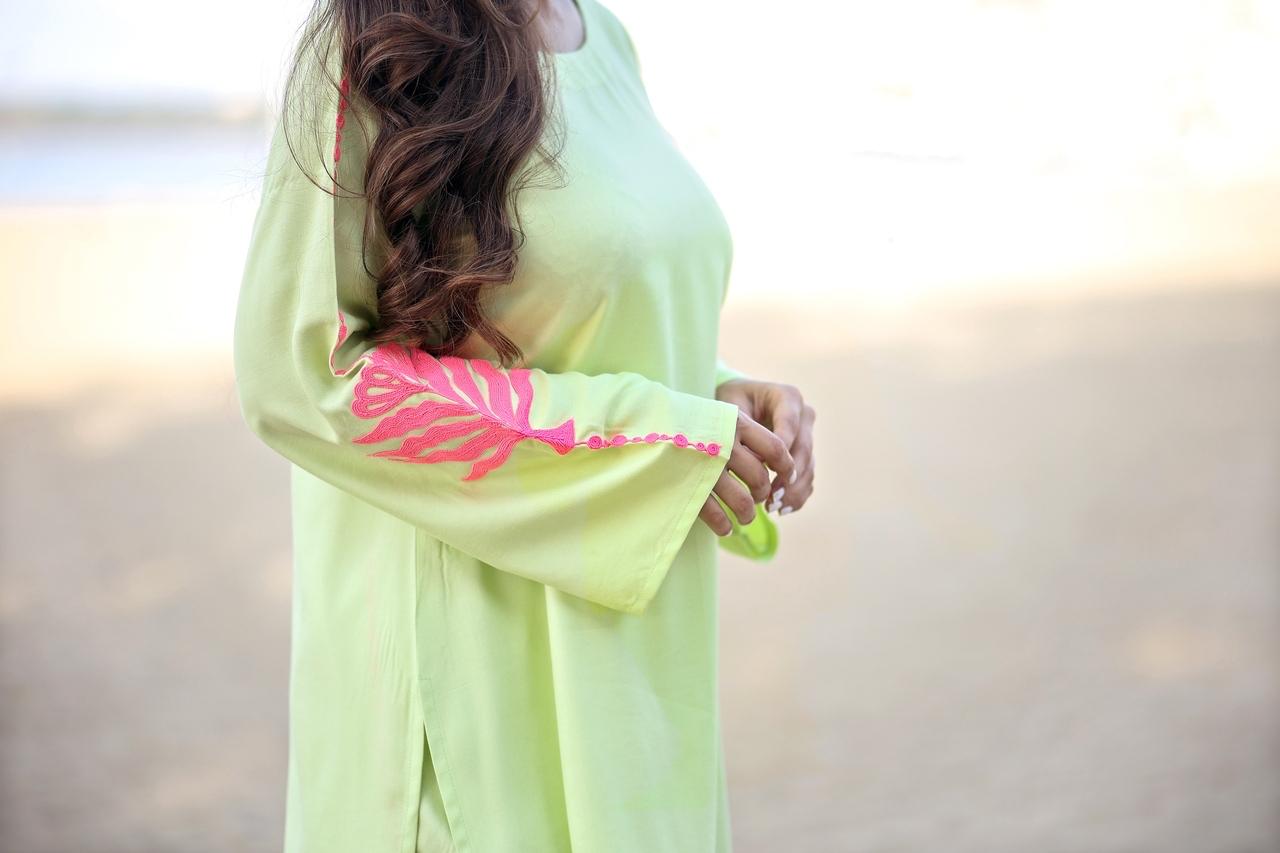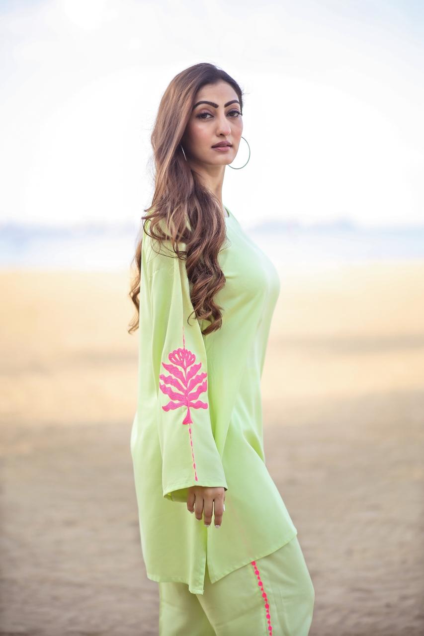 This set is perfect for all the formal gatherings. It has aari tari work on the sleeves which will surely be a style statement