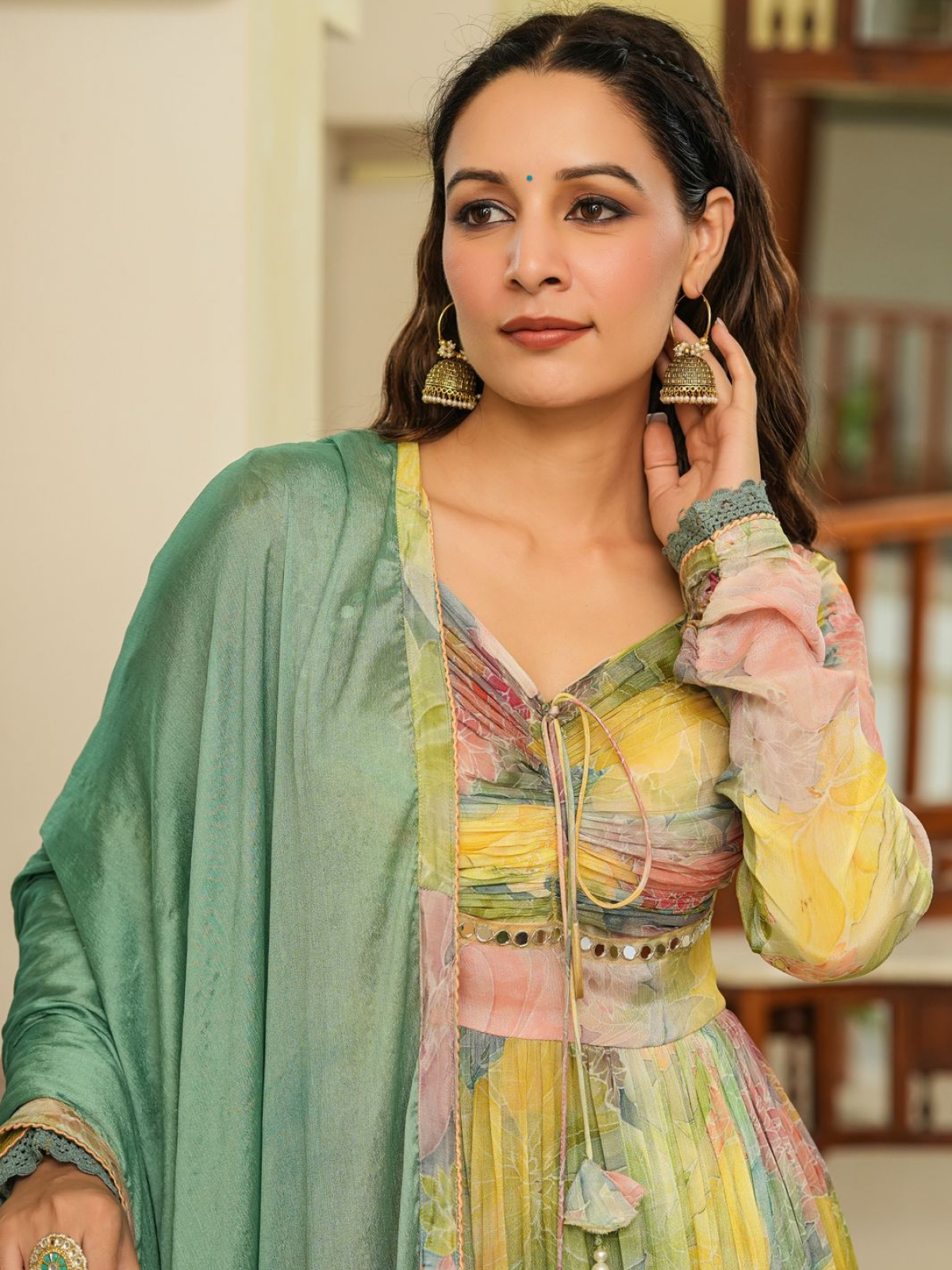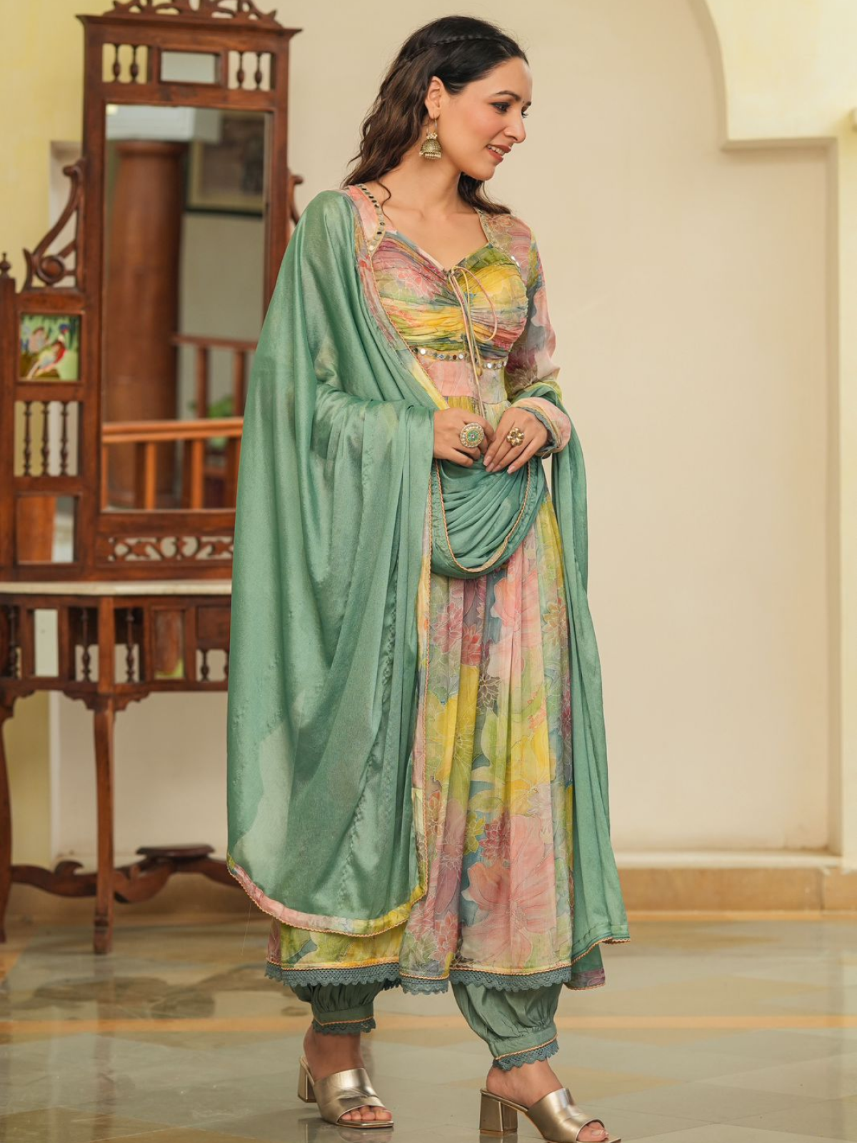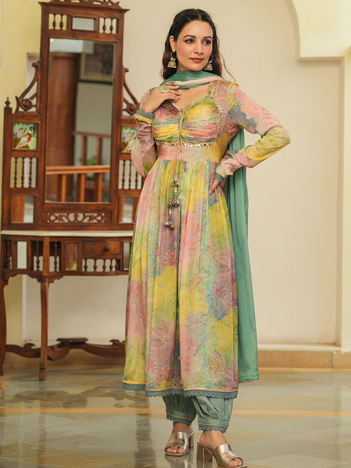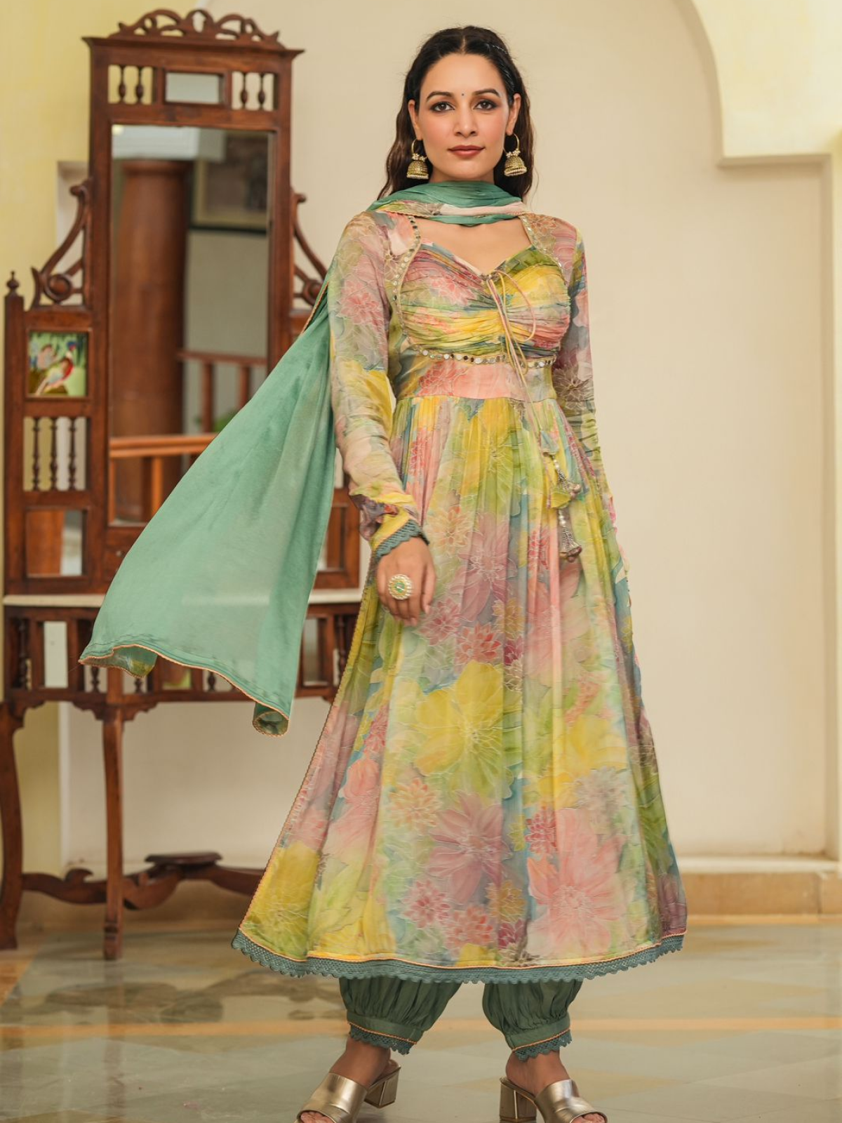 Beautiful outfit with anarkali kurta with afghnai pants to enhance your look. A epitome of femininity, a must have in your collection. A perfect outfit for evening dinner or any wedding ceremony.