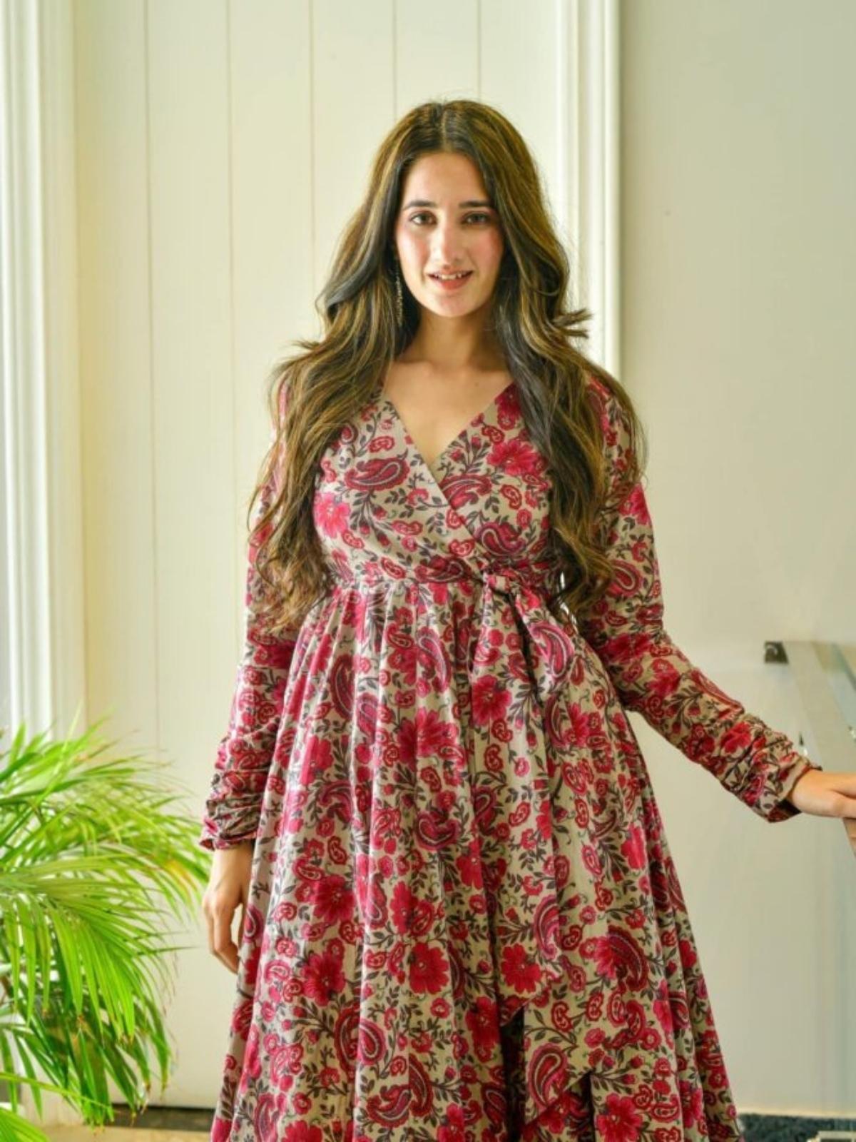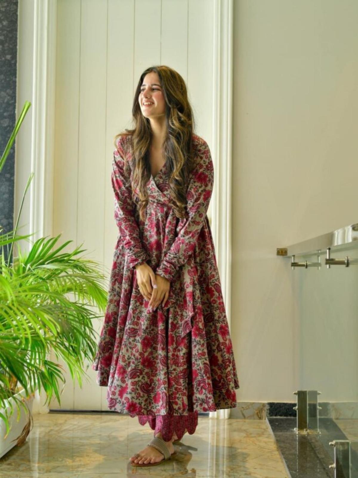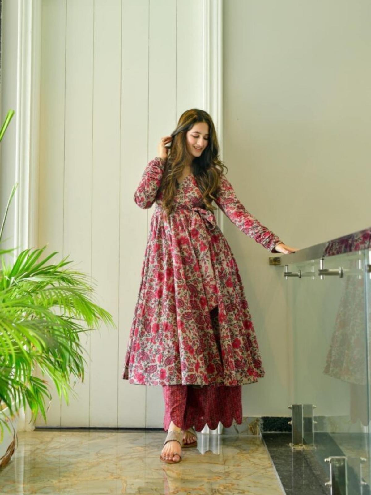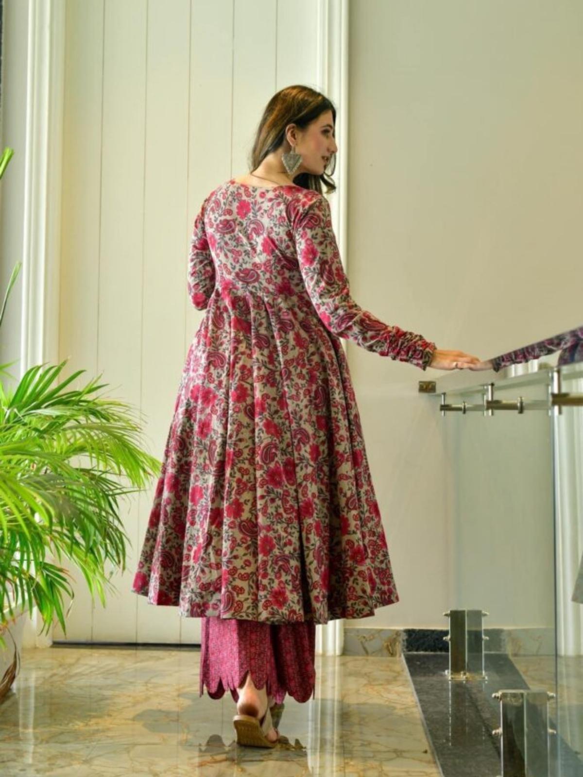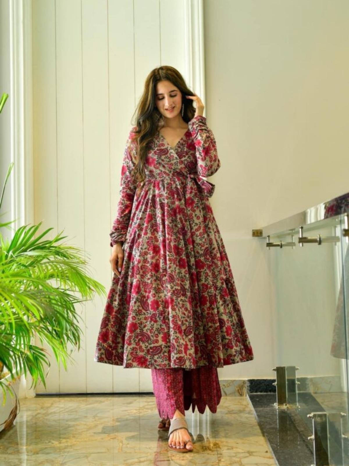 A traditional and ethnic printed outfit with designer pants for all your special occassions. This pretty set is made from heavy rayon this set is designeed especially for all the pear sahped women.