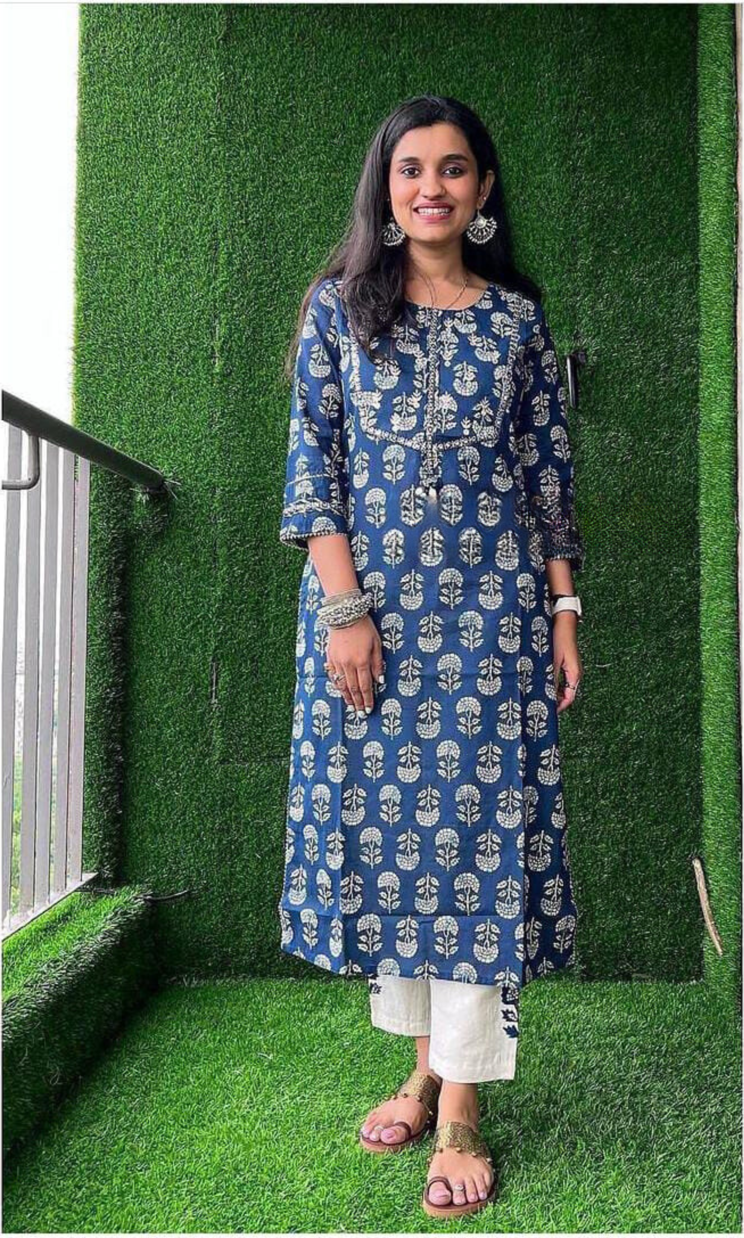 Get this beautiful cotton 60'60 pant set with embroidery on sleeves and front(with gota lace). This hand block printed kurta is a perfect outfit for everyday formal wear.