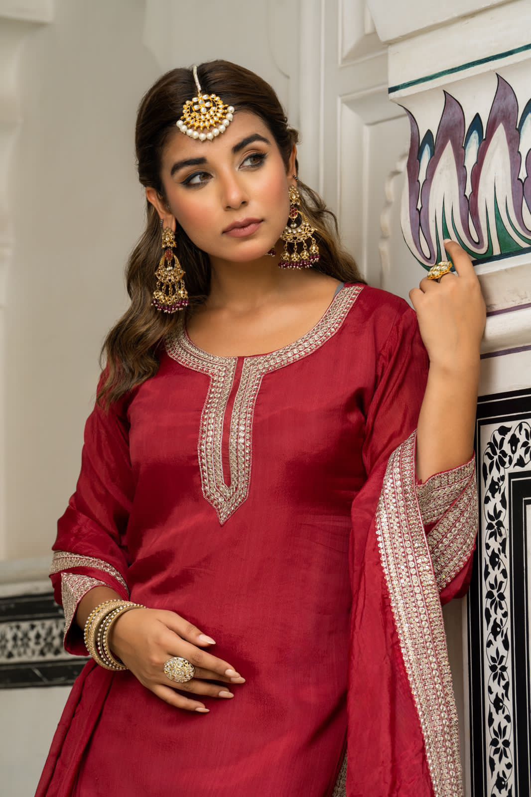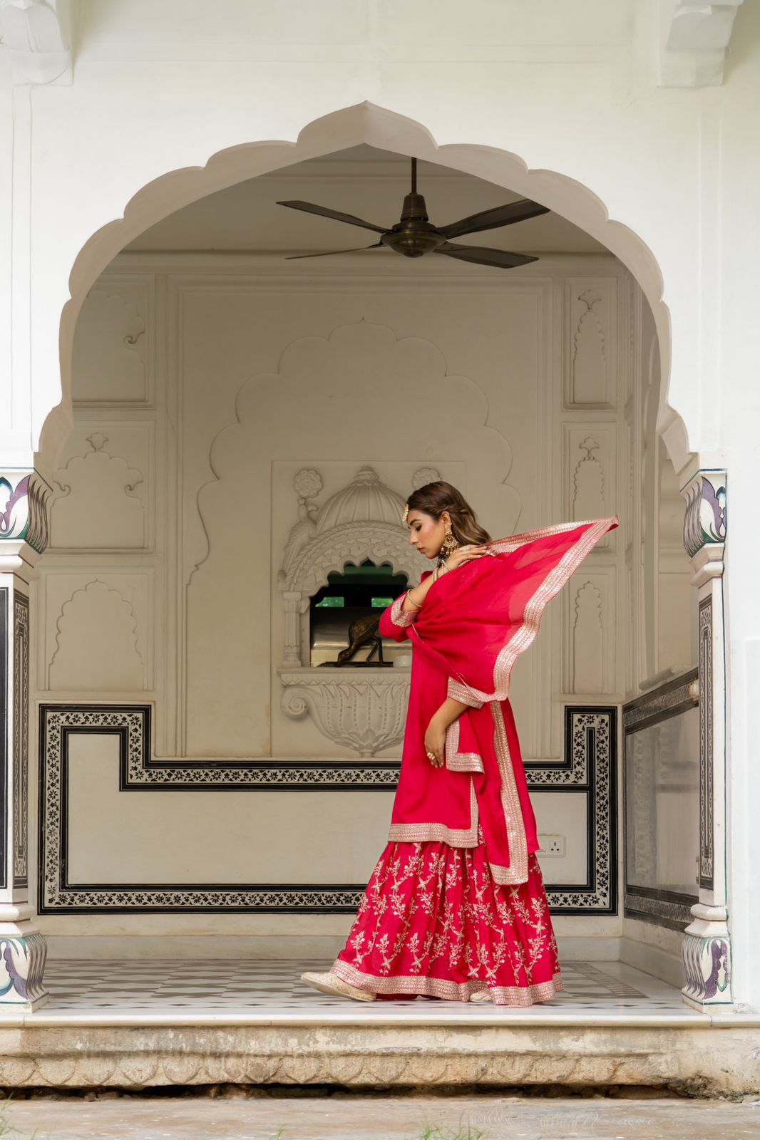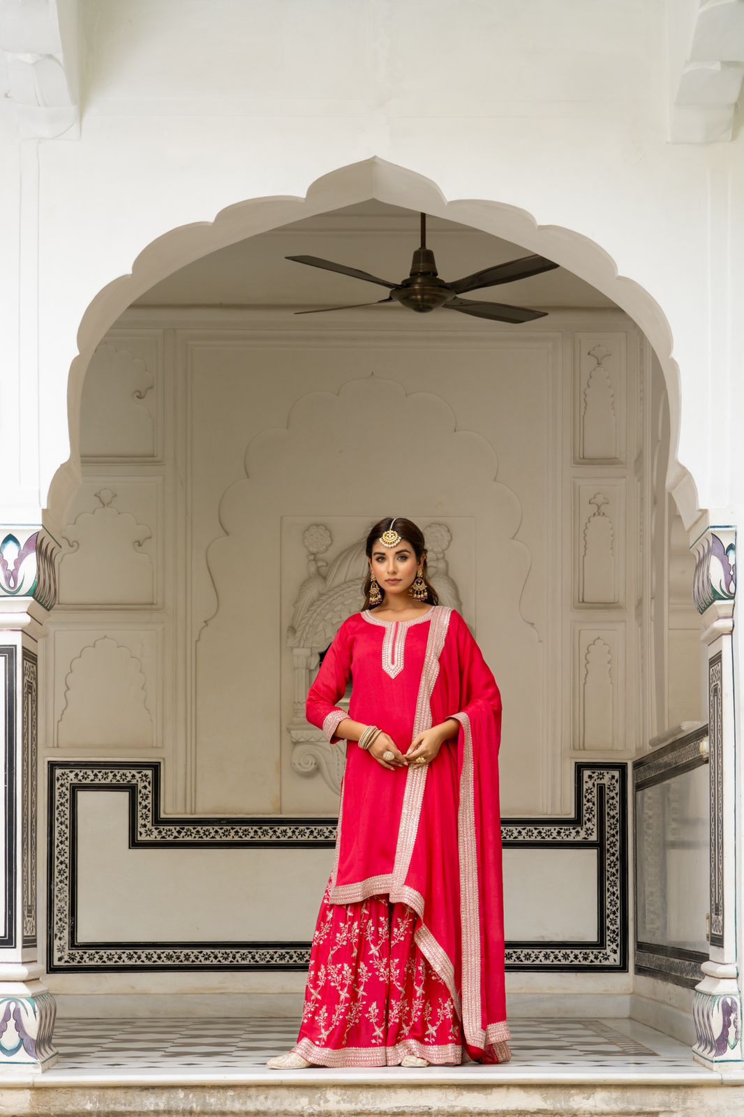 Pure chinnon Sharara suit with full embroidery work. This outfit is just perfect for a festive gathering or wedding ceremonies.