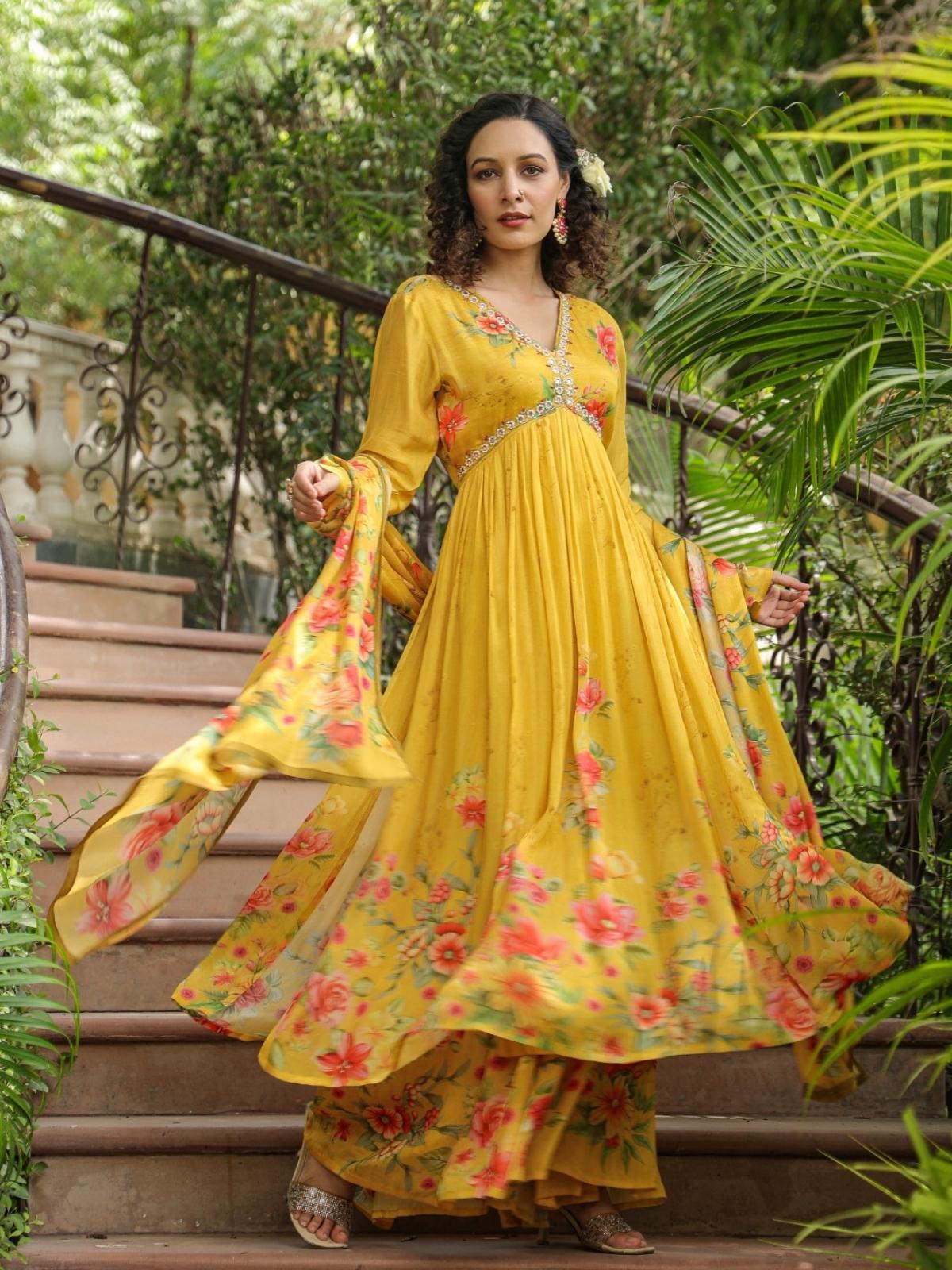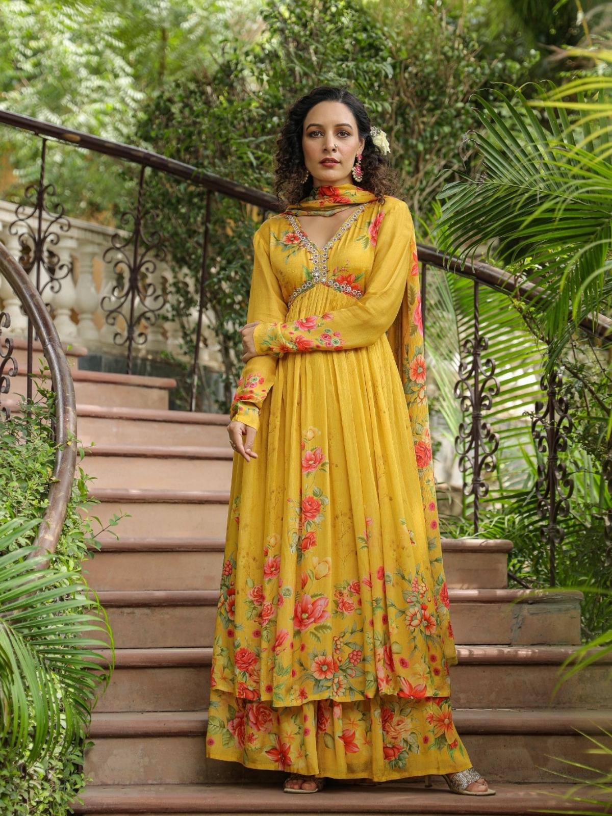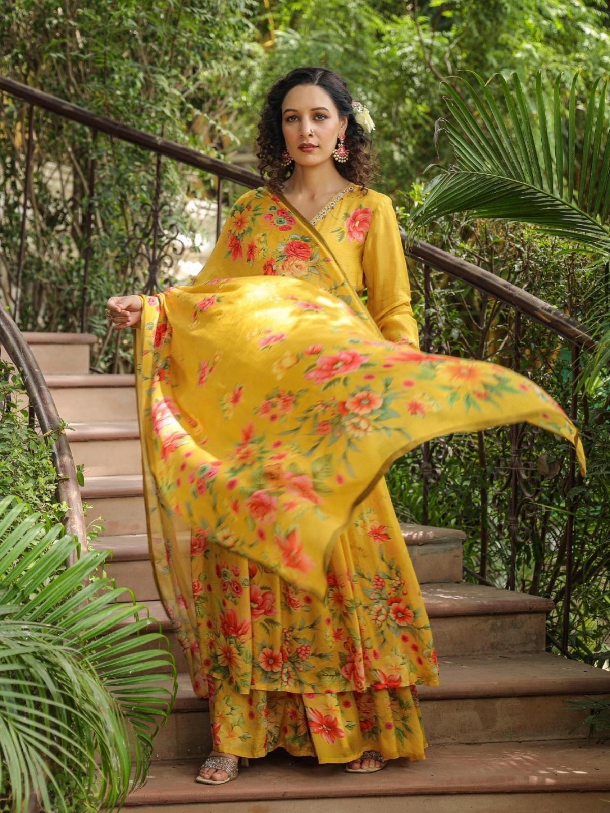 A traditional outfit with alya cut kurti with work on the yoke. The floral print is perfect for all the gorgeous ladies. A three piece set with kurta , sharara and dupatta will look amazing with a pair of heels.