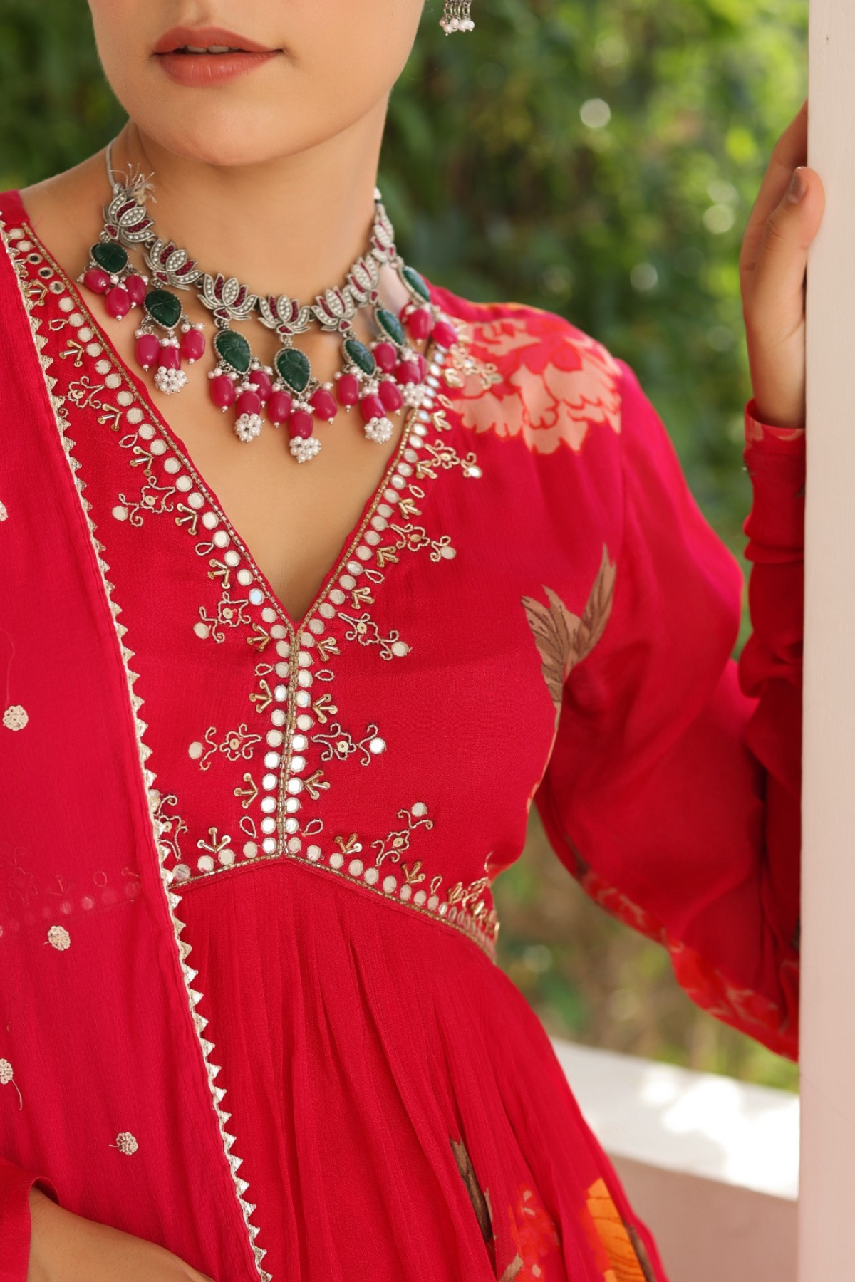 This beautiful chinnon long dress with dupatta and pants is a must in your wardrobe. It has a beautiful work on yoke to give it a formal look.