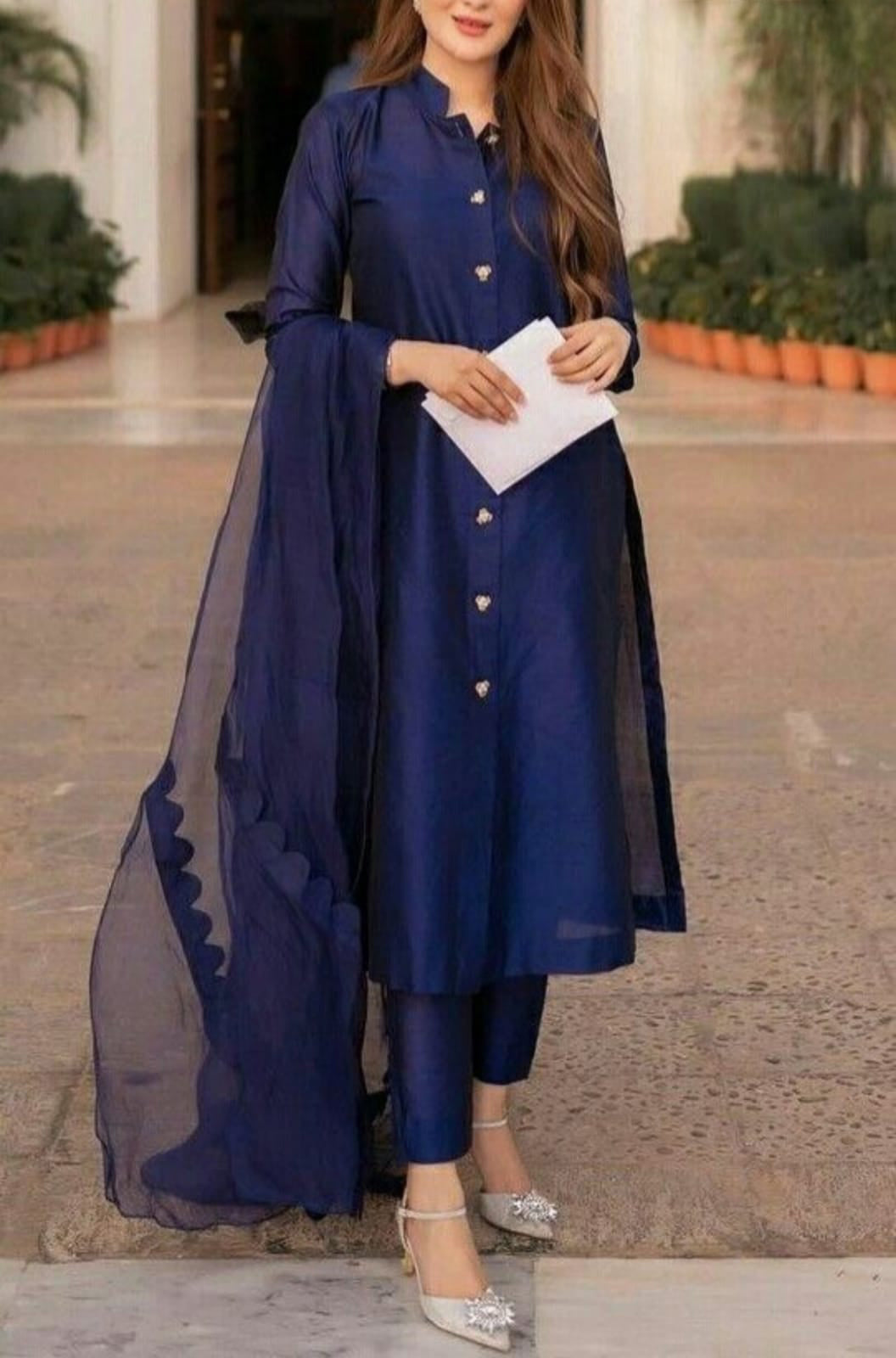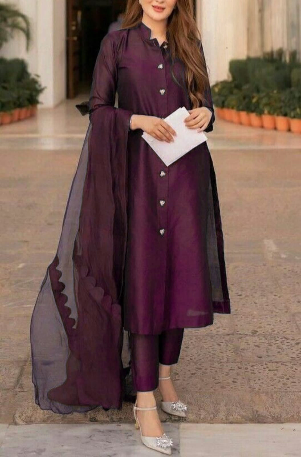 Chanderi Kurti with Beautiful Swaroski Buttons on Front with Chanderi pant with Cotton Lining in both Kurti n Pant completing the Outfit with Organza Dupatta having*
