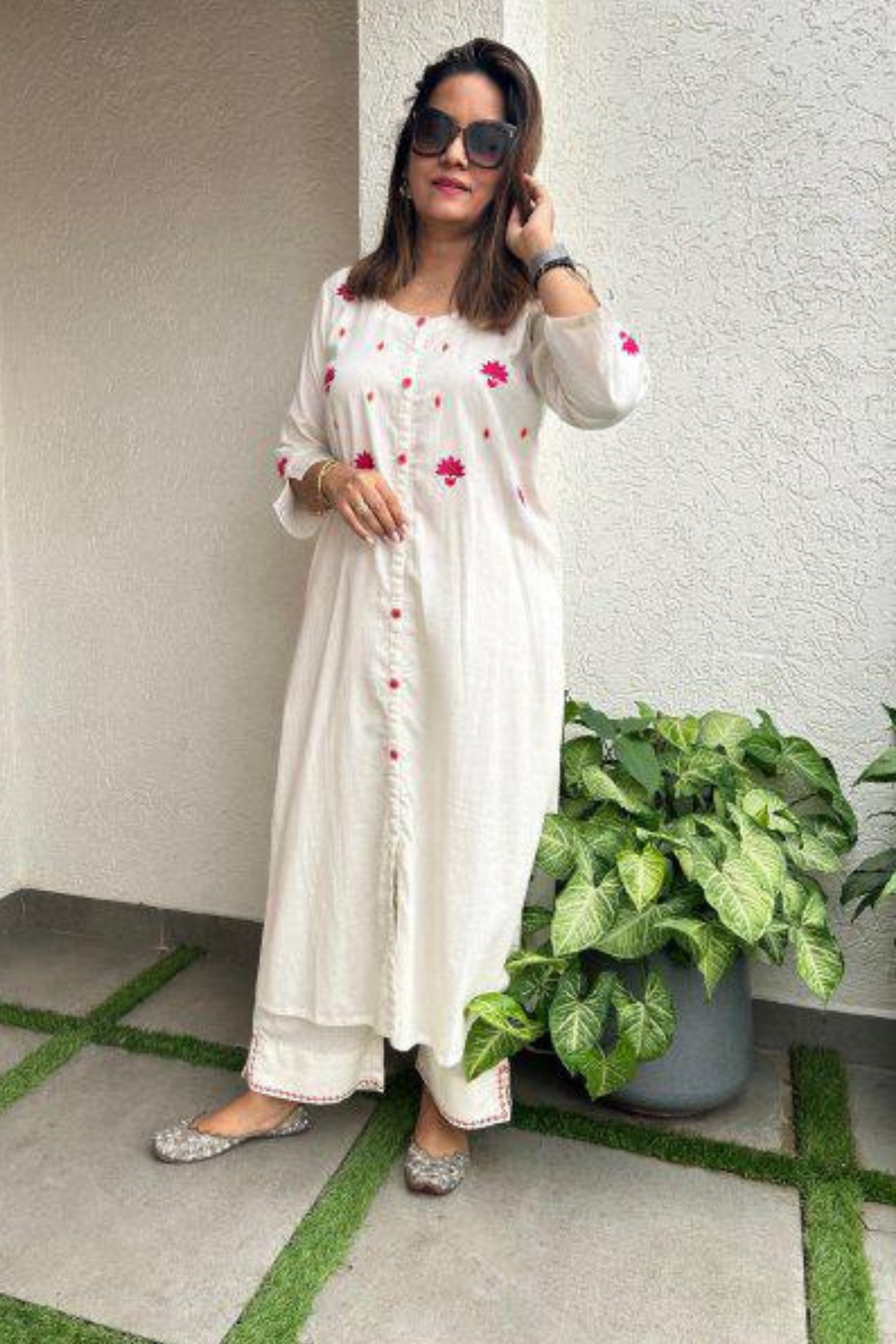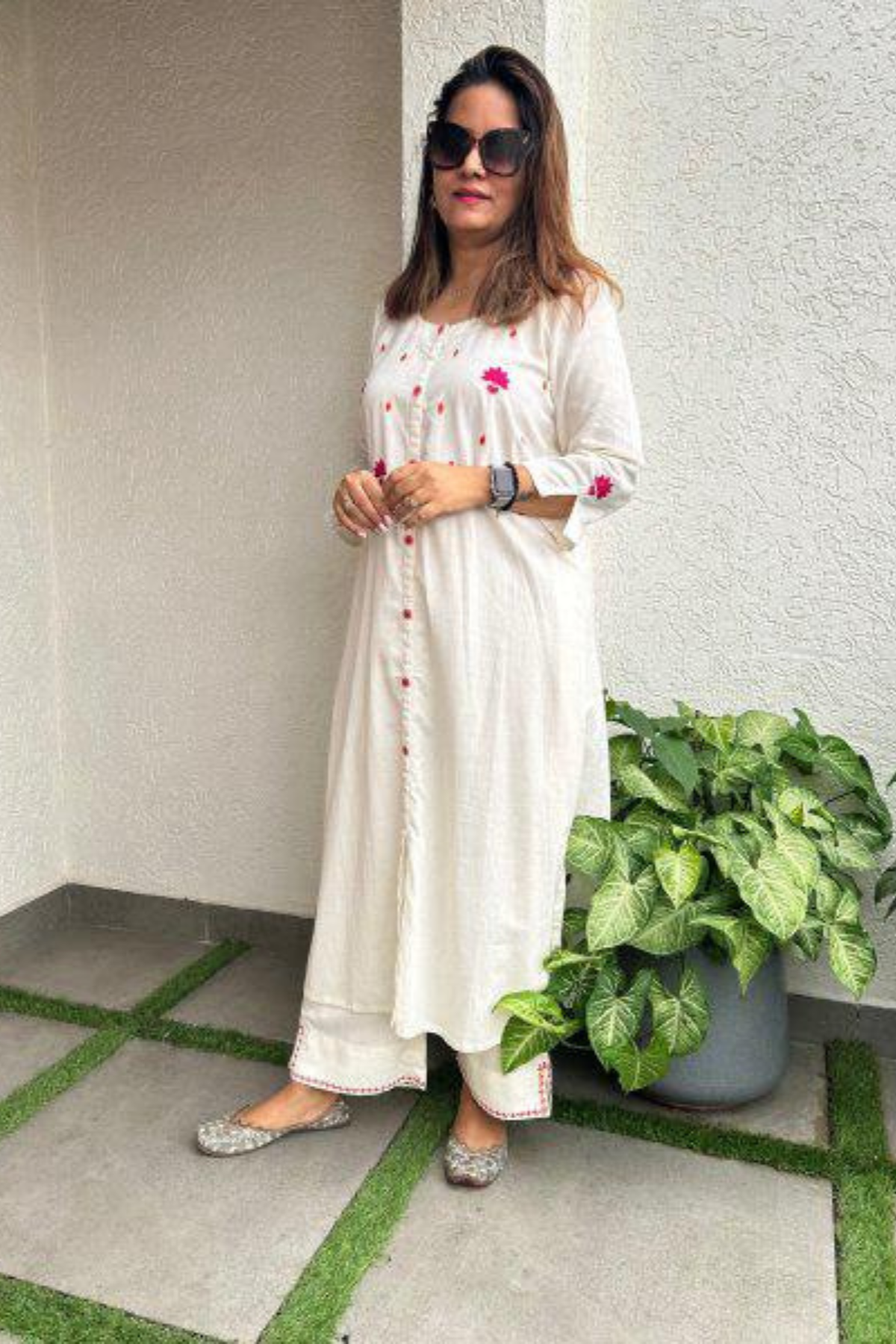 Upgrade your office wear wardrobe with this classy  pant-set and embroidery detailing for all day comfort and trendy look.