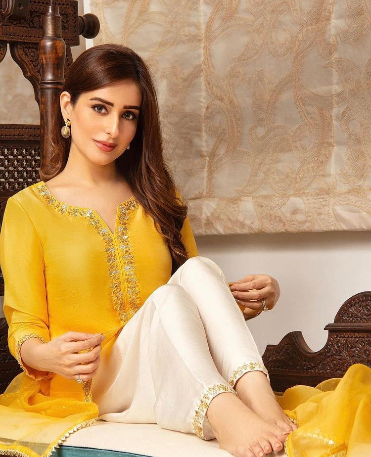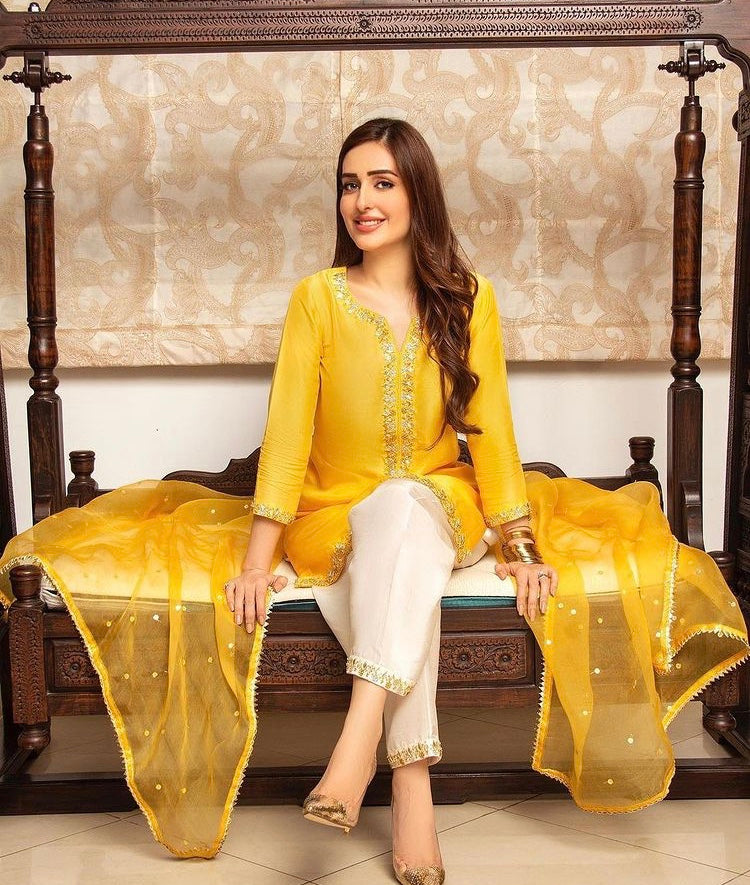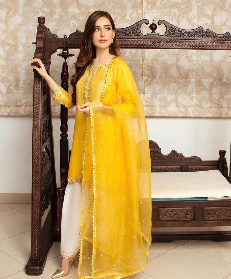 Straight cut kameez has been beautified crafted with lace work. Comes along with a jam silk pant and a matching Najneen dupatta with Gold print.