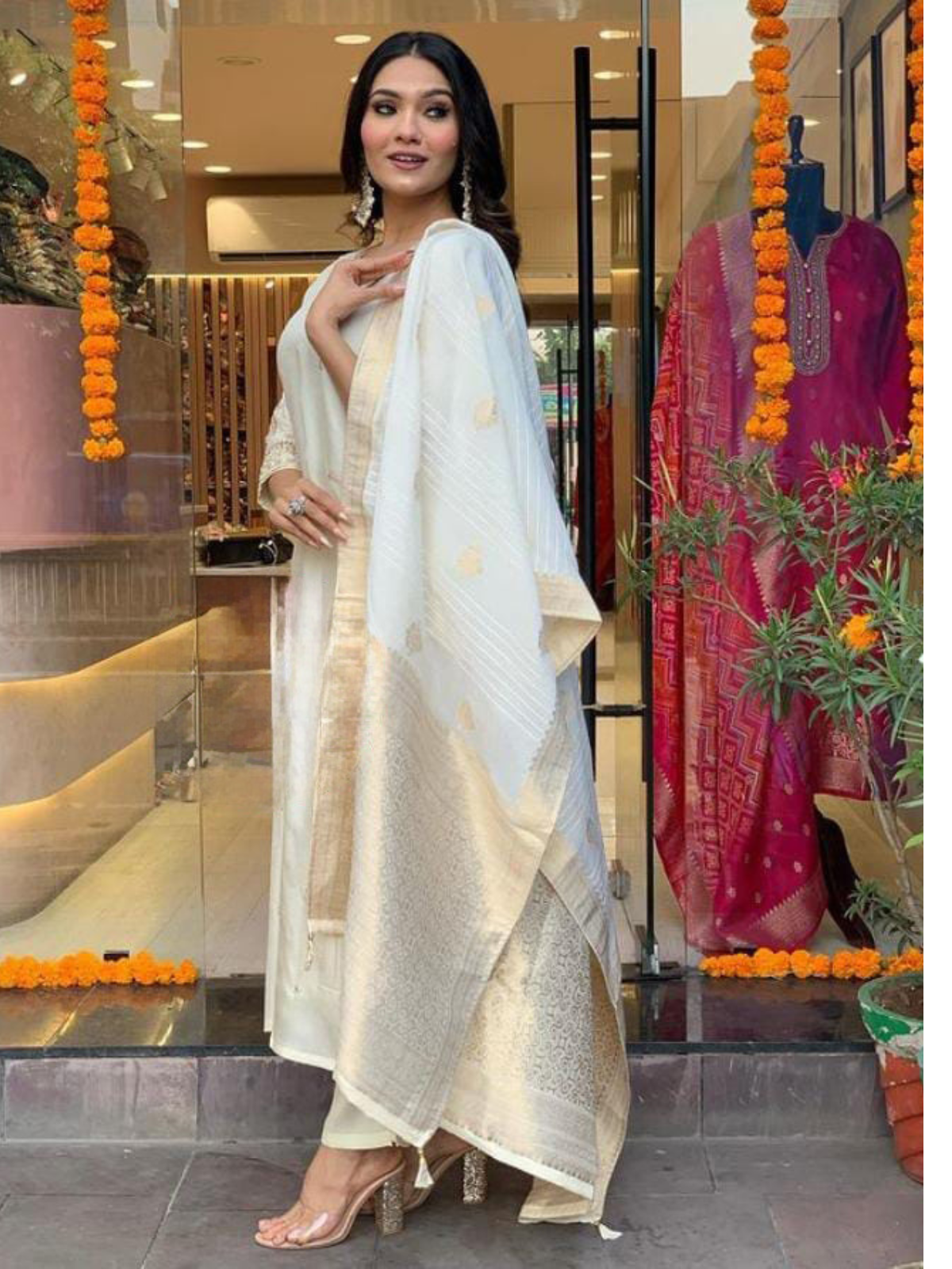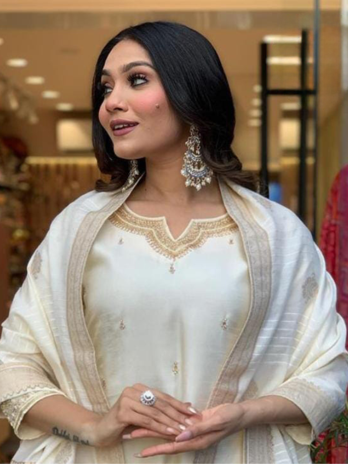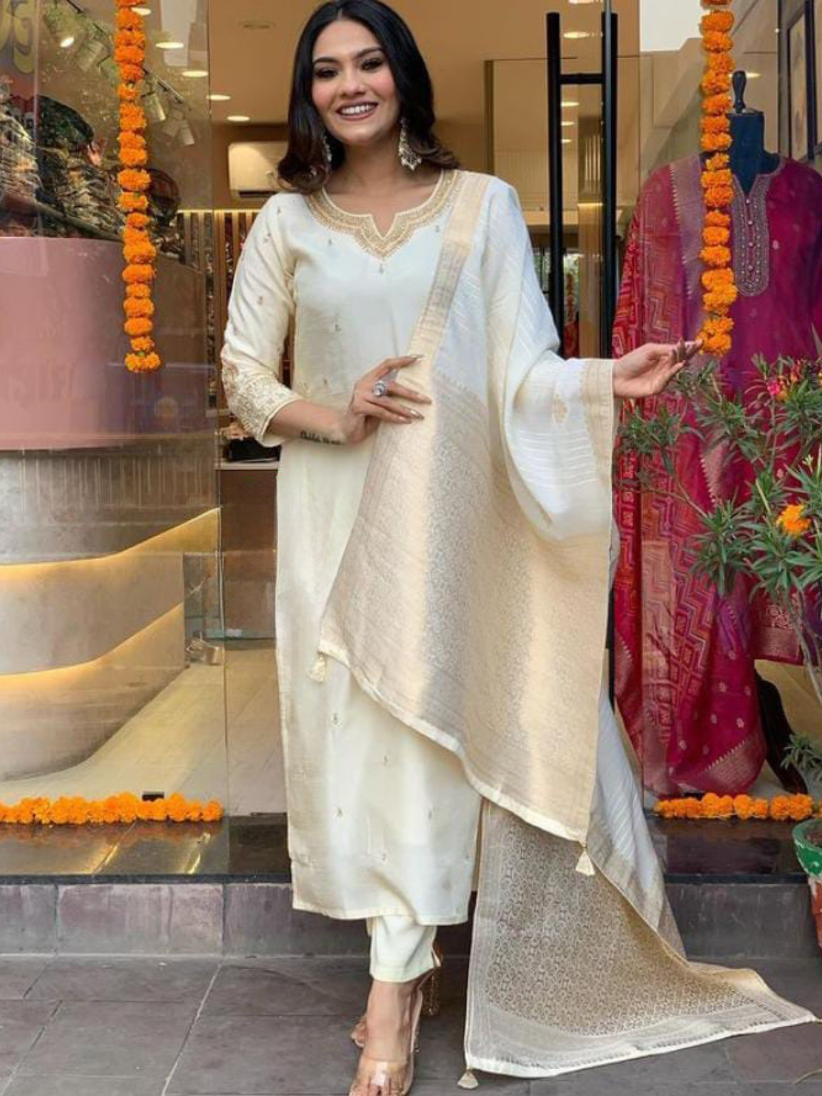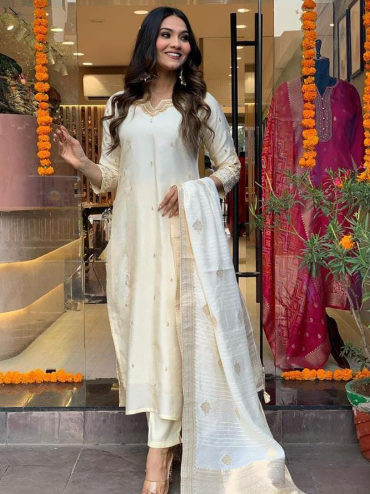 Unleash your inner Diva  with this Beautiful Premium Dola silk kurti with work on yoke and sleeves paired with pant where premium Dola Silk duppata is adding the glam to the look !!