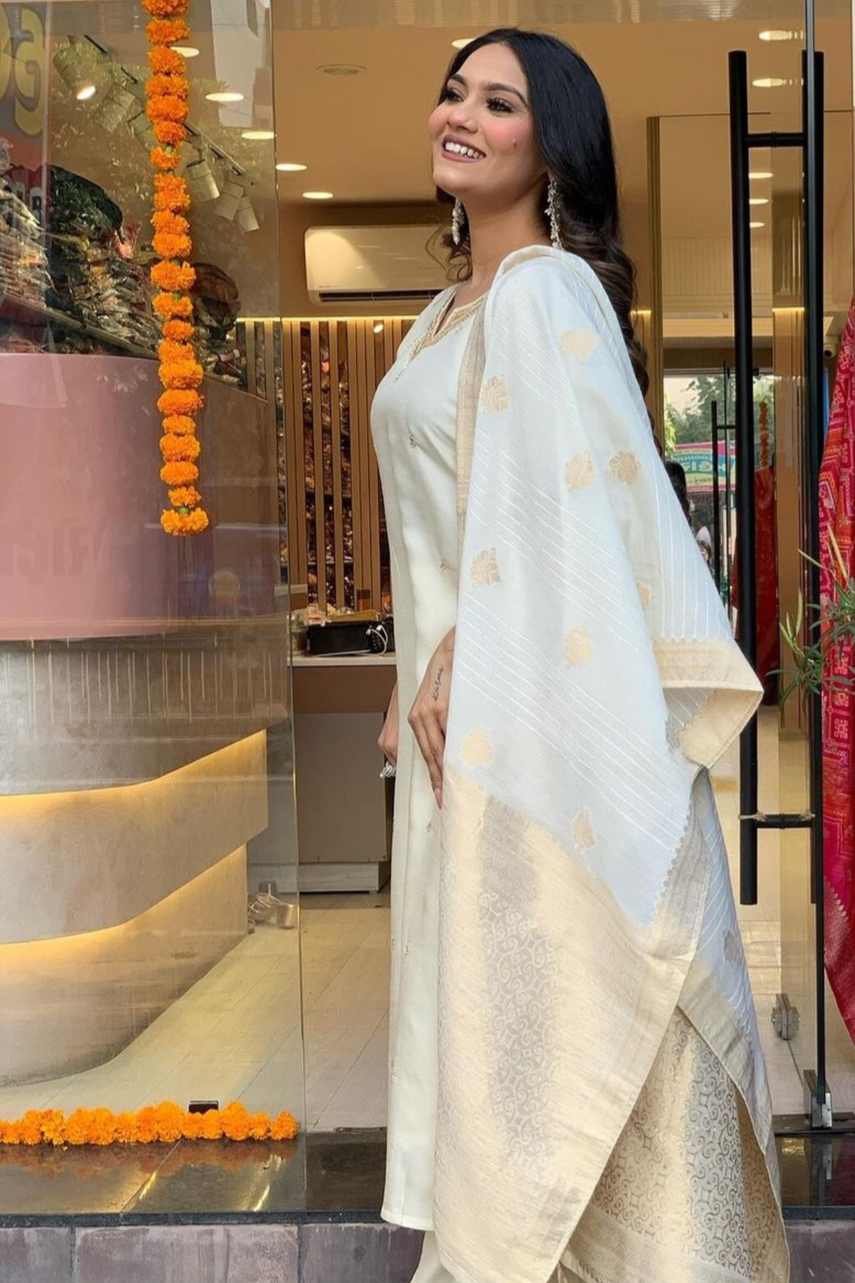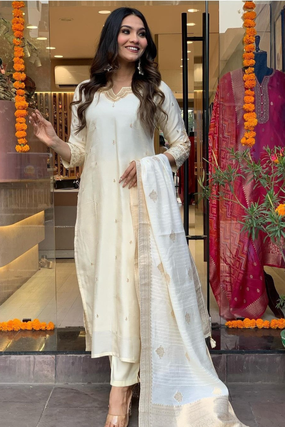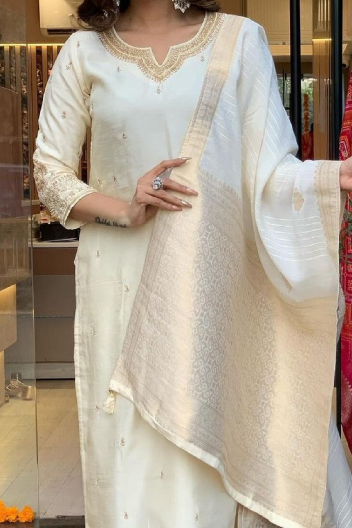 Exclusive Party Wear Suit with Heavy Exclusive Handwork on neckline, sleeves and all over the kurti paired with Matching Pant,completed with Heavy banarasi dupatta