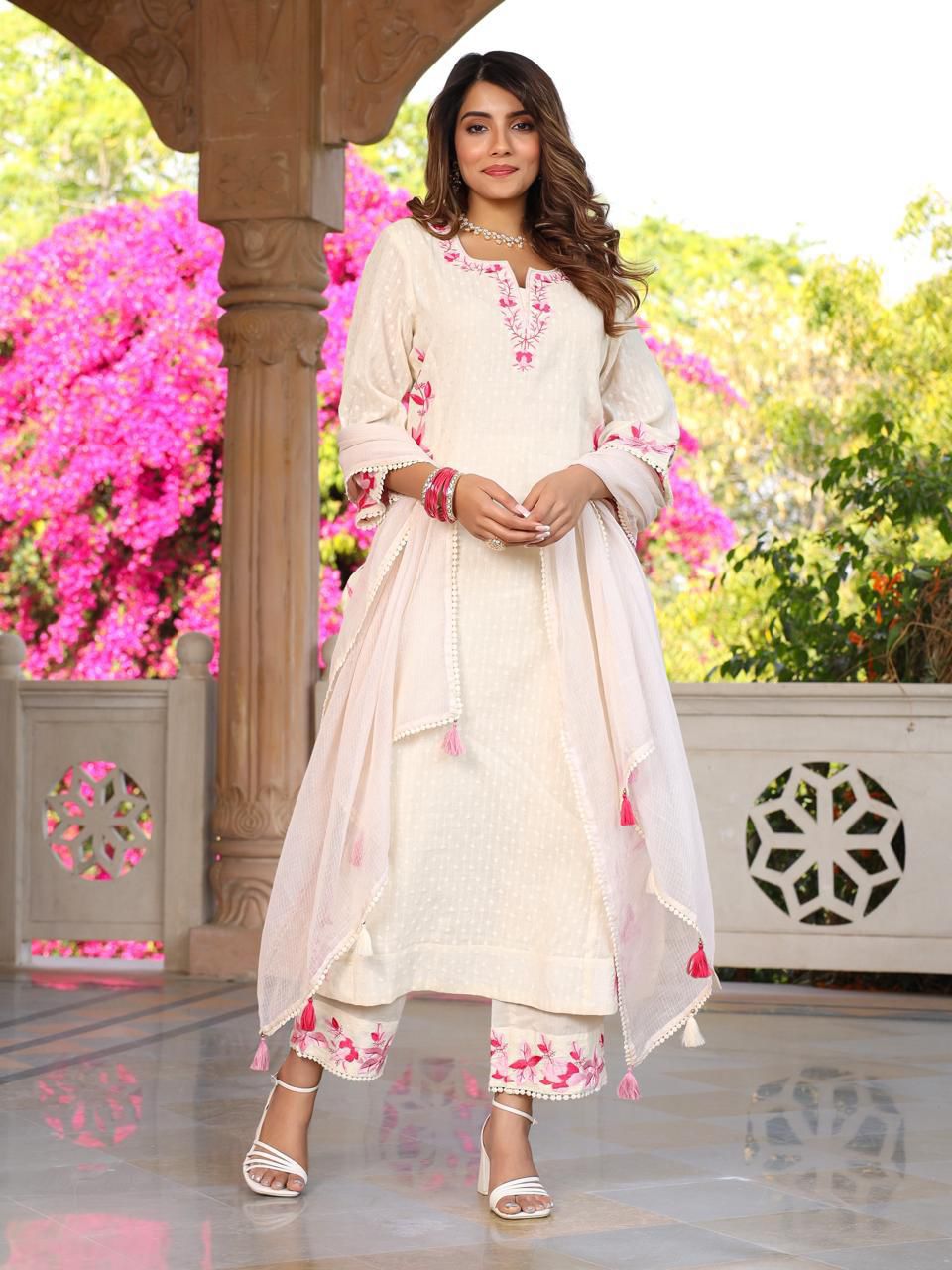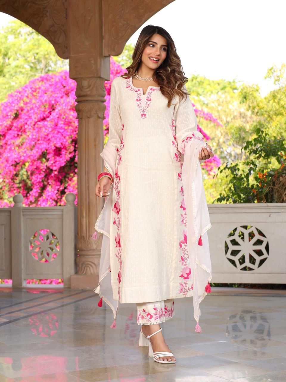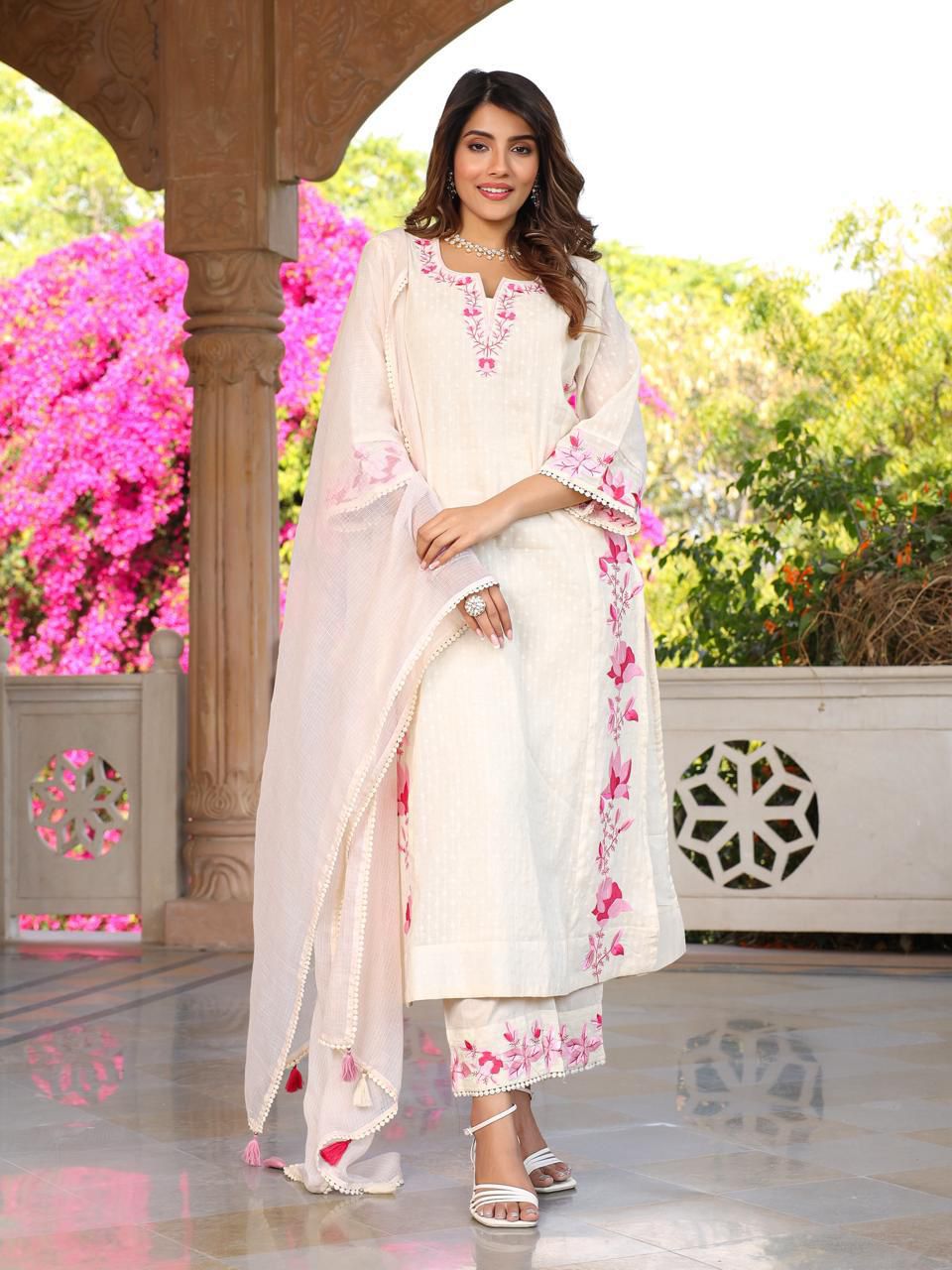 A perfect formal and party wear outfit. Made with cotton and beautiful dobby embroidery. This set is for sure a must in your wardrobe. All the gorgeous ladies get ready for the lovely compliments.
