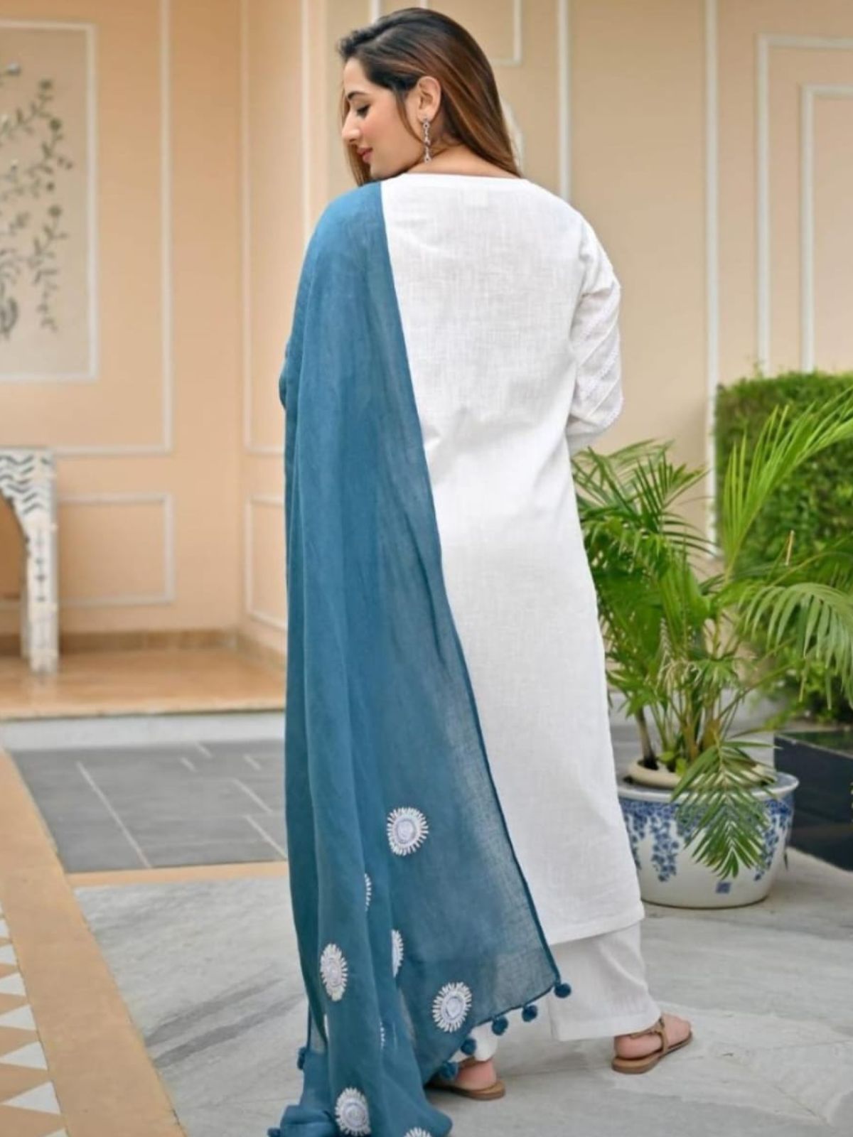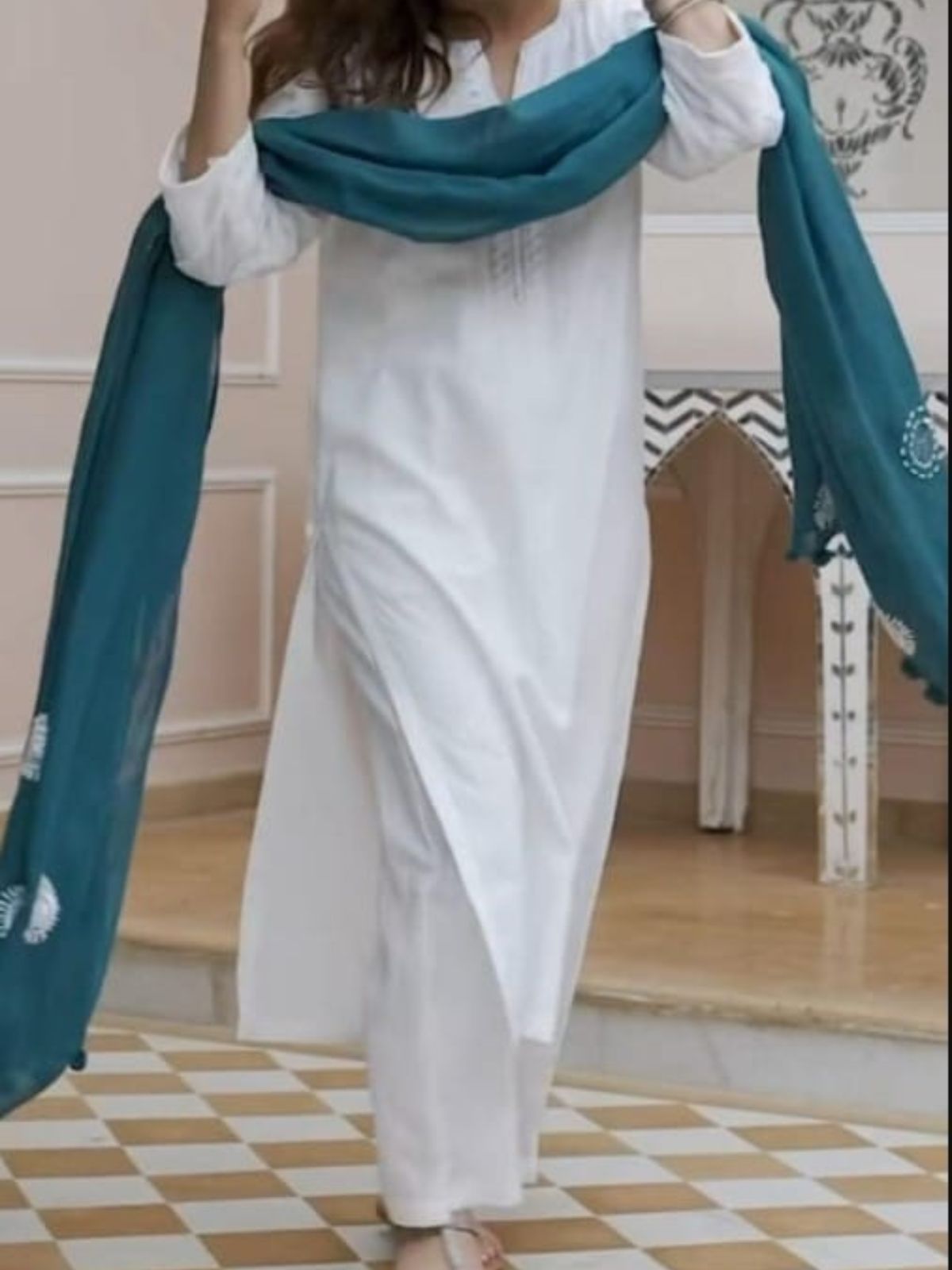 Enjoy your day with our amazing front embroidery work soft cotton slub kurta pant with dupatta. With trendy colour and Stylish look this set is perfect for your wardrobe.