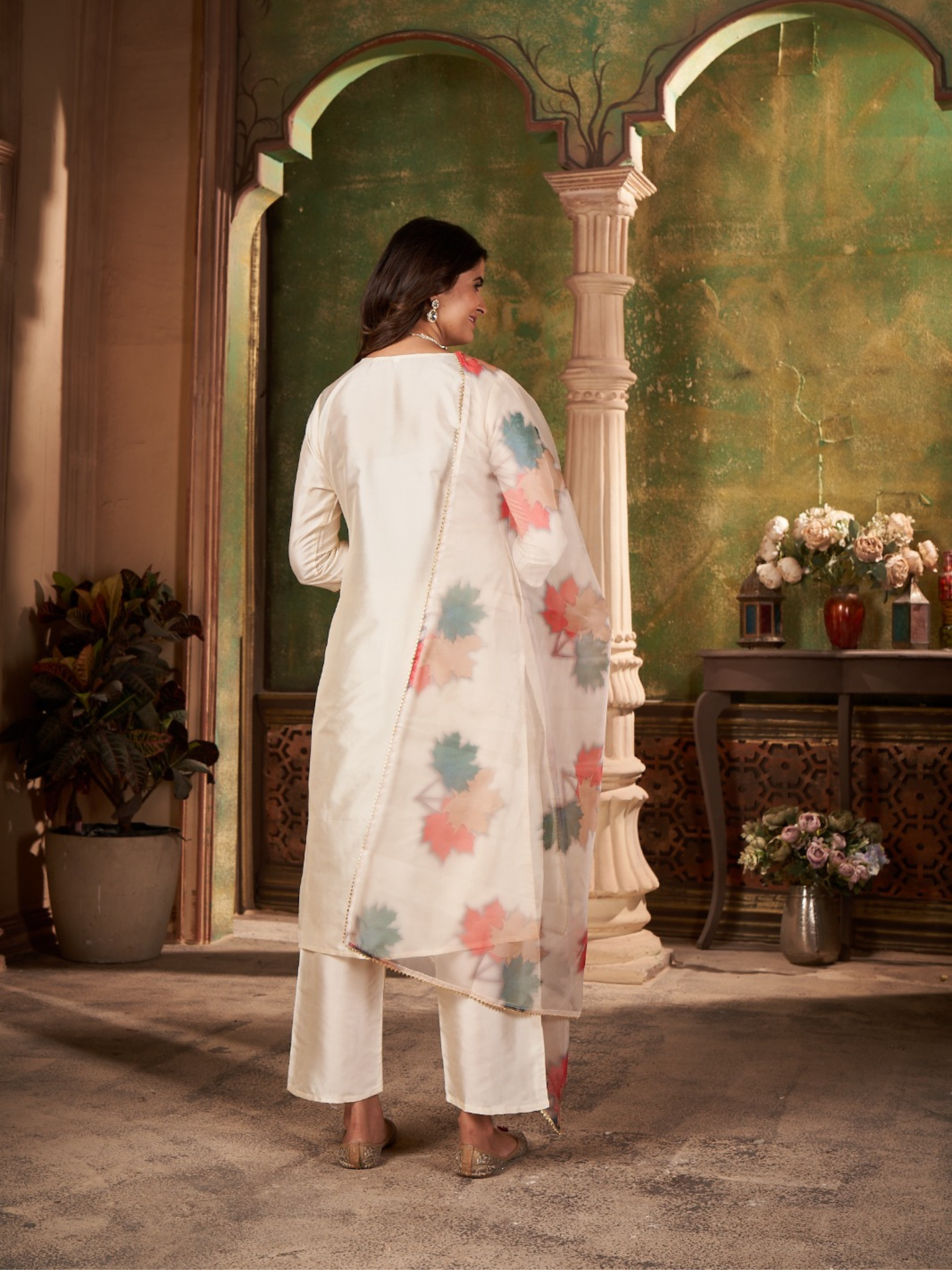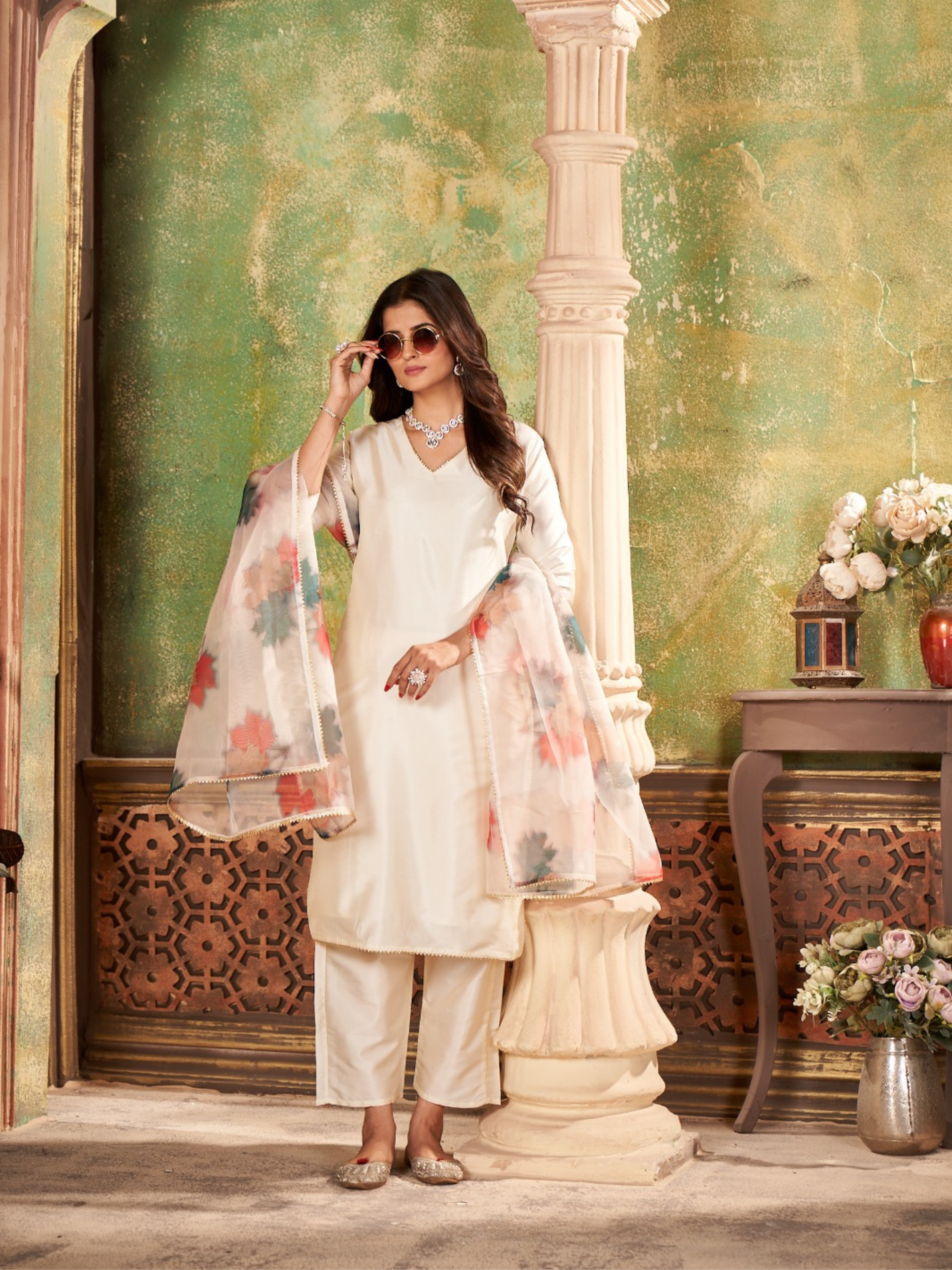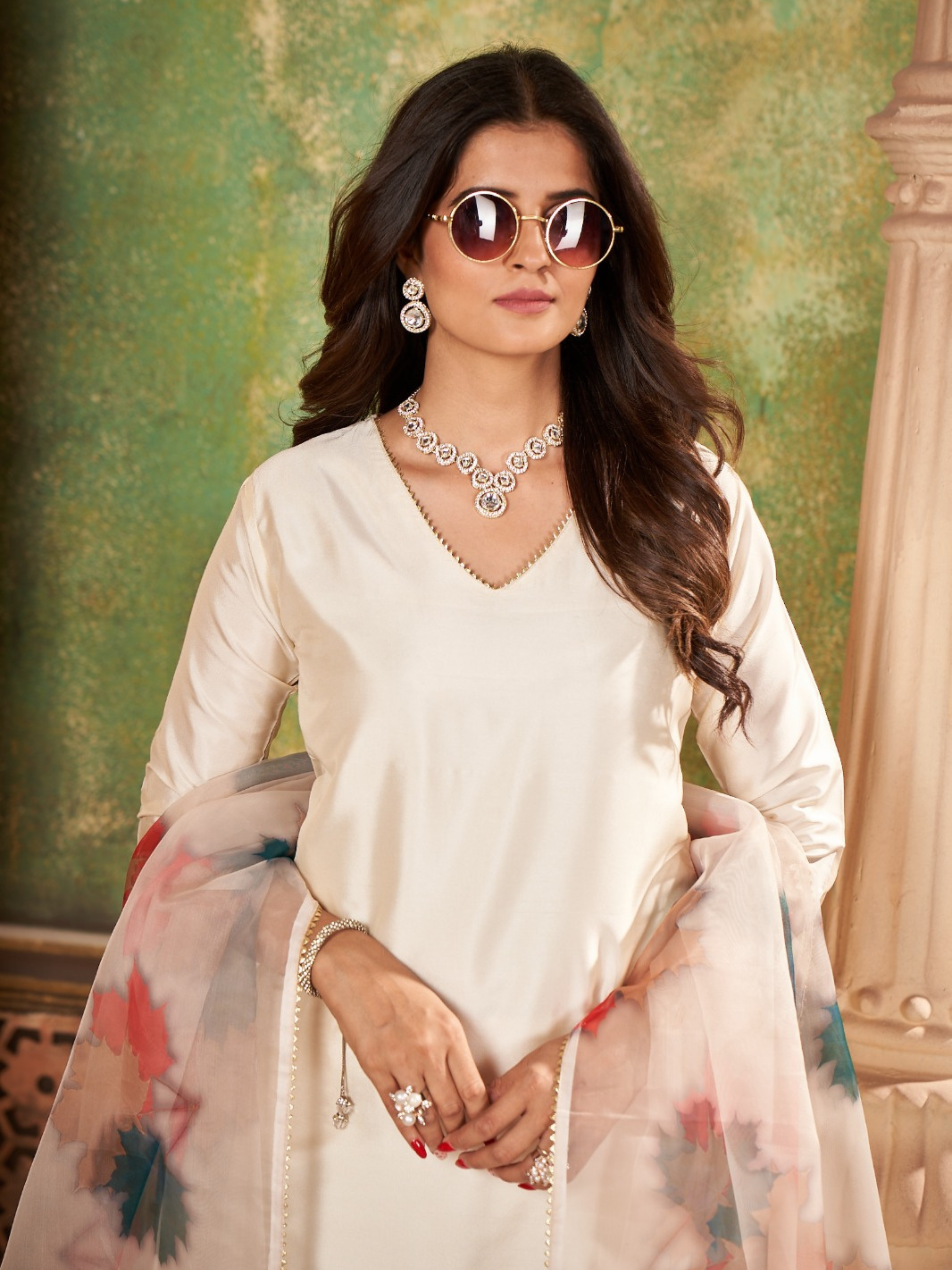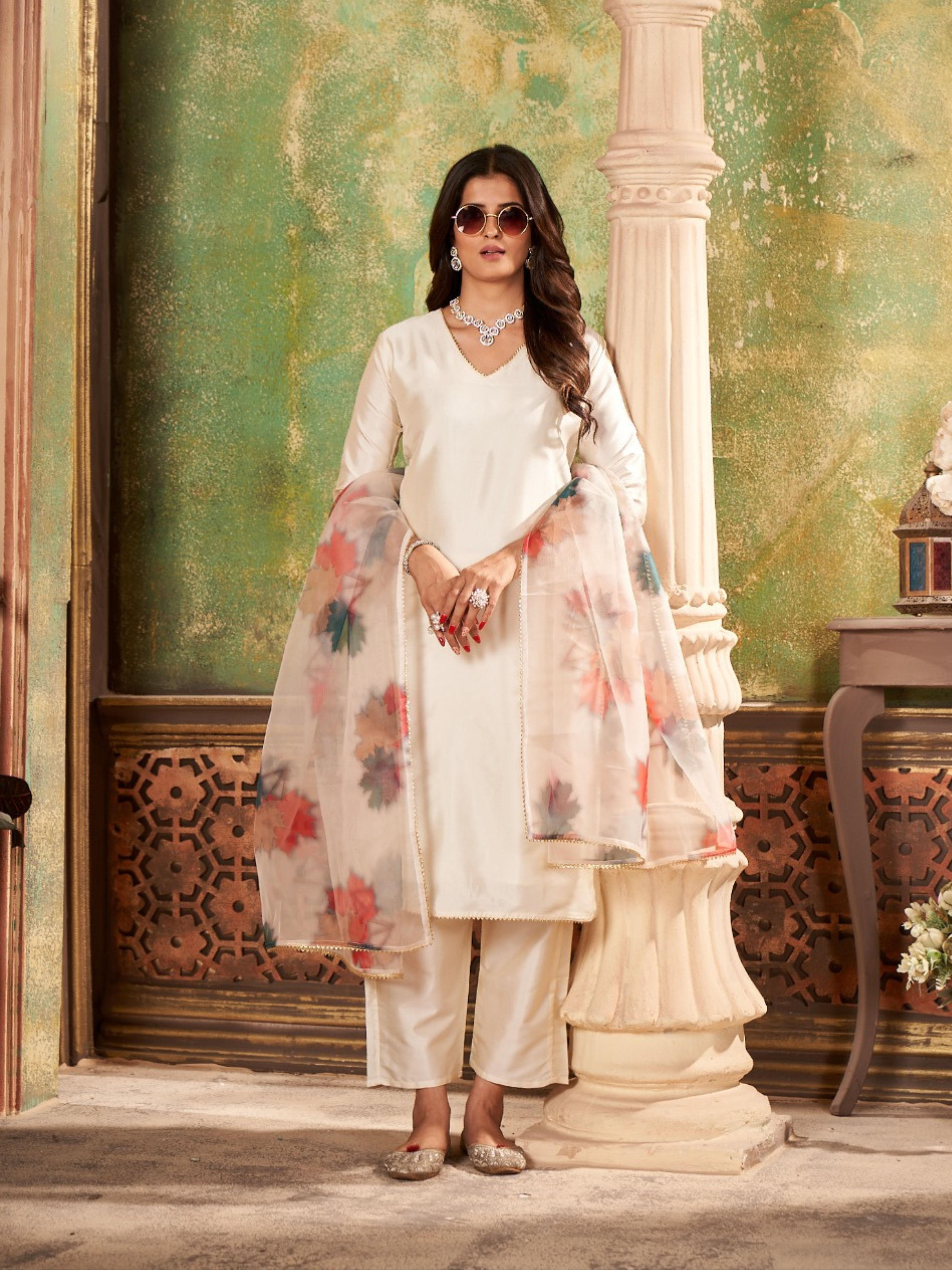 Beautiful stunning cotton silk fabric straight kurti pant with organza dupatta. Look like a princess this festive season in this gorgeous outfit. Pair it with heels for a lovely look.