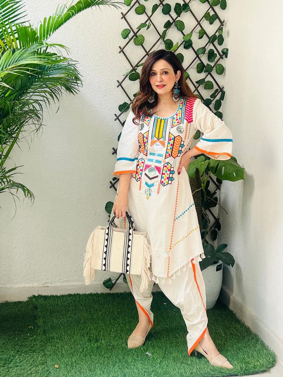 New in festive embroidery work kurta dhoti set. Get your hands on our beautiful off-white kurti with intricate thread embroidery work less work mirror work detailing in bright tone perfect for any auspicious occasion.