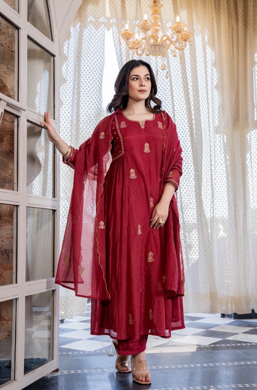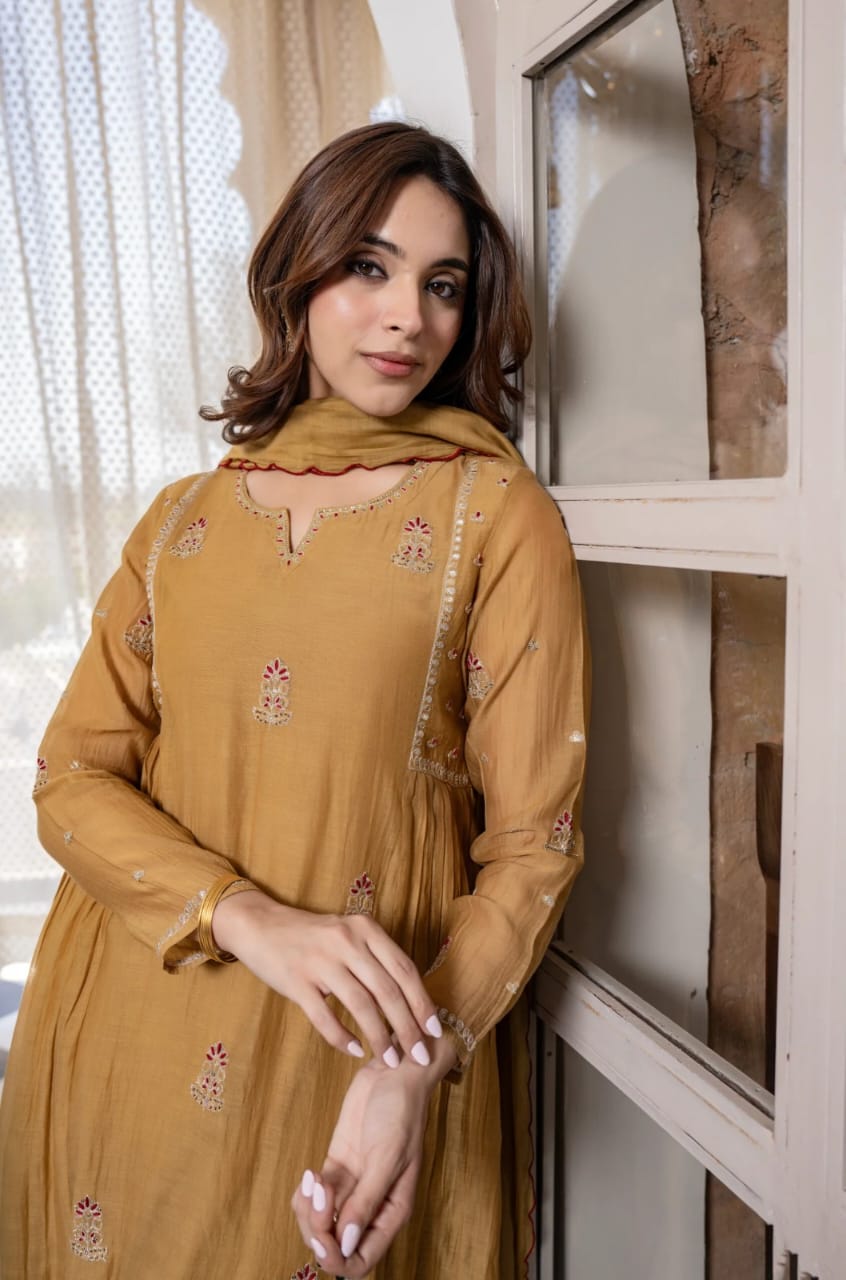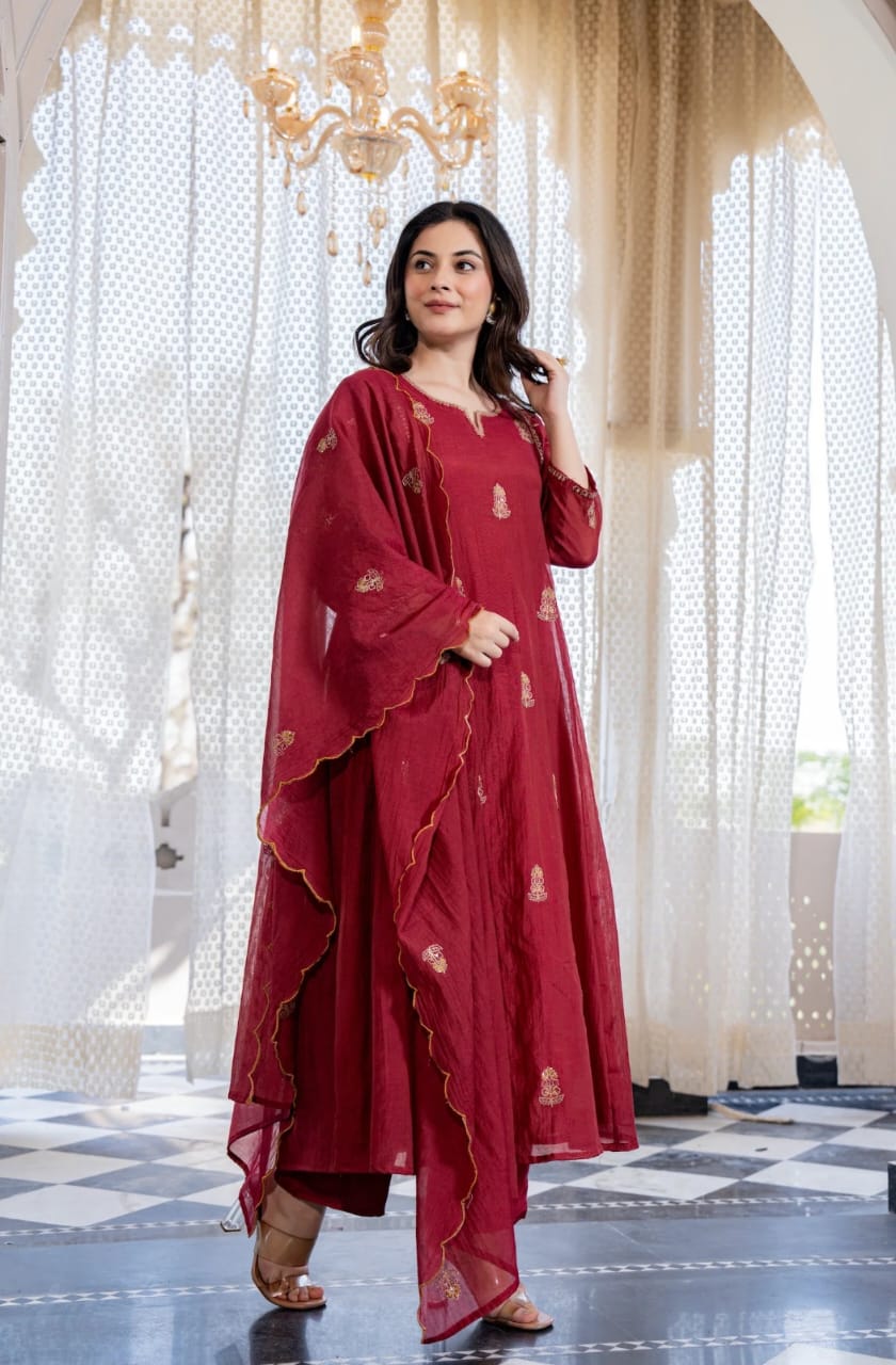 Elevate your style with the Grace Anarkali Outfit. Made from high-quality mil chanderi fabric, this elegant anarkali outfit exudes grace and sophistication. Its flowing silhouette and intricate design are sure to make you stand out at any occasion. Upgrade your wardrobe with this timeless piece which has a beautiful embroidery