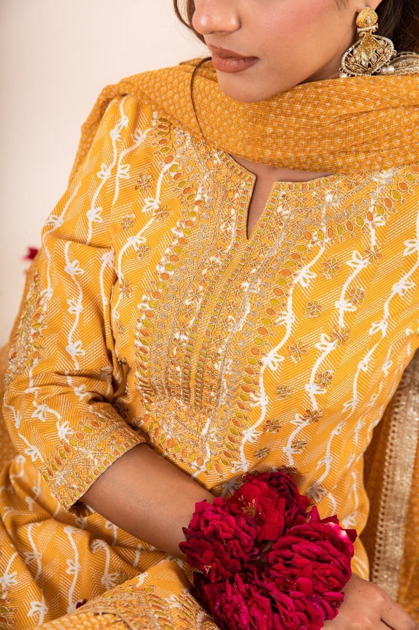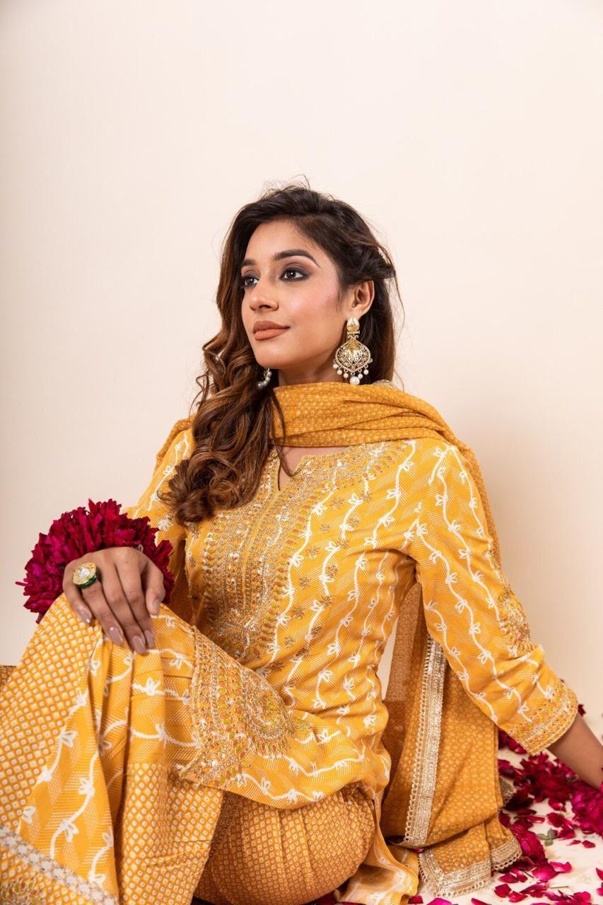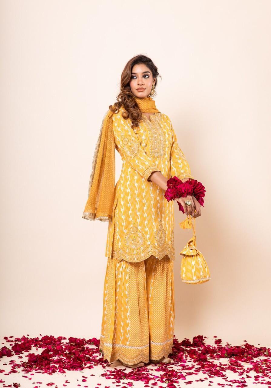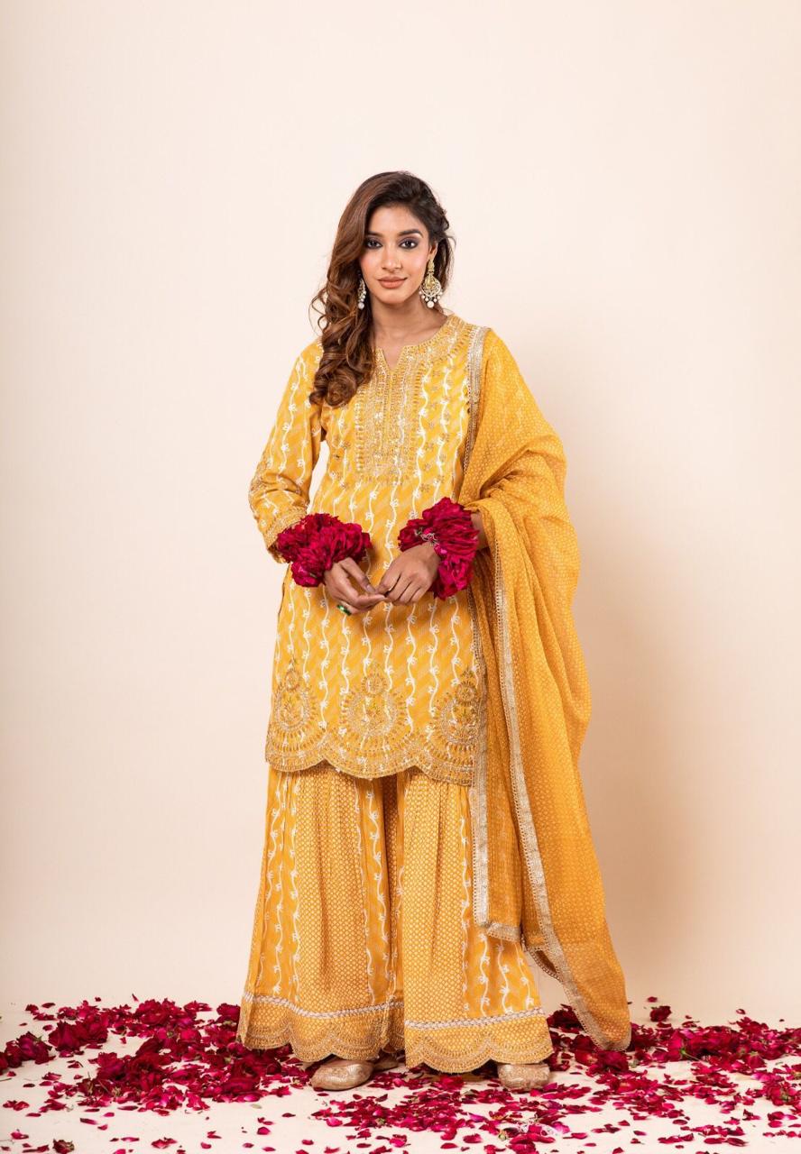 With heavy zari and embroidery work with ultimate finish on yoke sleeves hemline and on sharara.