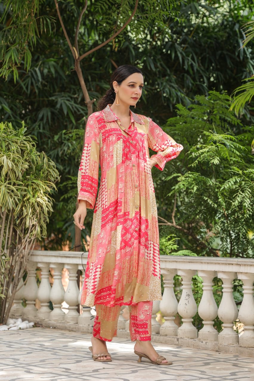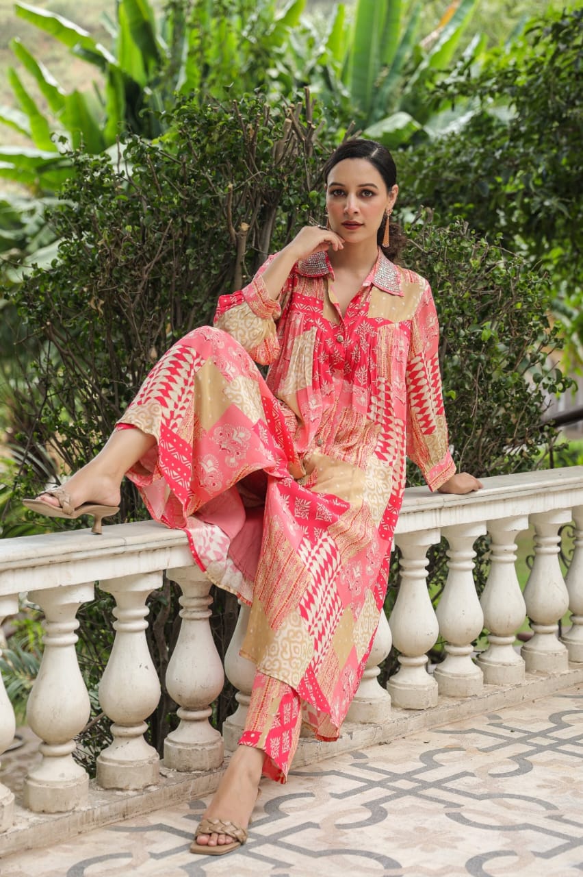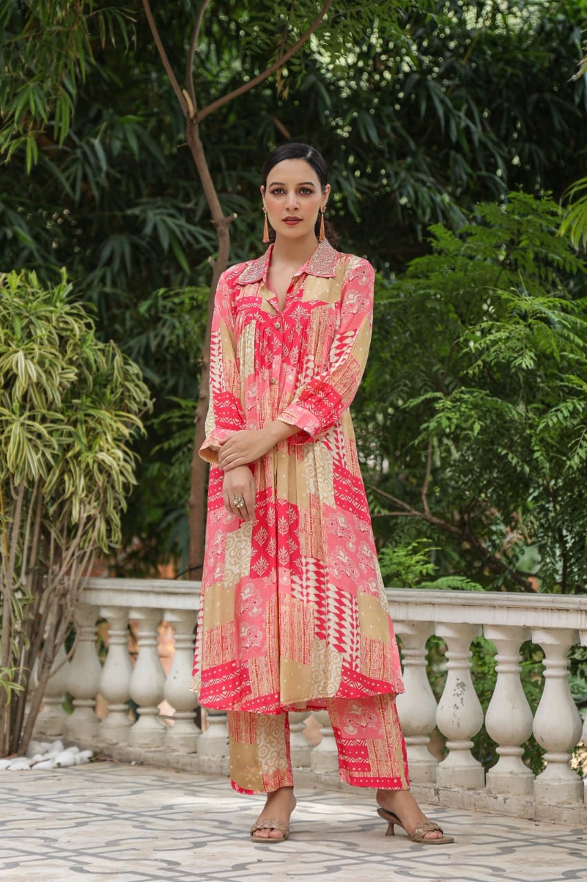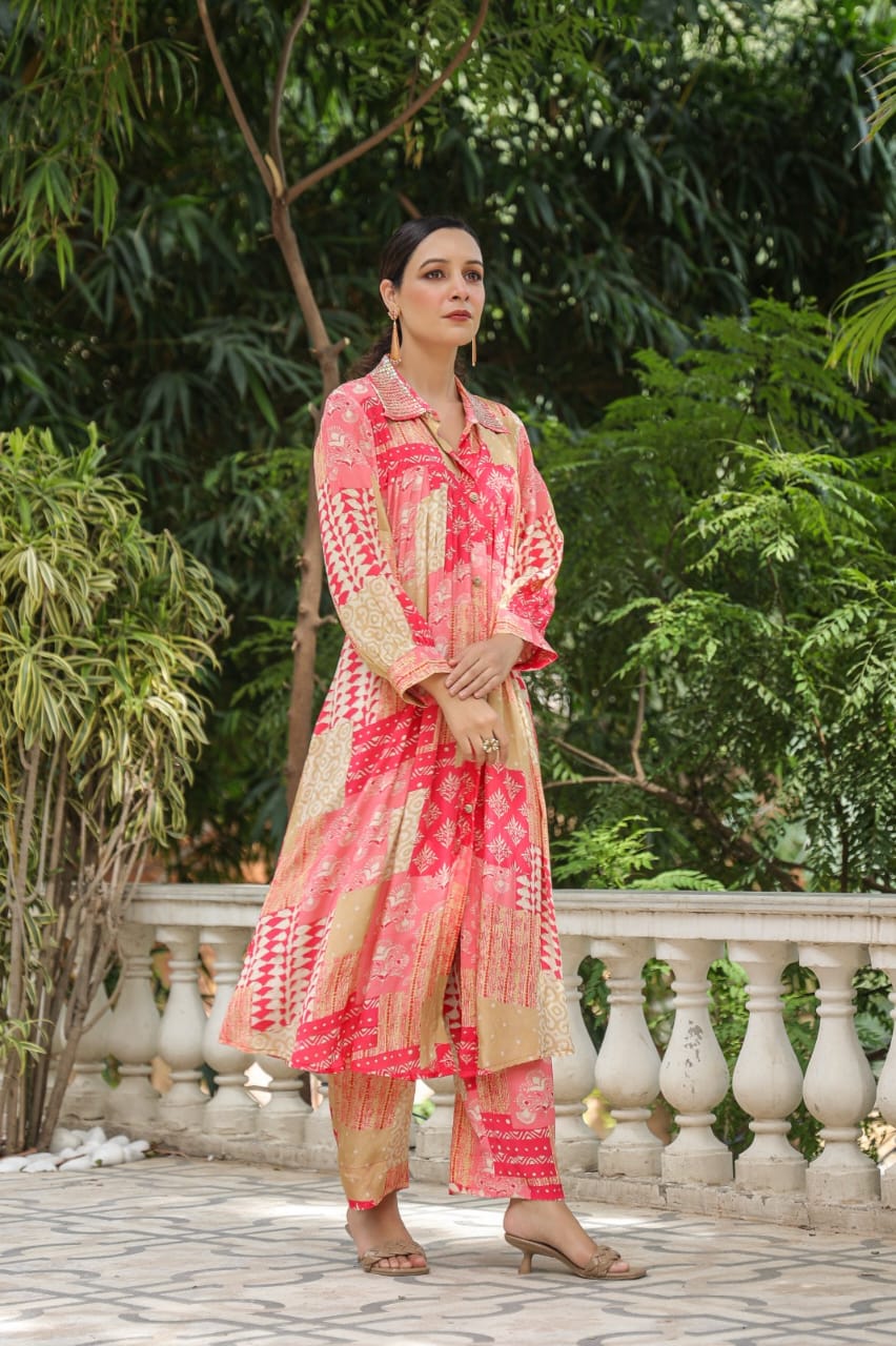 Get ready in this beautiful and Gorgeous kurta paired with matching pant made in digital print muslin fabric with elegant hand work on collar.