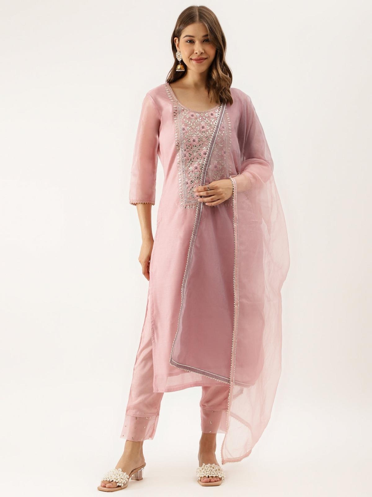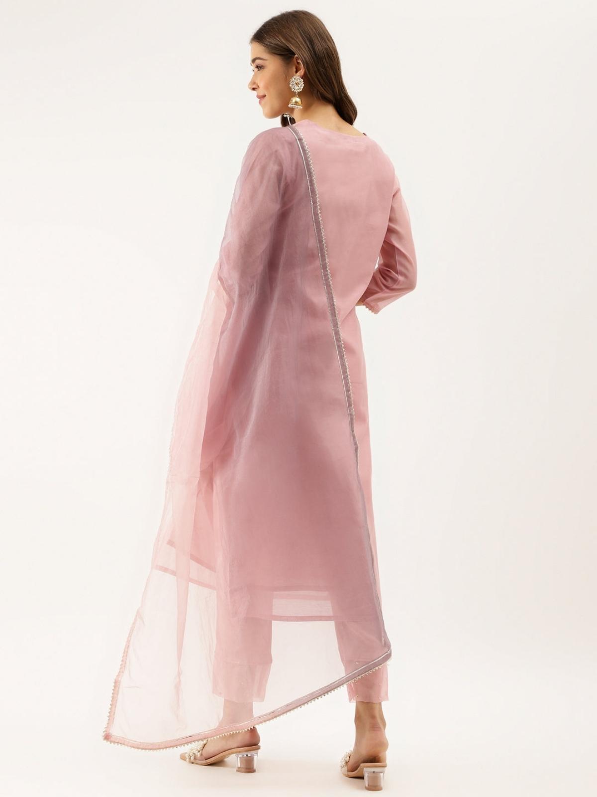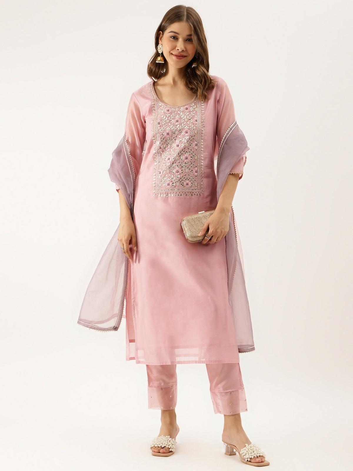 Pink Embroidered Chanderi Kurta With Trouser & Organza Dupatta