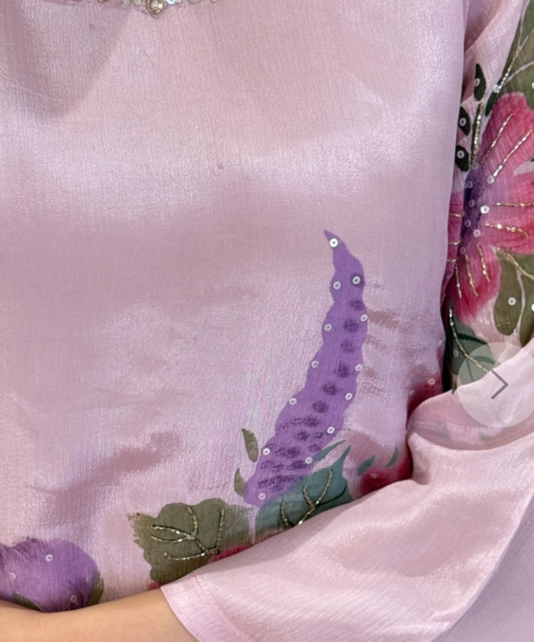 Fabric pure chinnon with cotton lining kurta with hand work & Paired with muslin pant and nazneen chiffon hand painted duppata with tassels