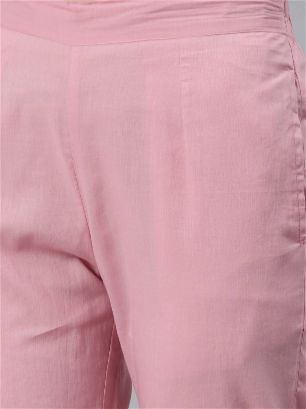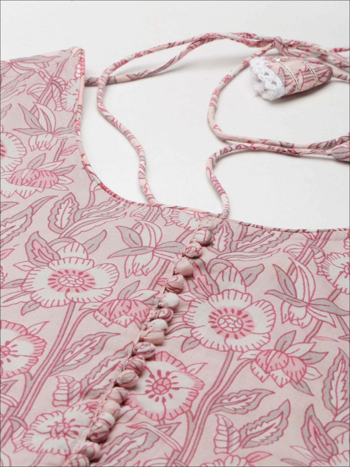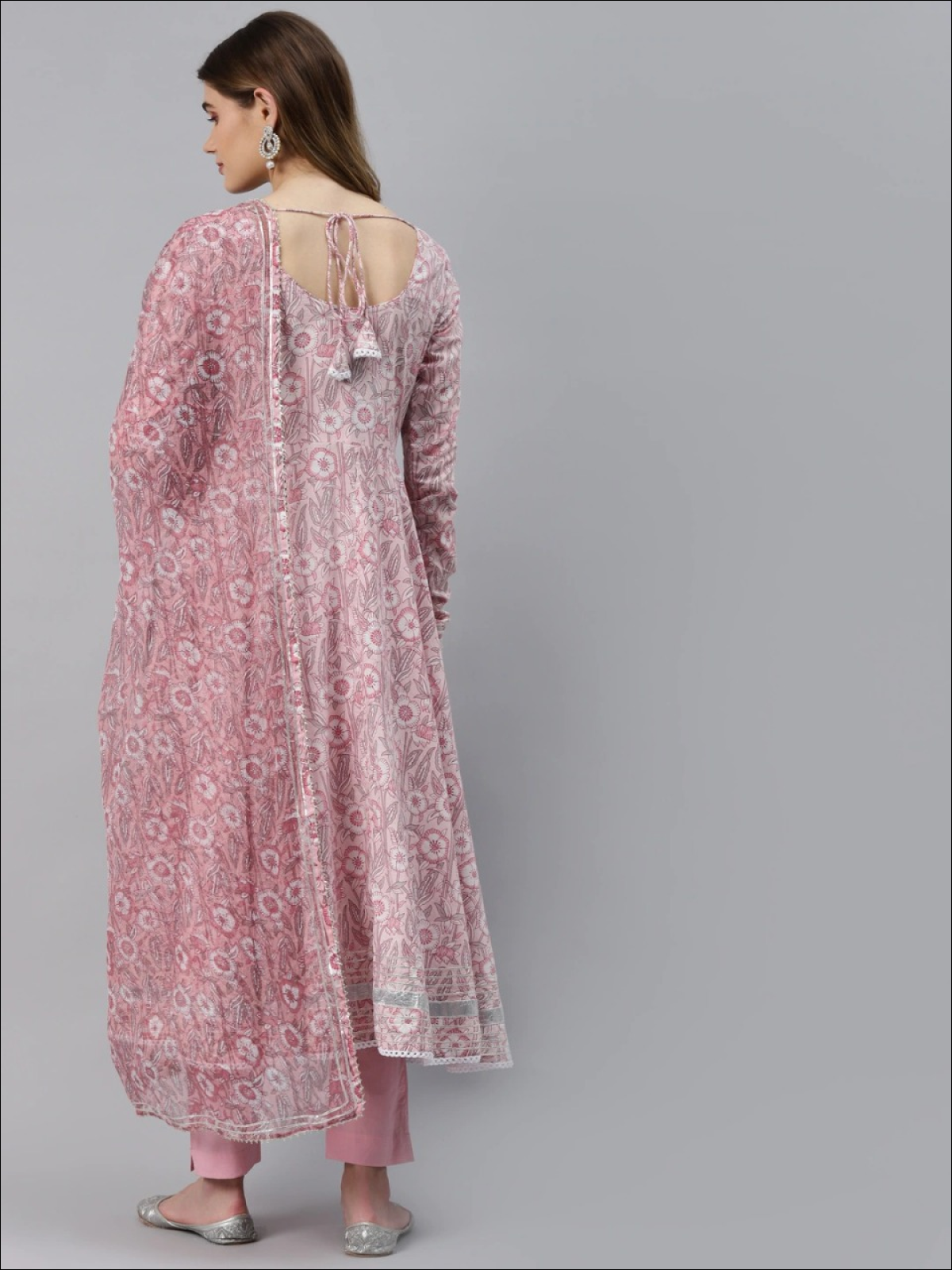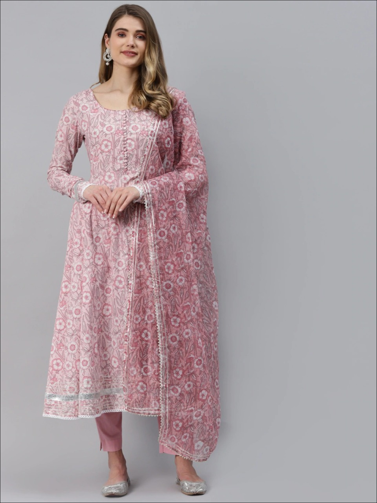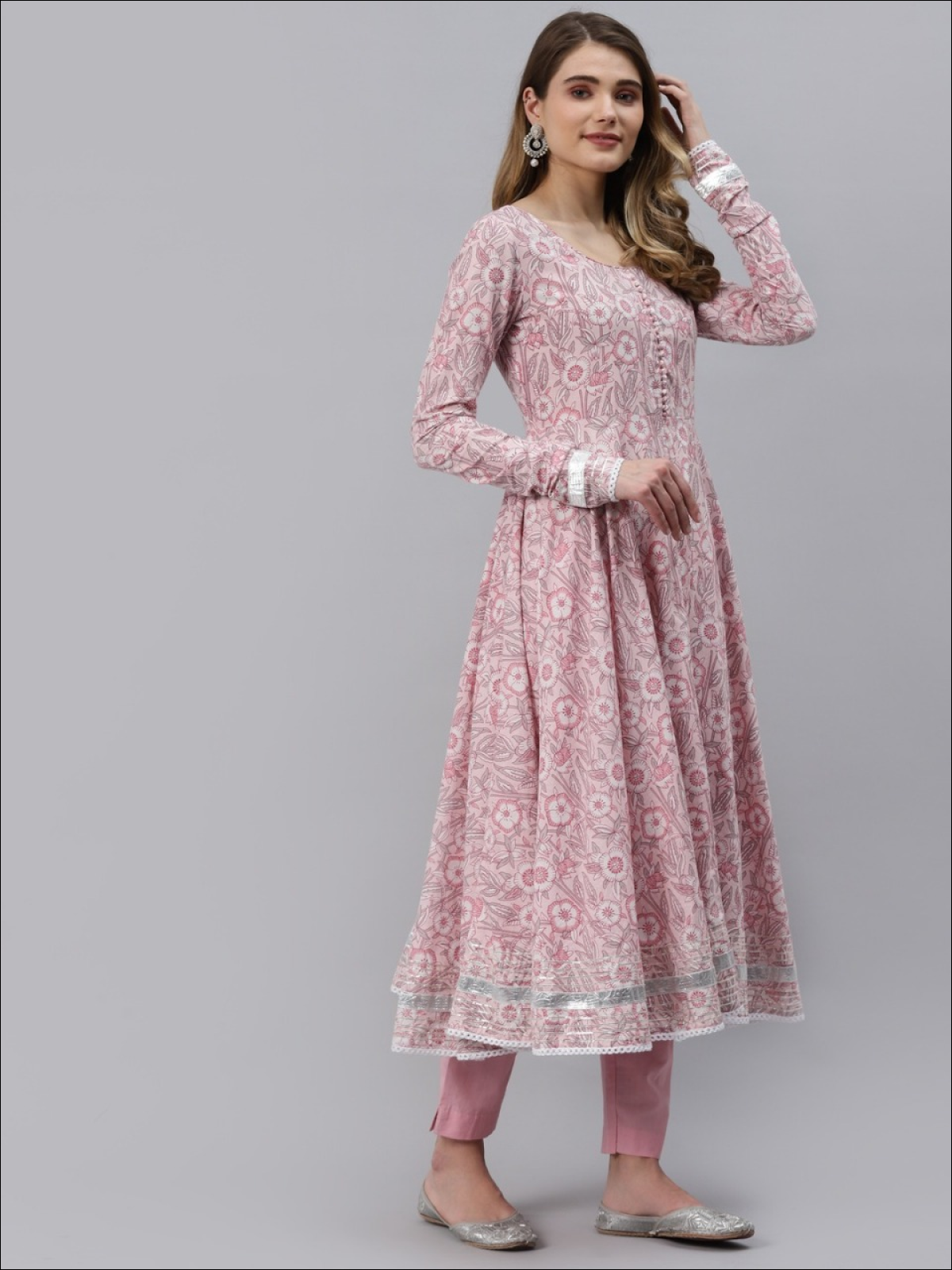 Women pink floral printed gotta patti pure cotton anarkali kurta set