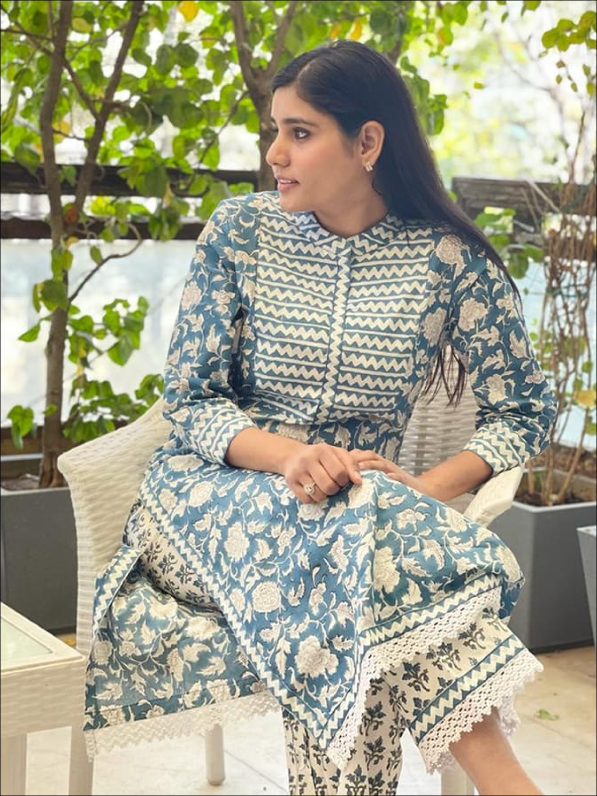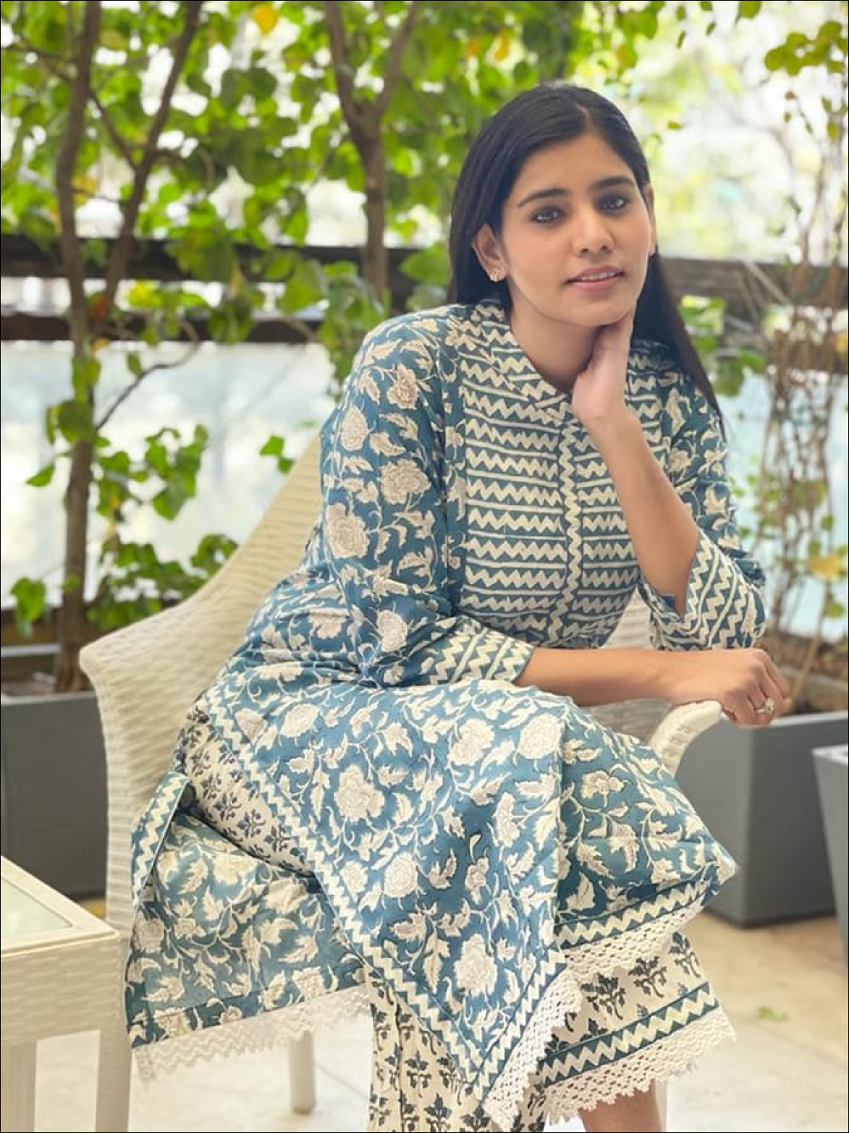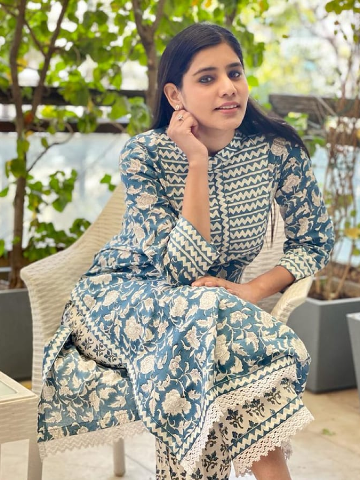 Look gorgeous in this printed cotton lace work set. Trendy and comfortable,this outfit is perfect for your every day wear.