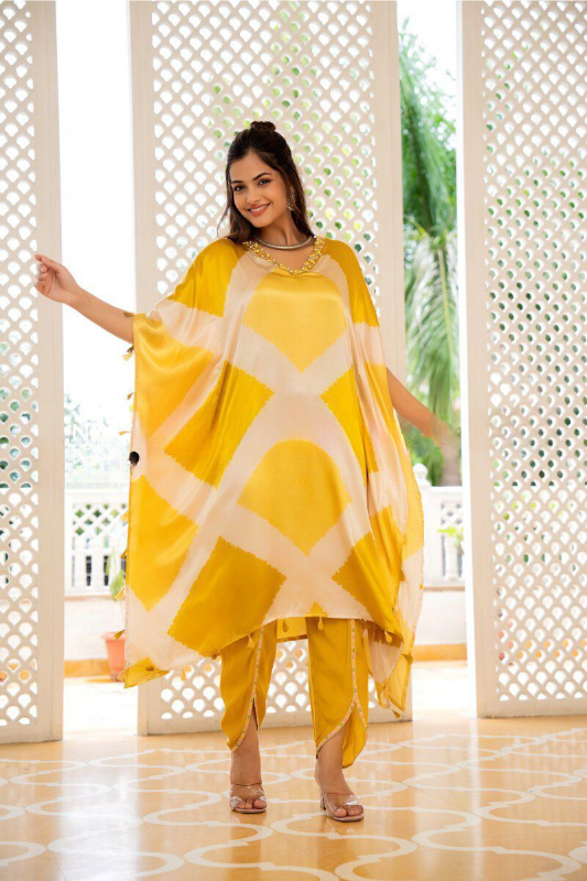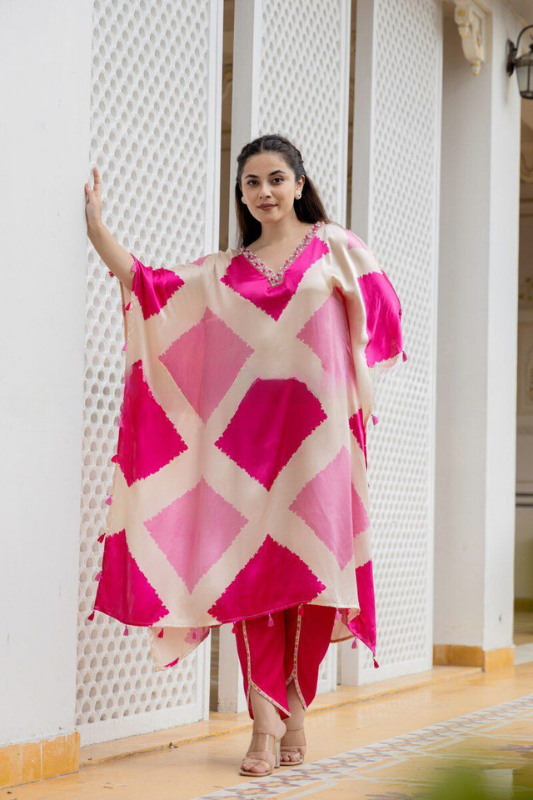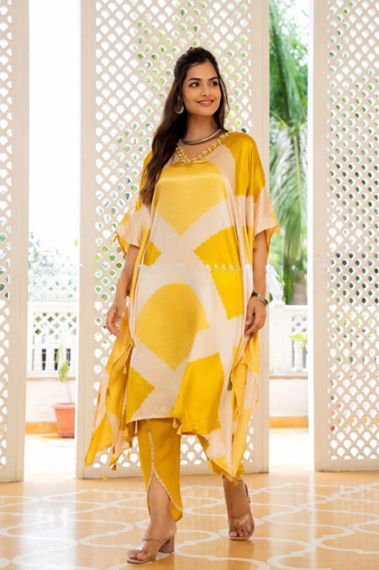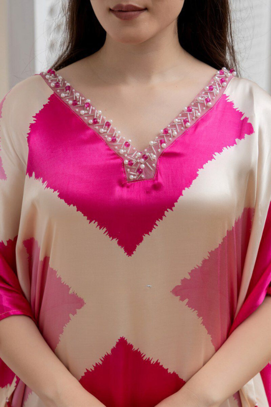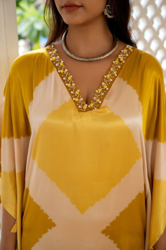 Premium silk kaftan with hand work on neck line detailed with tassels